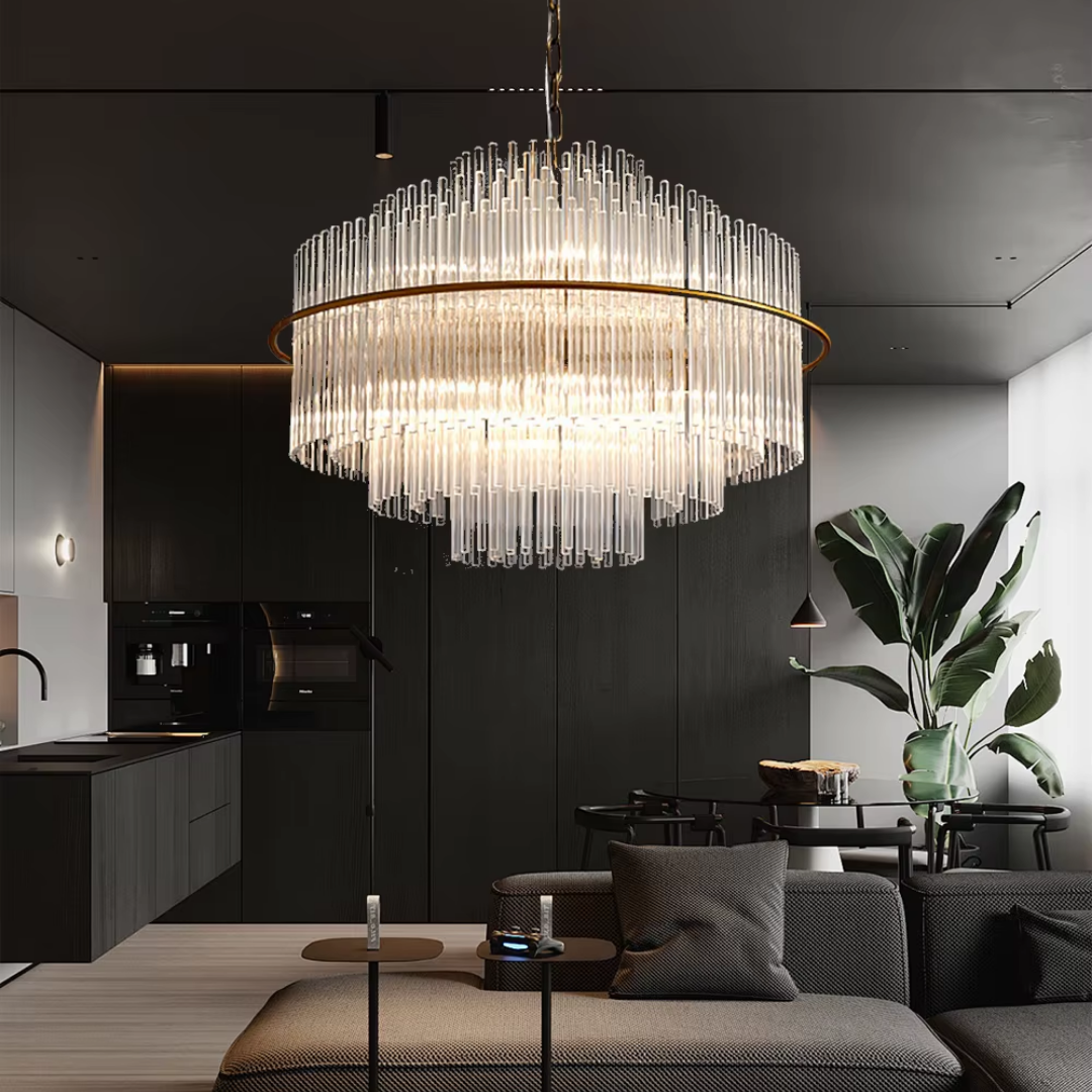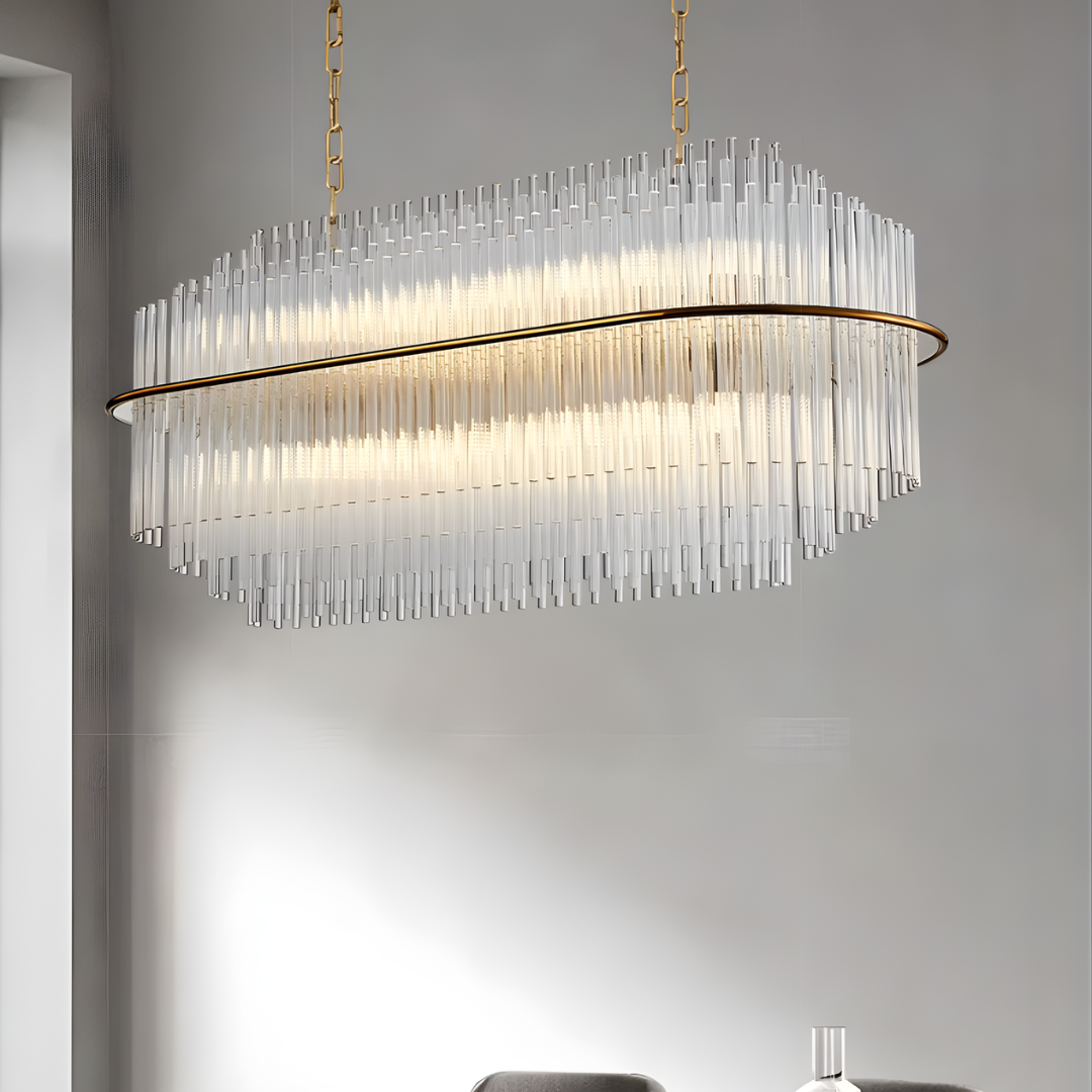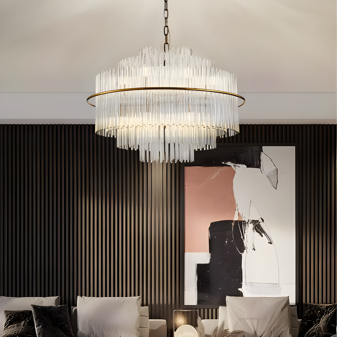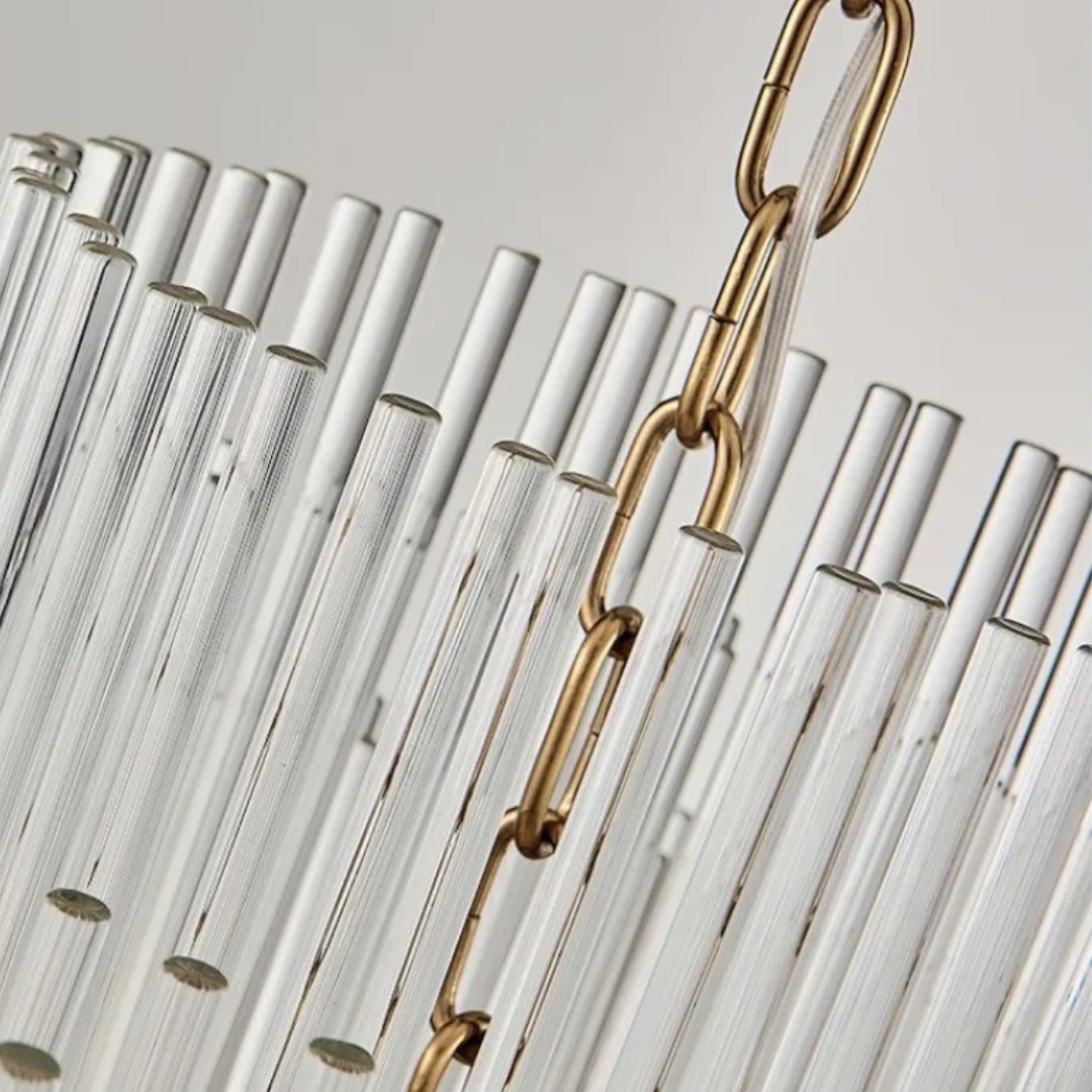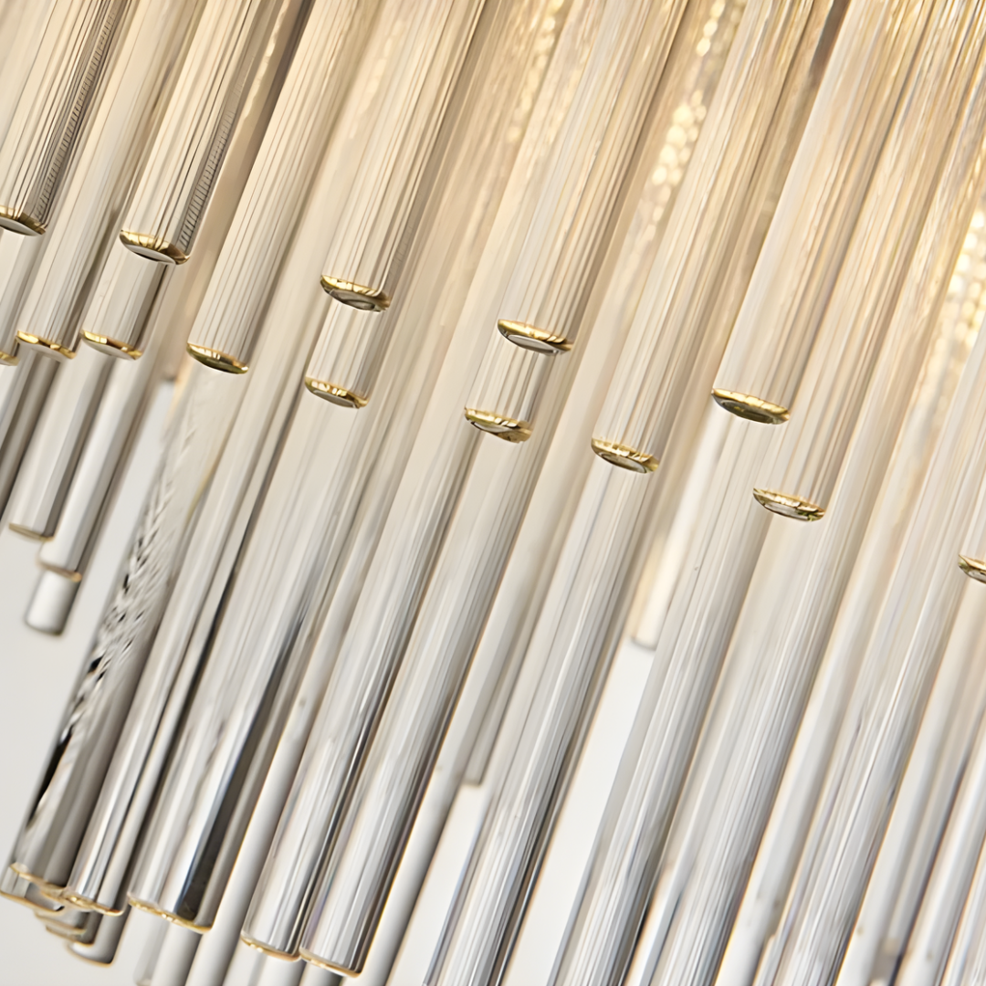Cascading glass rods and a polished metal frame create a radiant statement with timeless luxury and modern refinement.