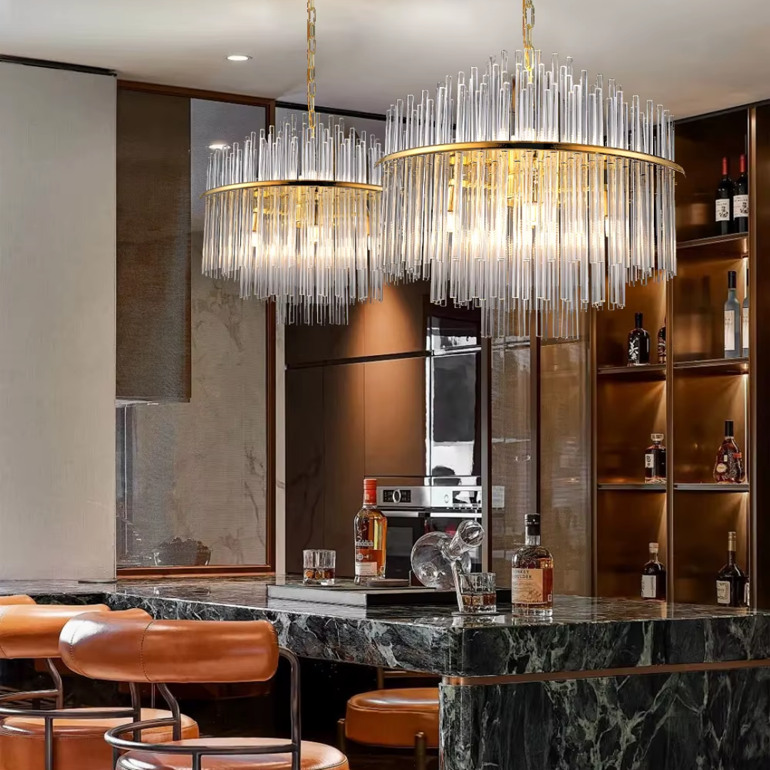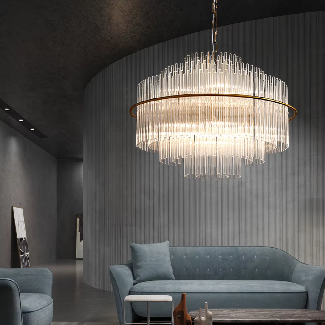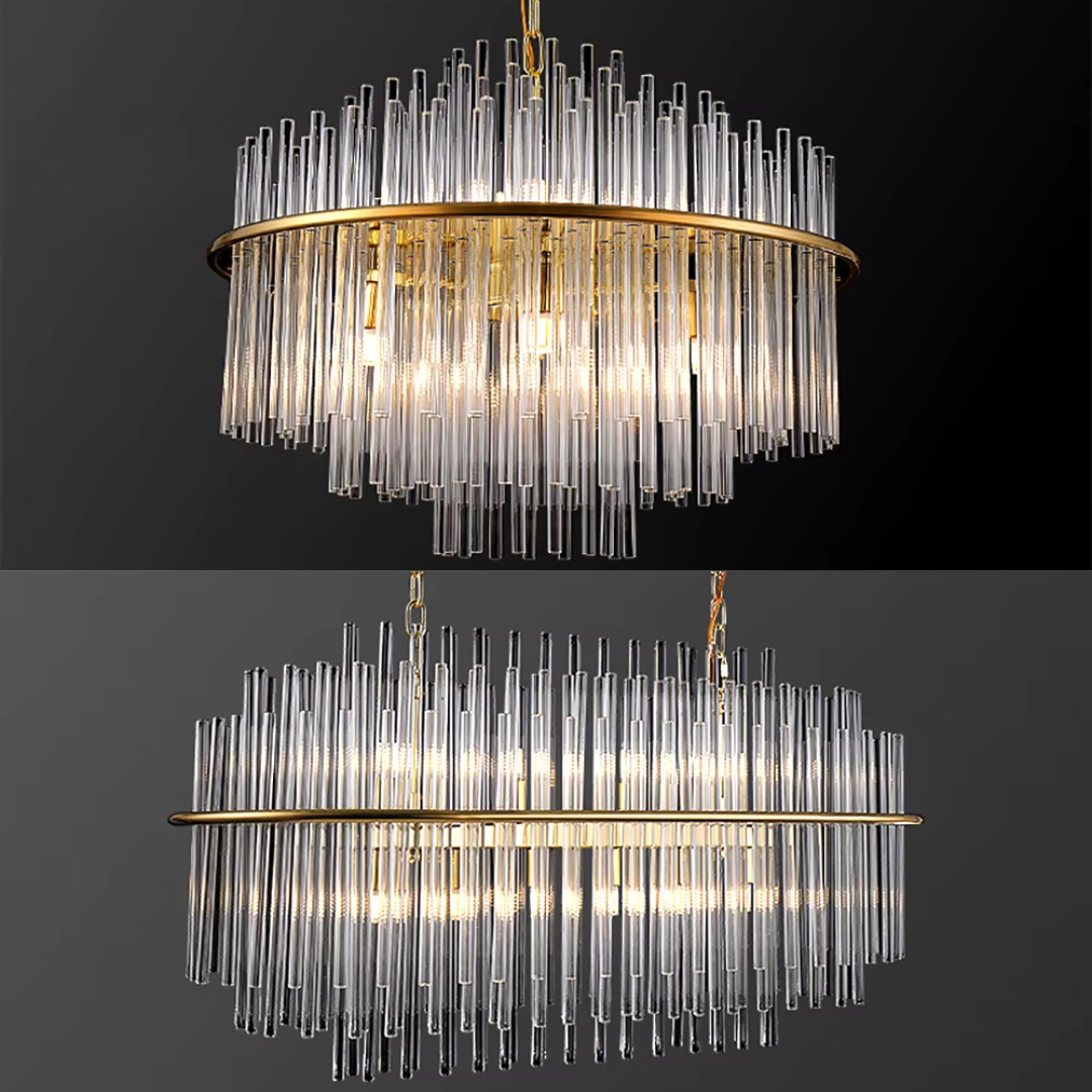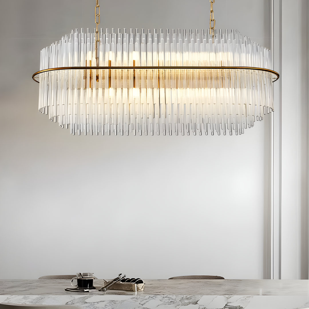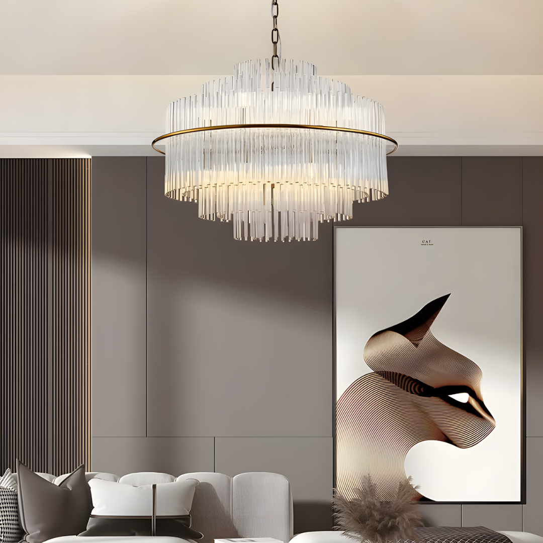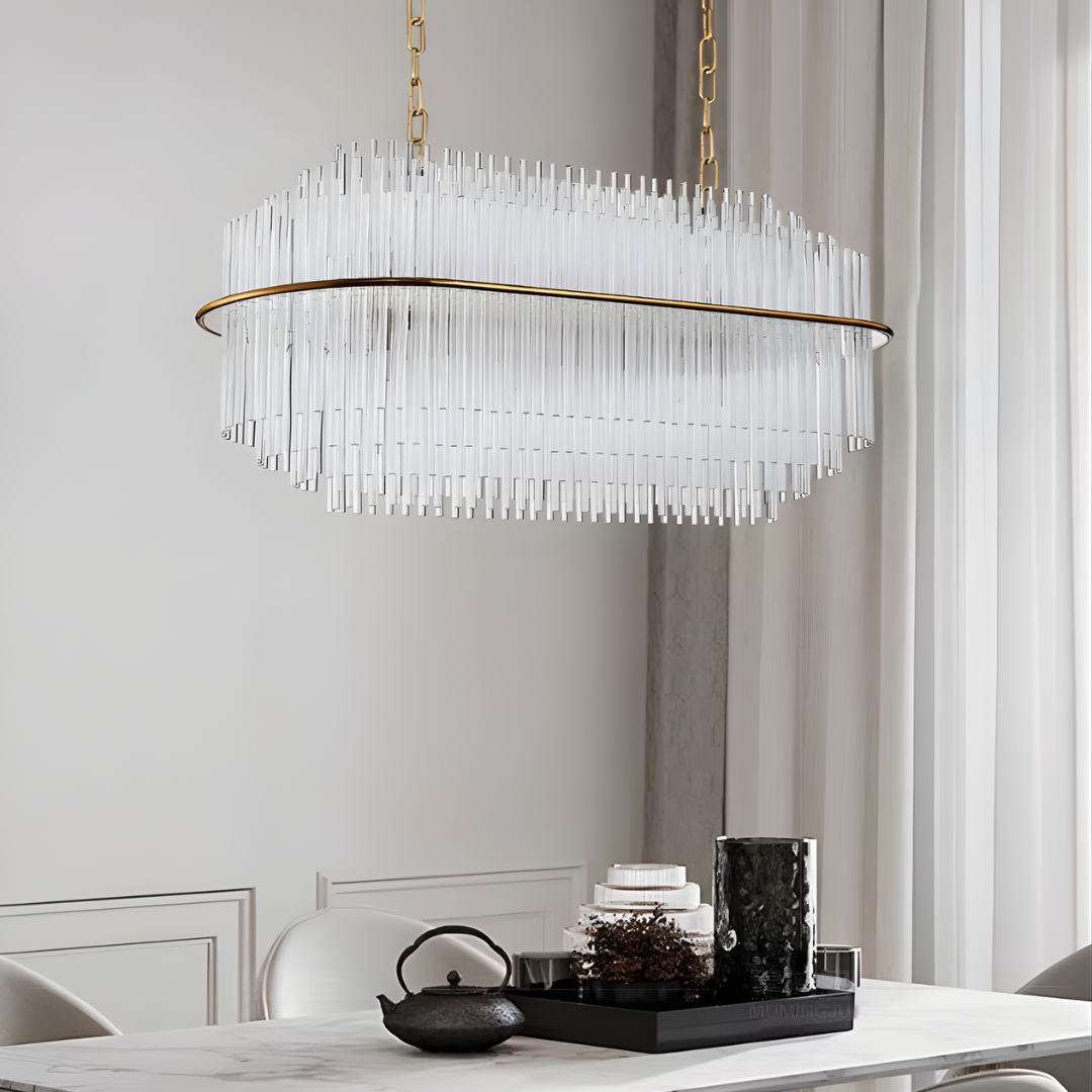 Cascading glass rods and a polished metal frame create a radiant statement with timeless luxury and modern refinement.