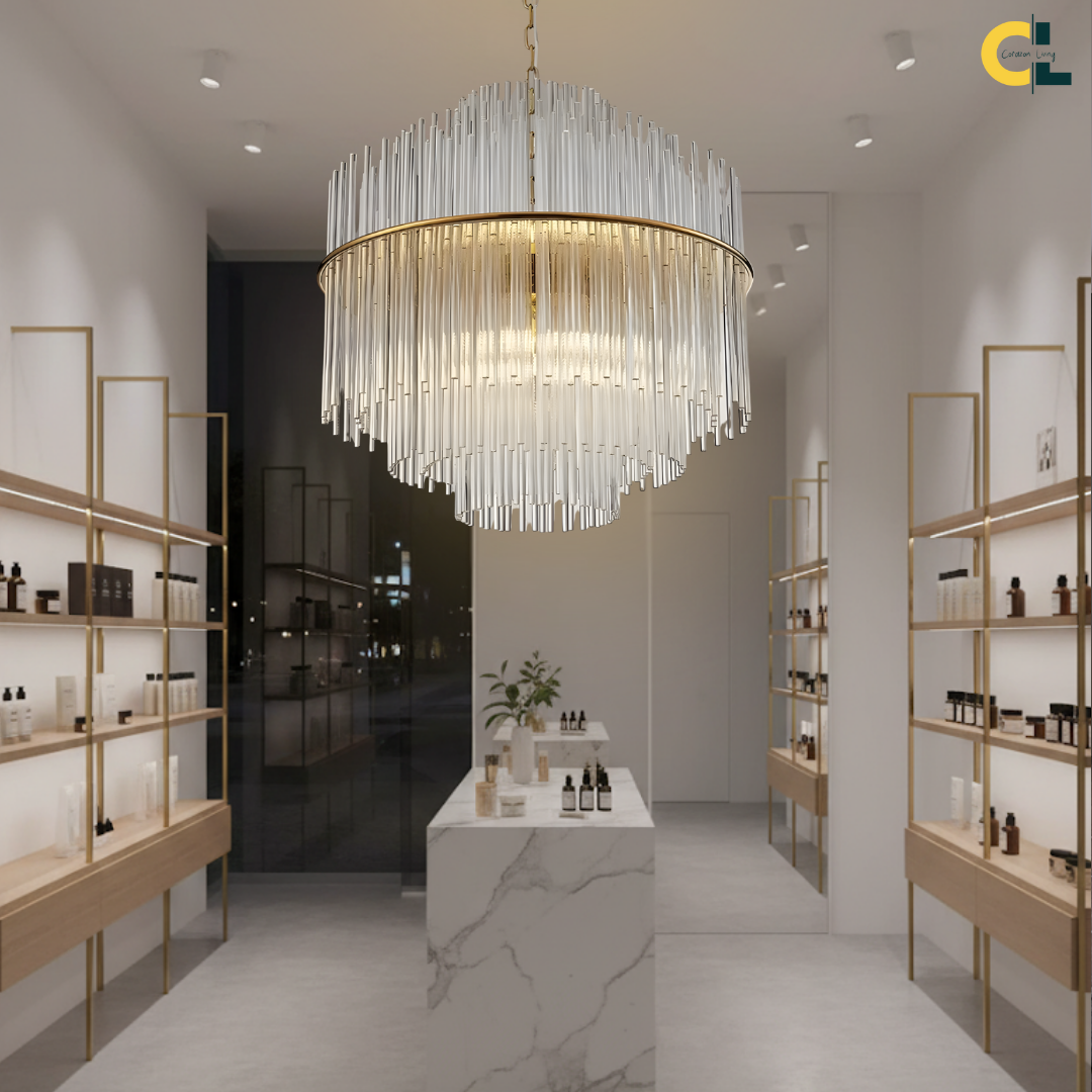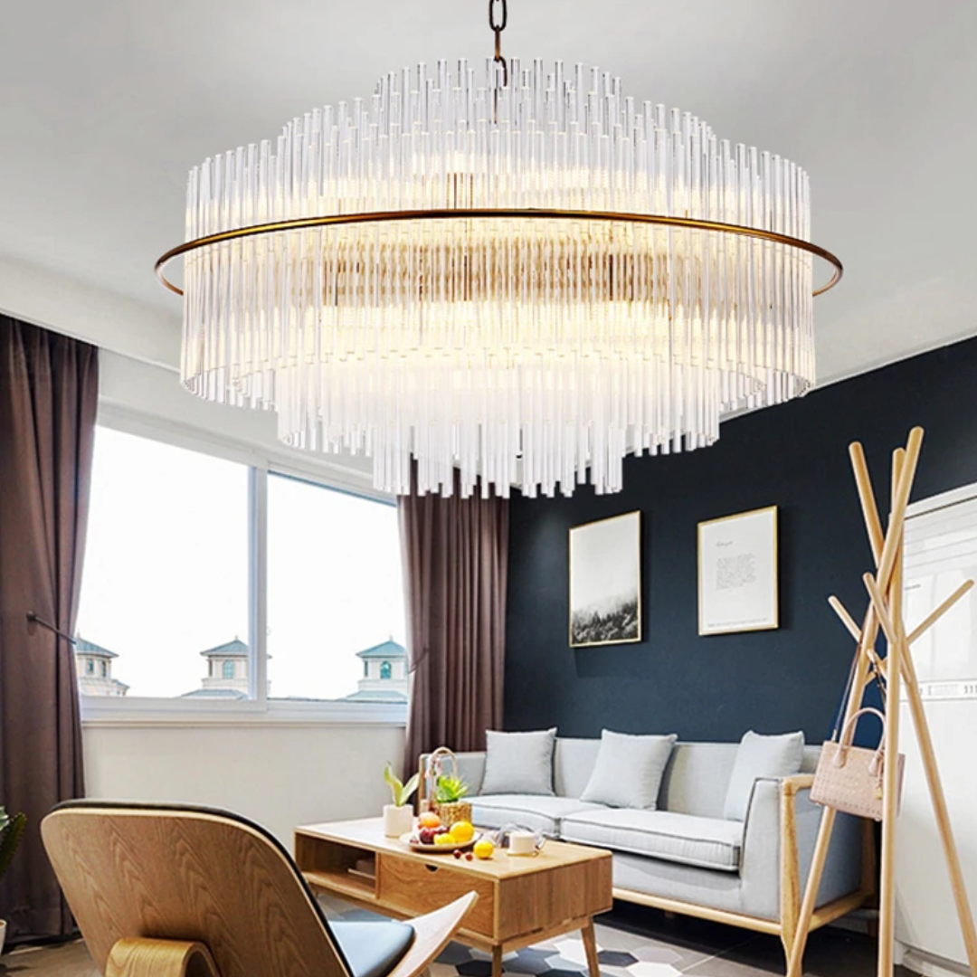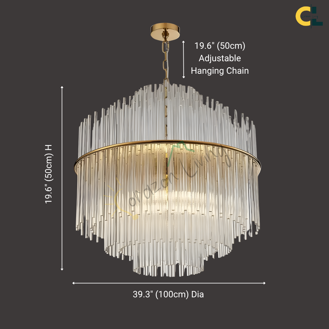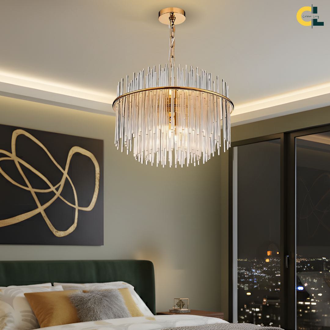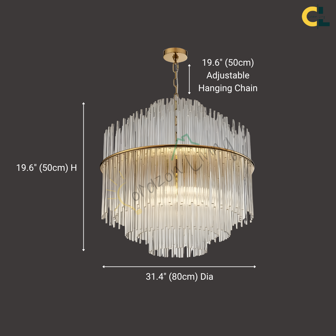 Cascading glass rods and a polished metal frame create a radiant statement with timeless luxury and modern refinement.