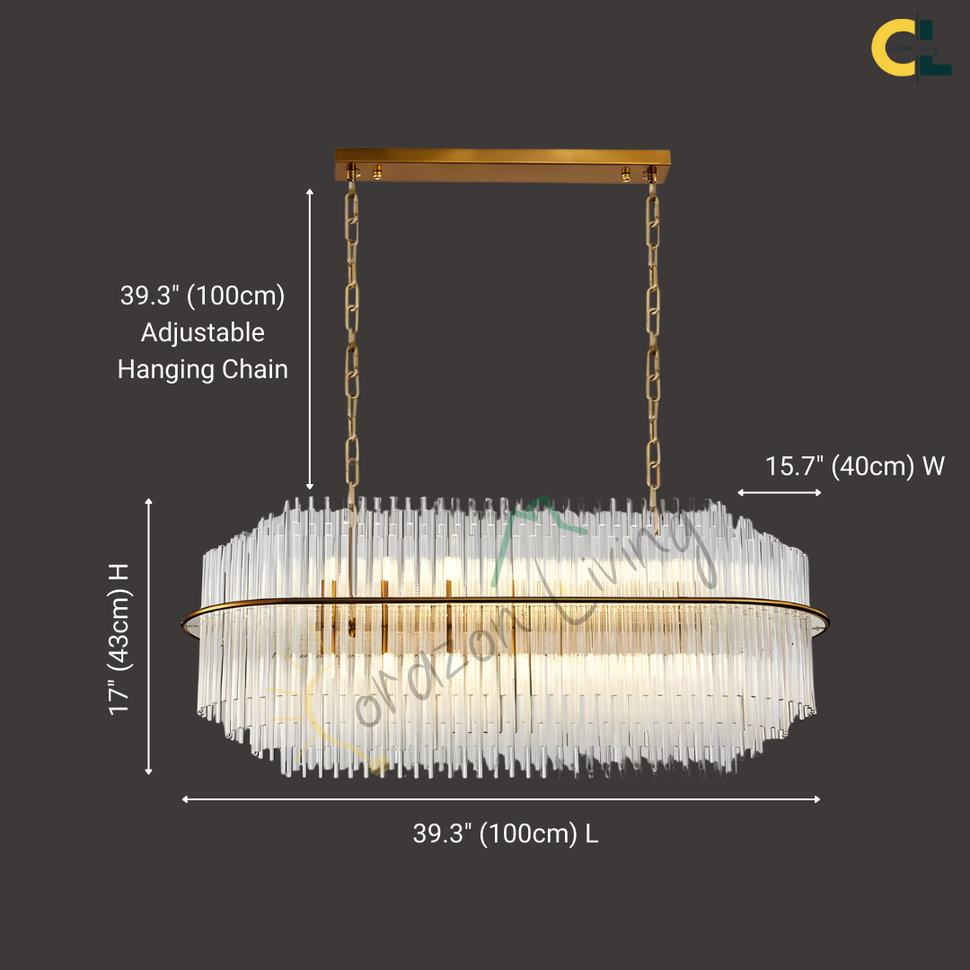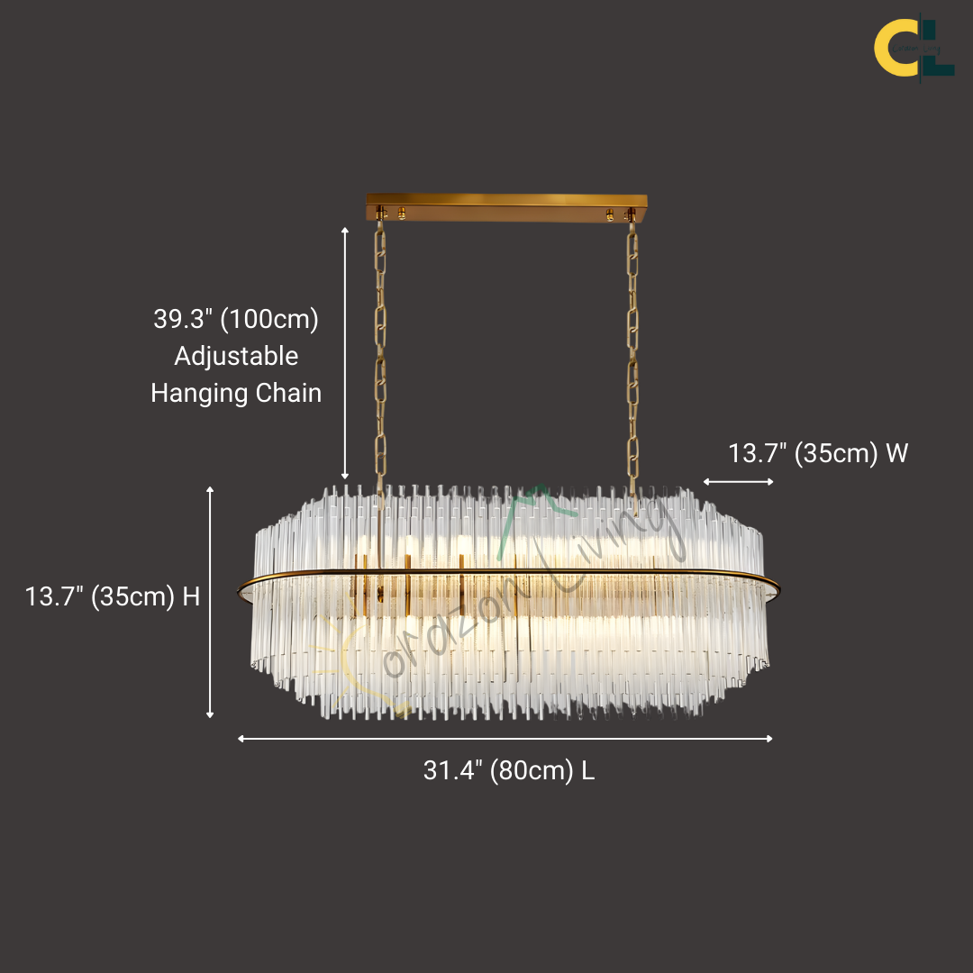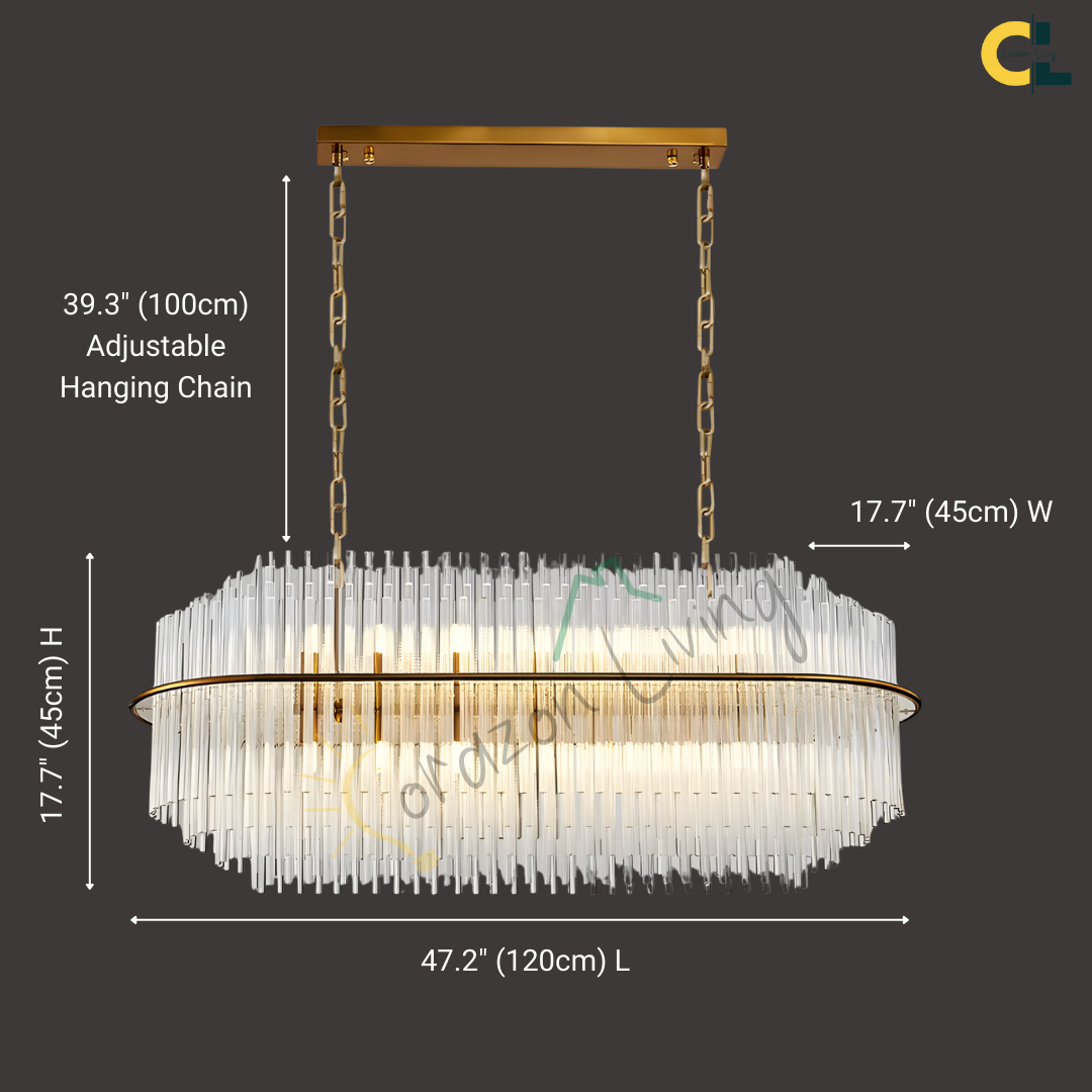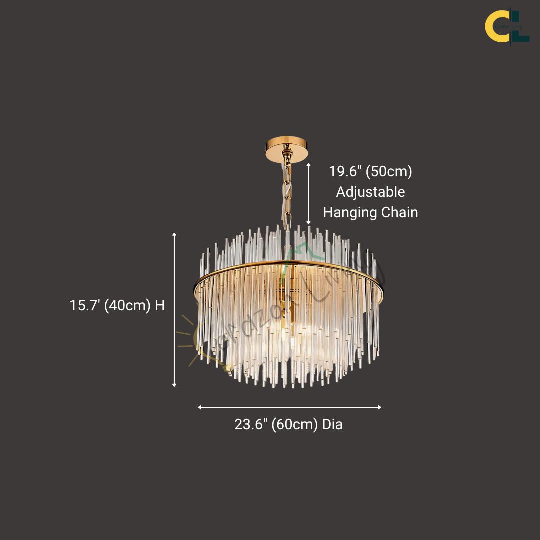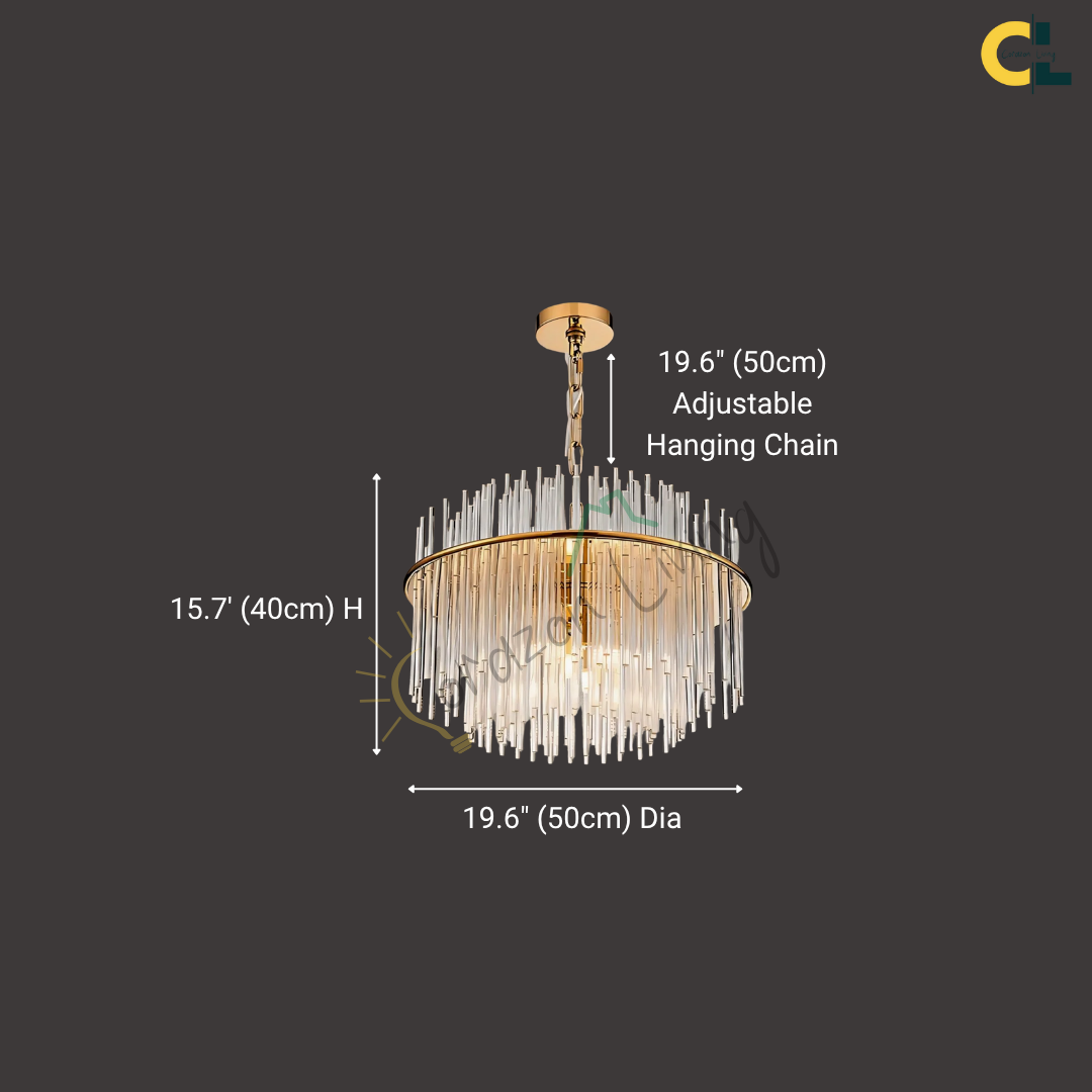 Elevate your space with the striking elegance of this Agatha Modern Glass in Gold or Silver Chains Chandelier, a luxury lighting centerpiece that blends timeless glass-inspired design with contemporary Nordic flair. Featuring a gold or silver-finished iron frame and cascading vertical glass rods, this statement fixture creates a shimmering halo effect when illuminated. Designed to accommodate G9 LED bulbs, it offers bright yet soft lighting, ideal for living rooms, dining areas, kitchens, foyers, or even boutique commercial spaces. Perfect for both modern and transitional interiors, this chandelier adds a sophisticated, high-end touch to any room.