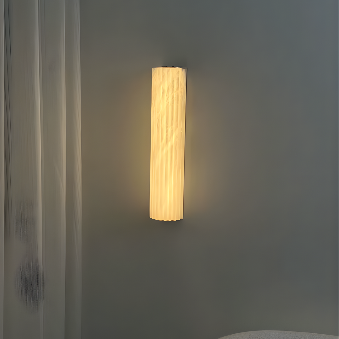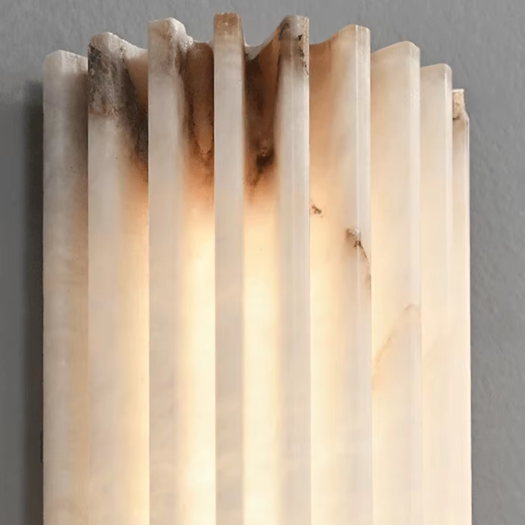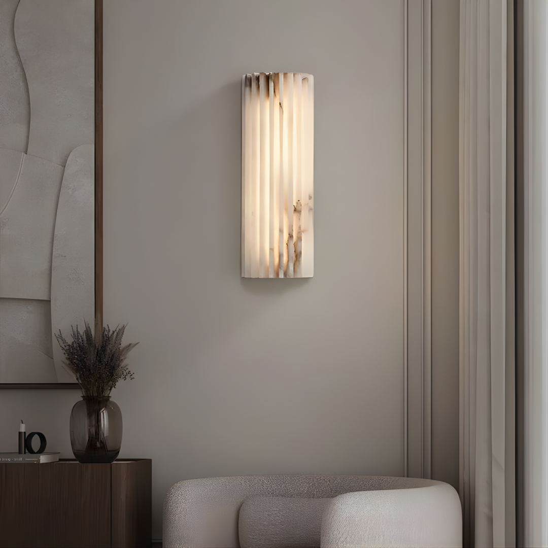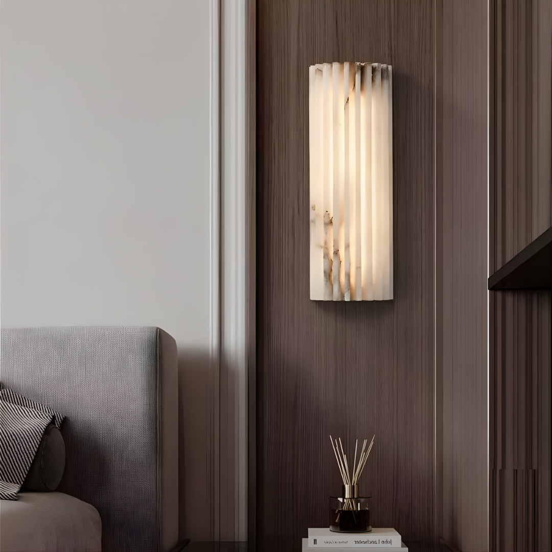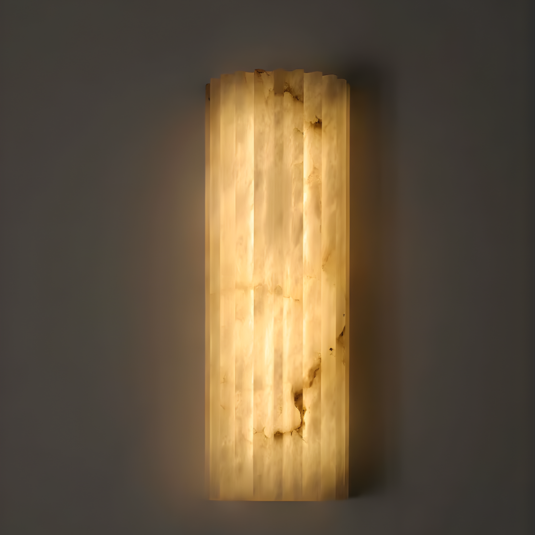 A vertical ribbed alabaster wall light with unique natural veining, paired with refined metal accents and warm, neutral, or cool white lighting options.