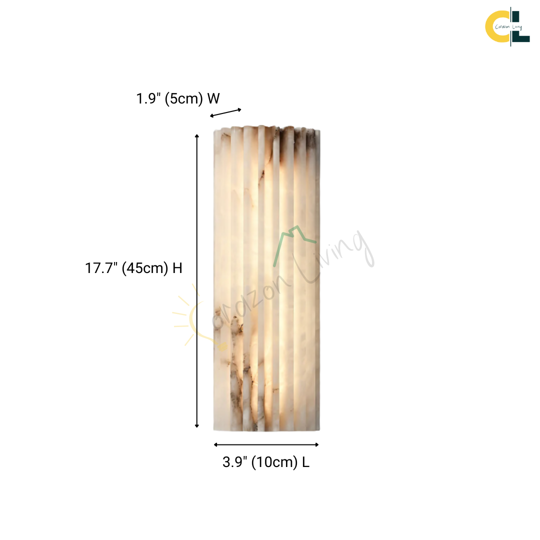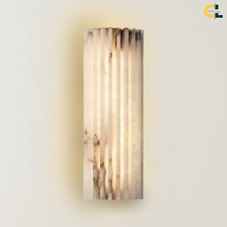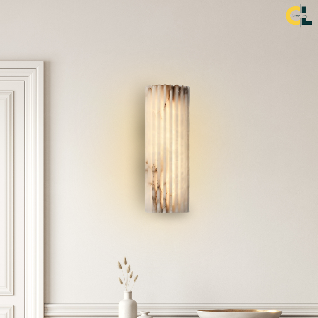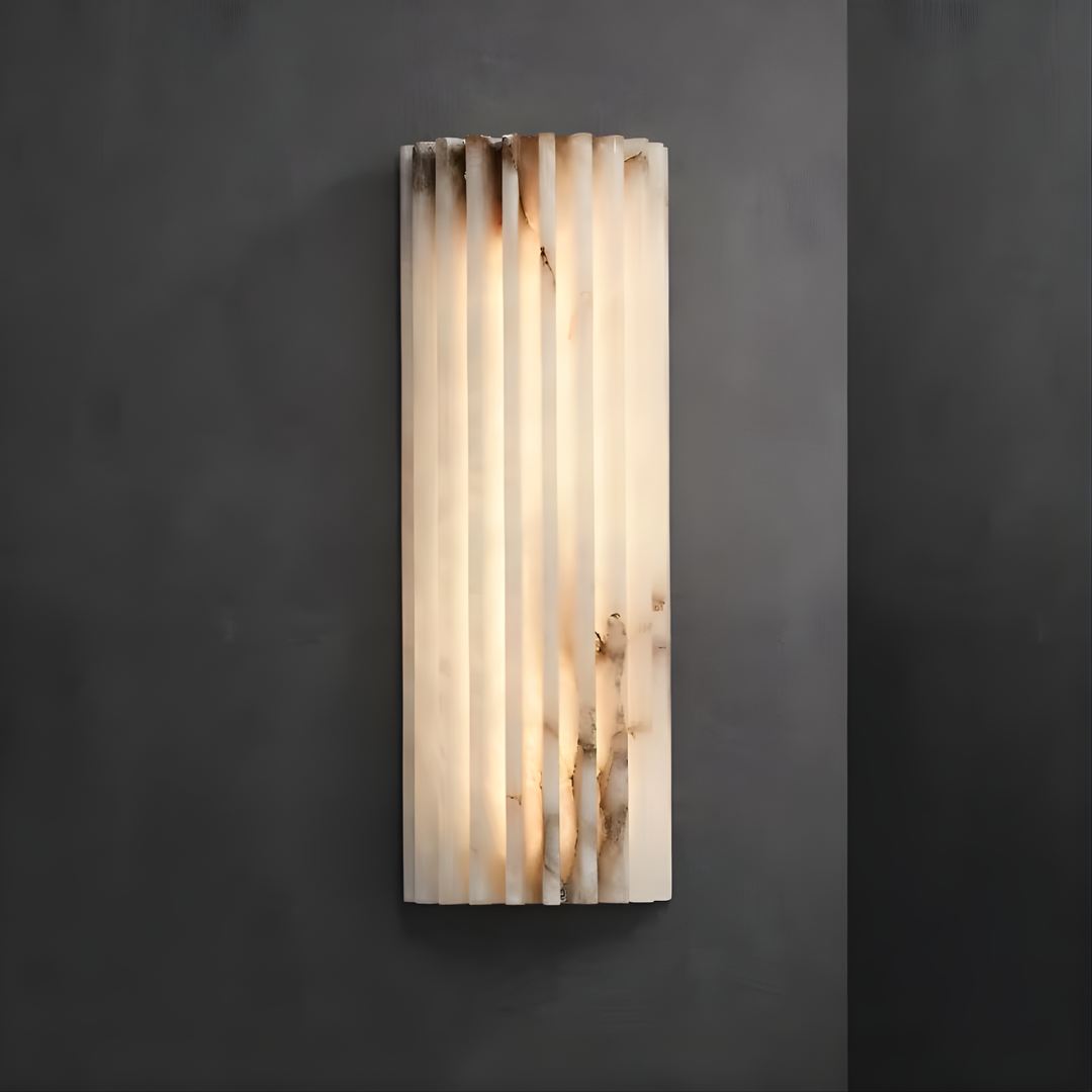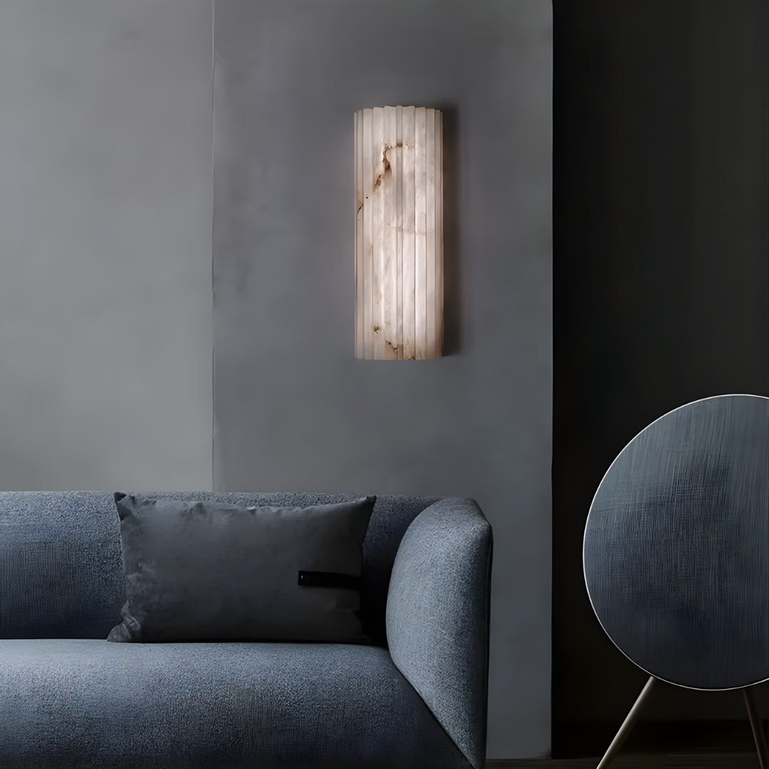 A vertical ribbed alabaster wall light with unique natural veining, paired with refined metal accents and warm, neutral, or cool white lighting options.