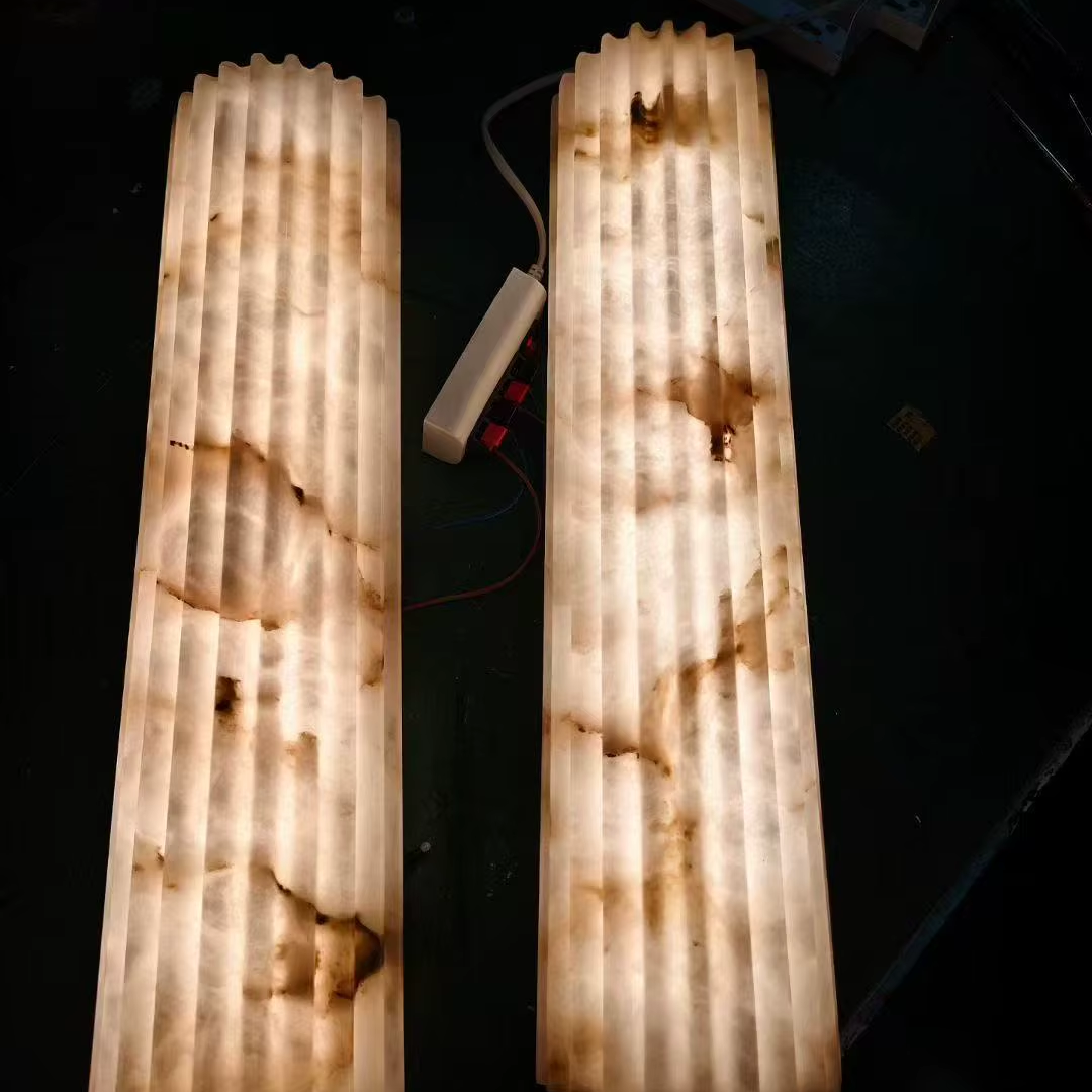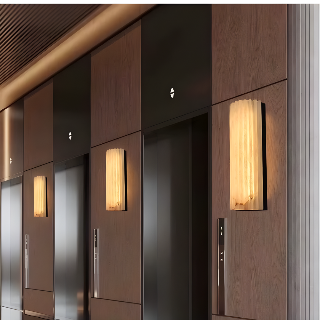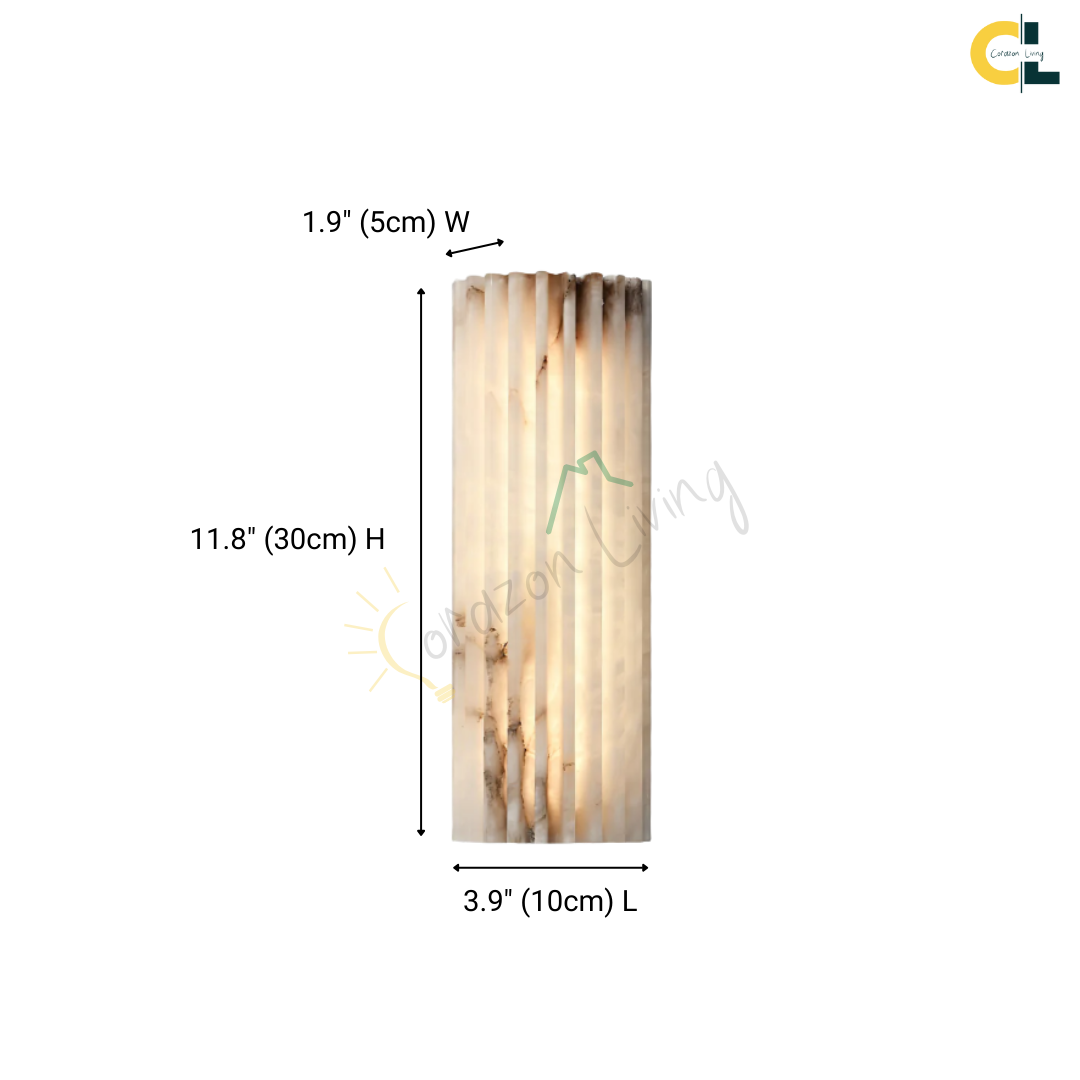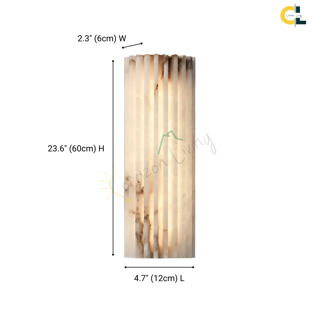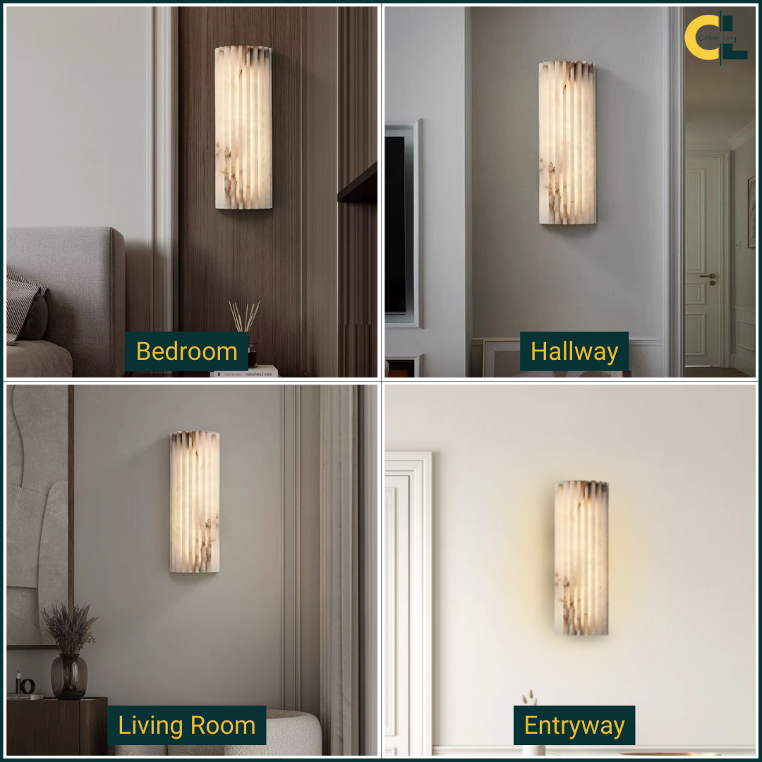 A vertical ribbed alabaster wall light with unique natural veining, paired with refined metal accents and warm, neutral, or cool white lighting options.