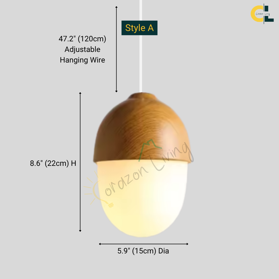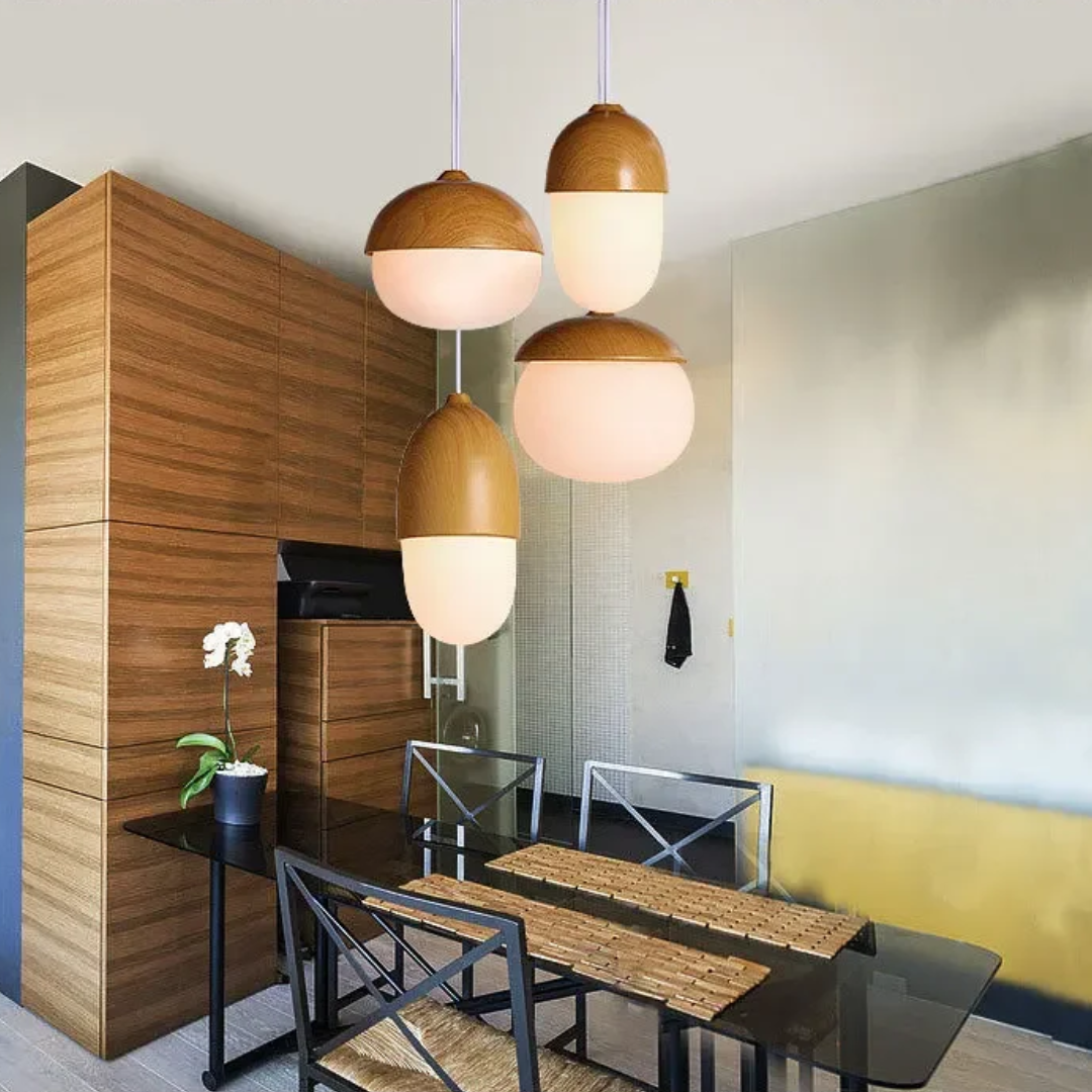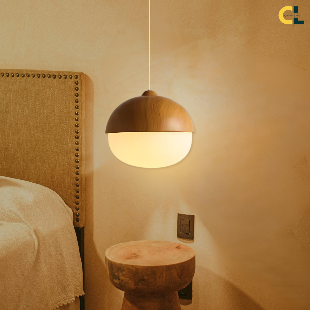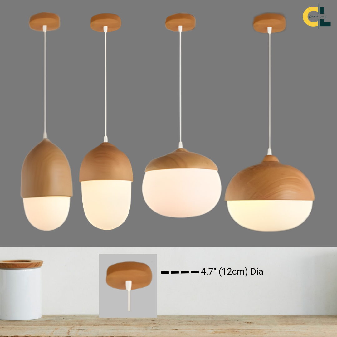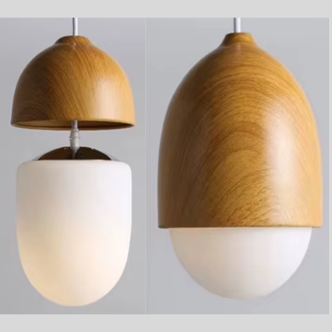 A softly glowing nut-inspired pendant that blends Nordic minimalism with organic warmth through its frosted glass diffuser and natural wood-grain accents