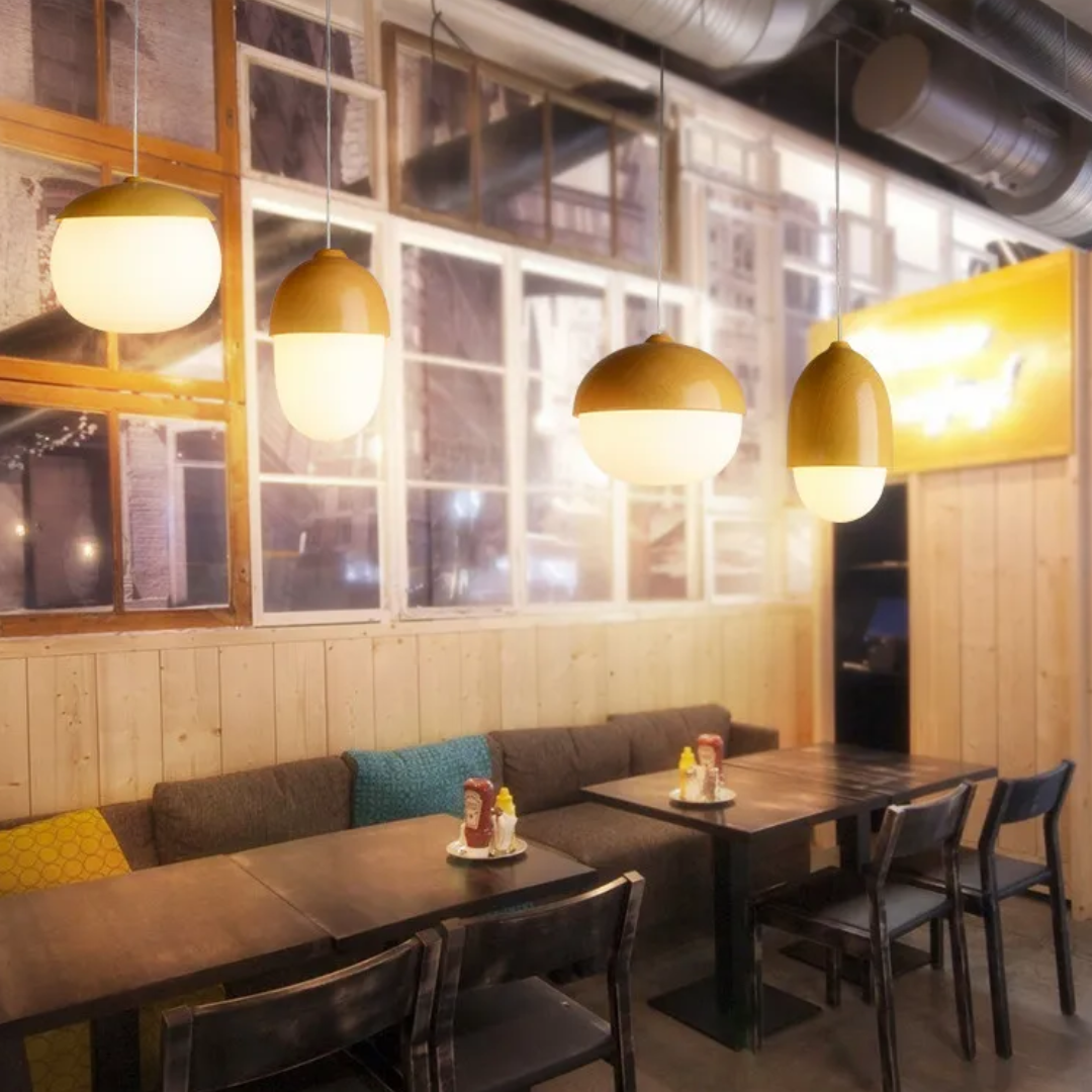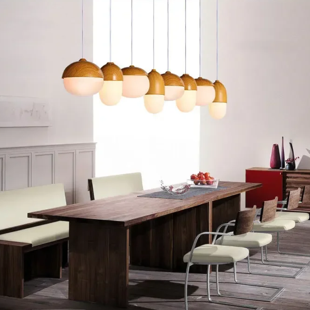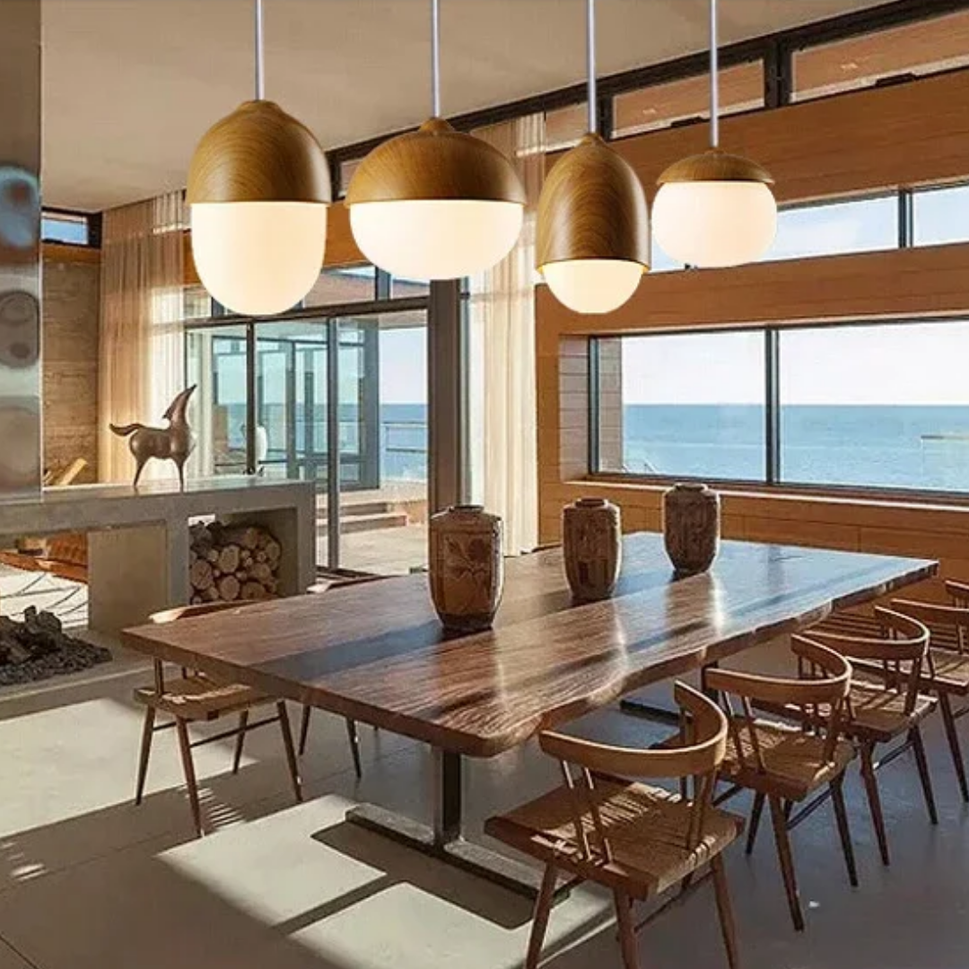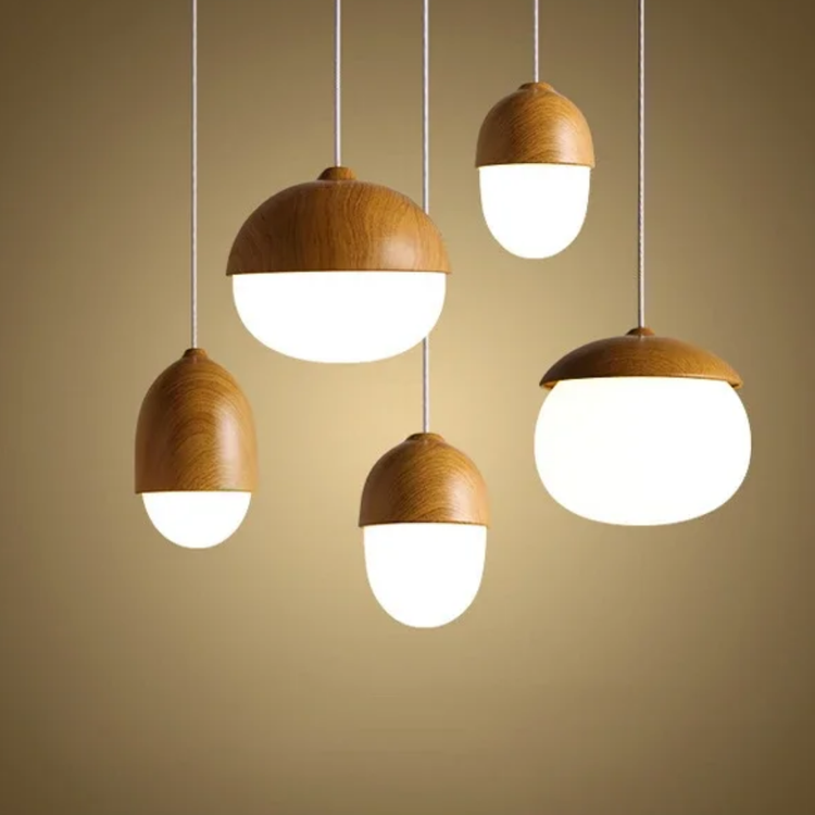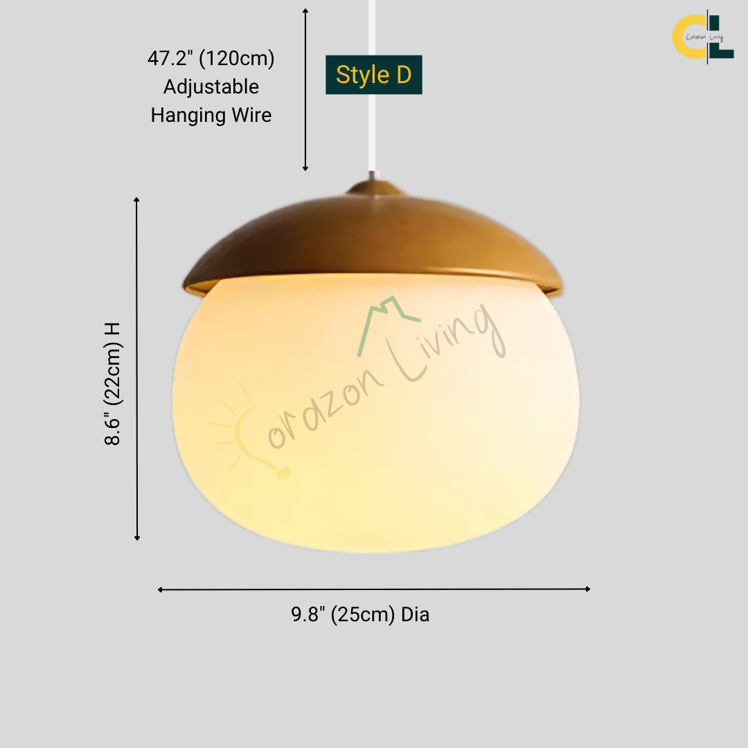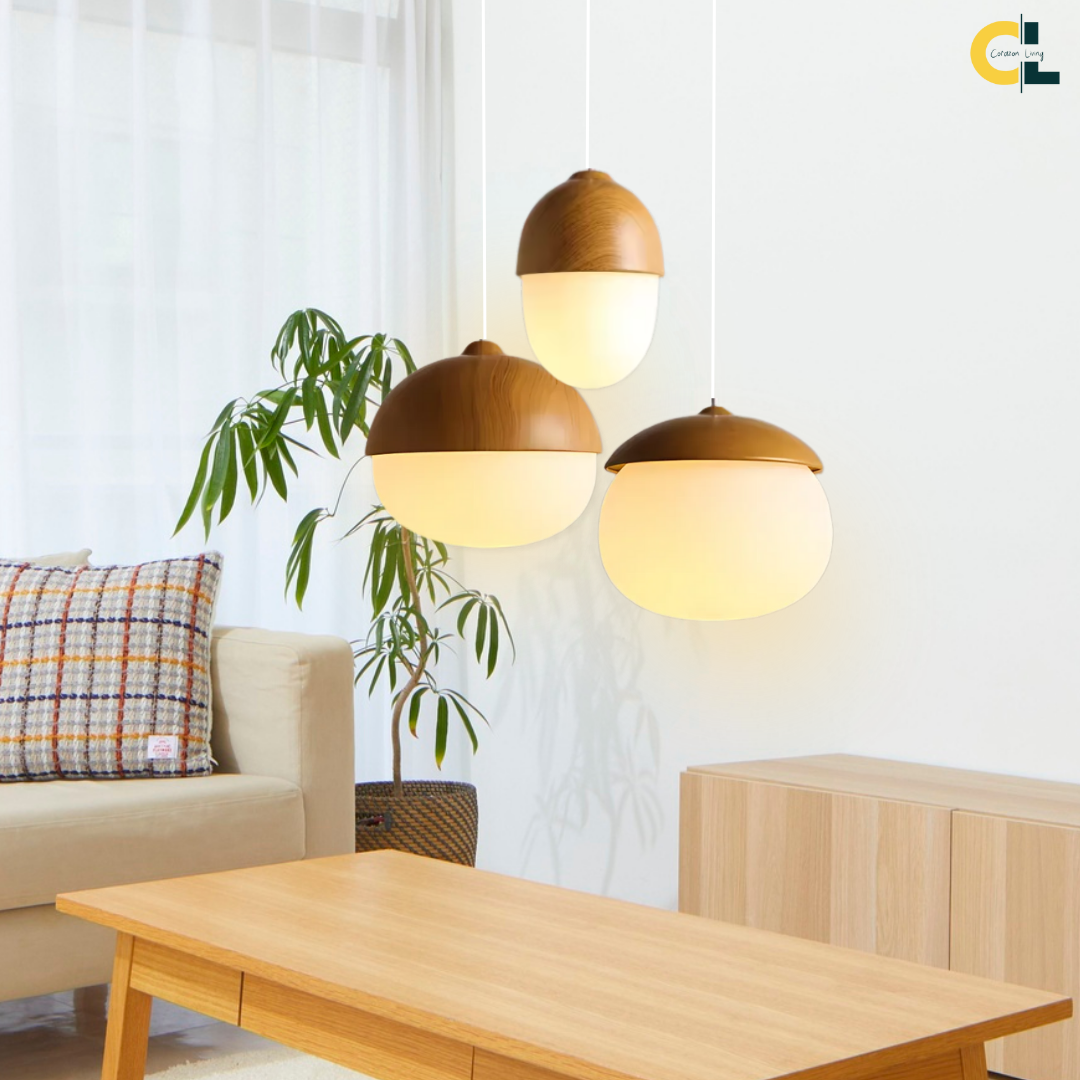 A softly glowing nut-inspired pendant that blends Nordic minimalism with organic warmth through its frosted glass diffuser and natural wood-grain accents