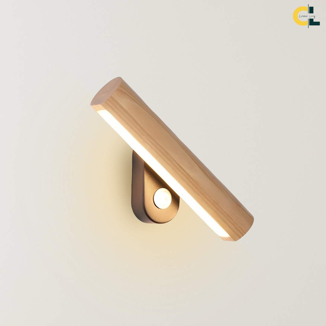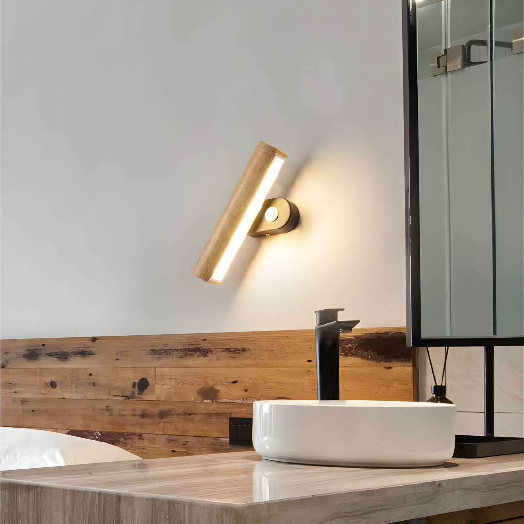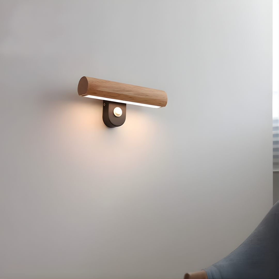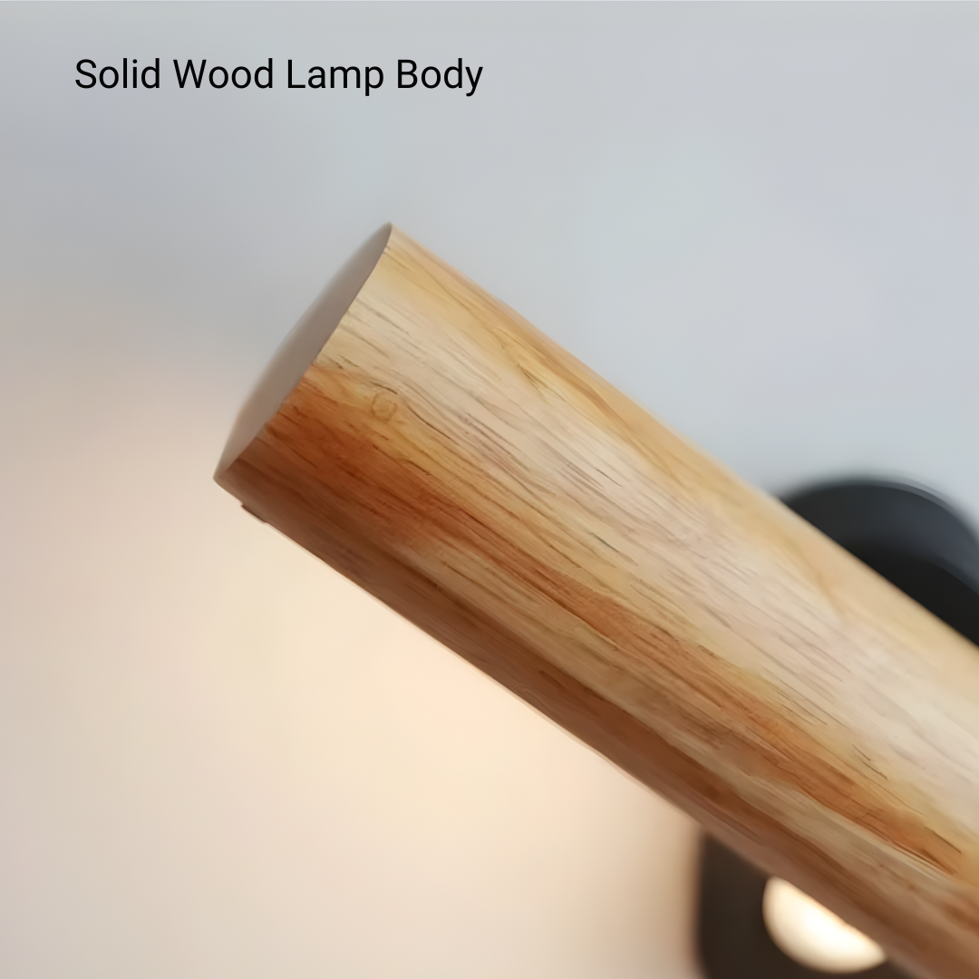 A modern wood-accented wall light with an adjustable LED head, offering warm or cool illumination and flexible directional lighting with natural elegance.