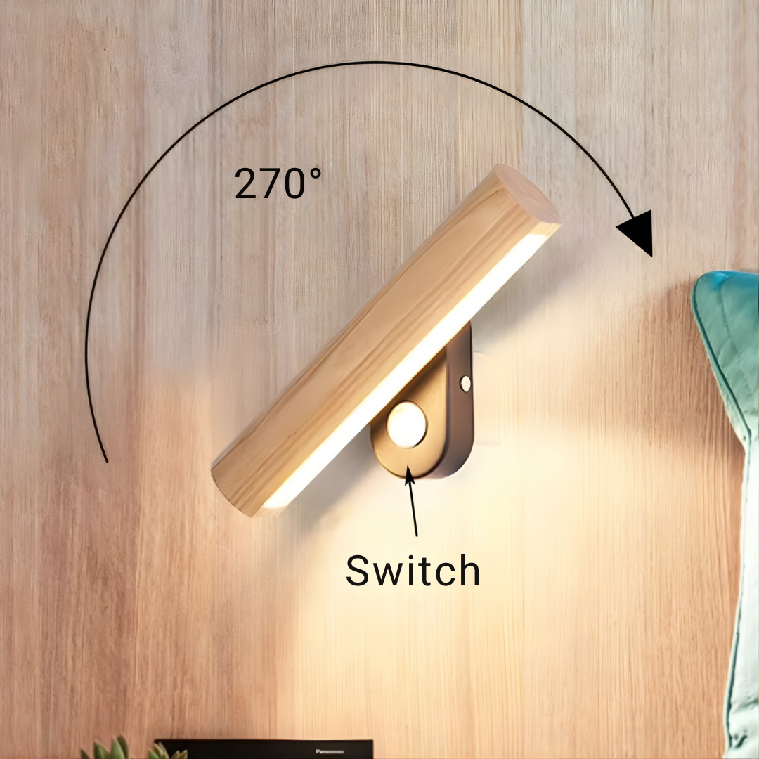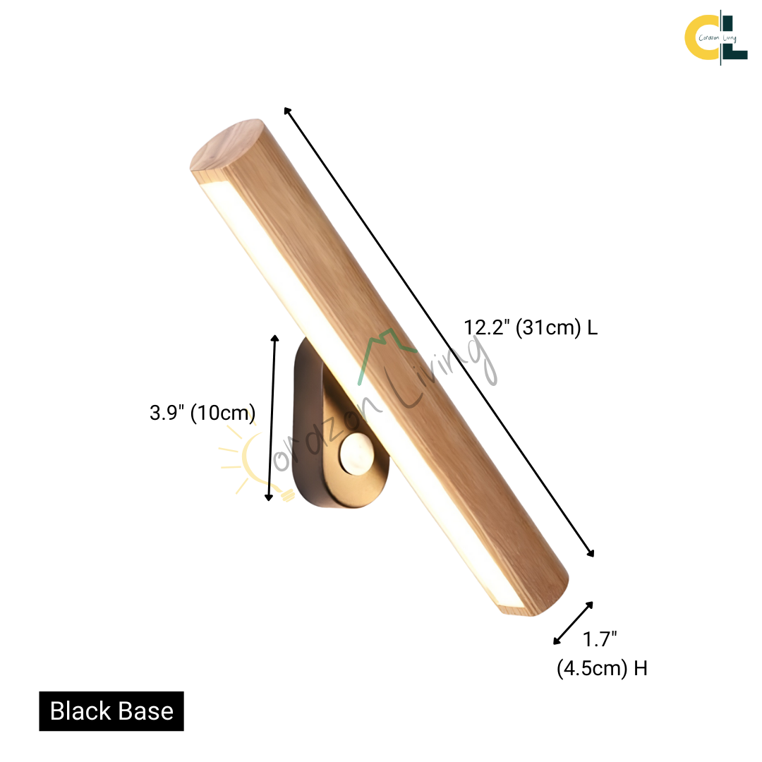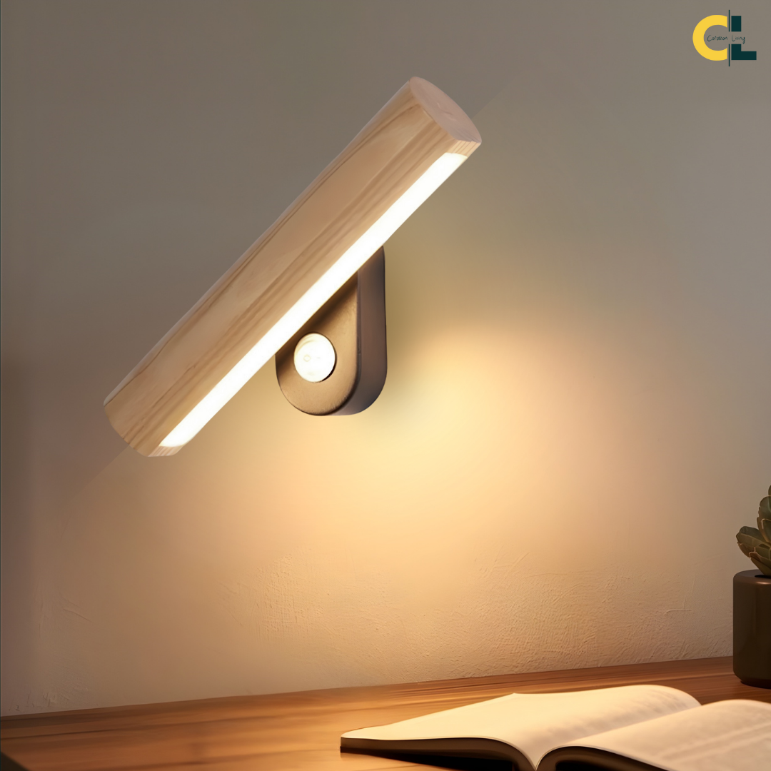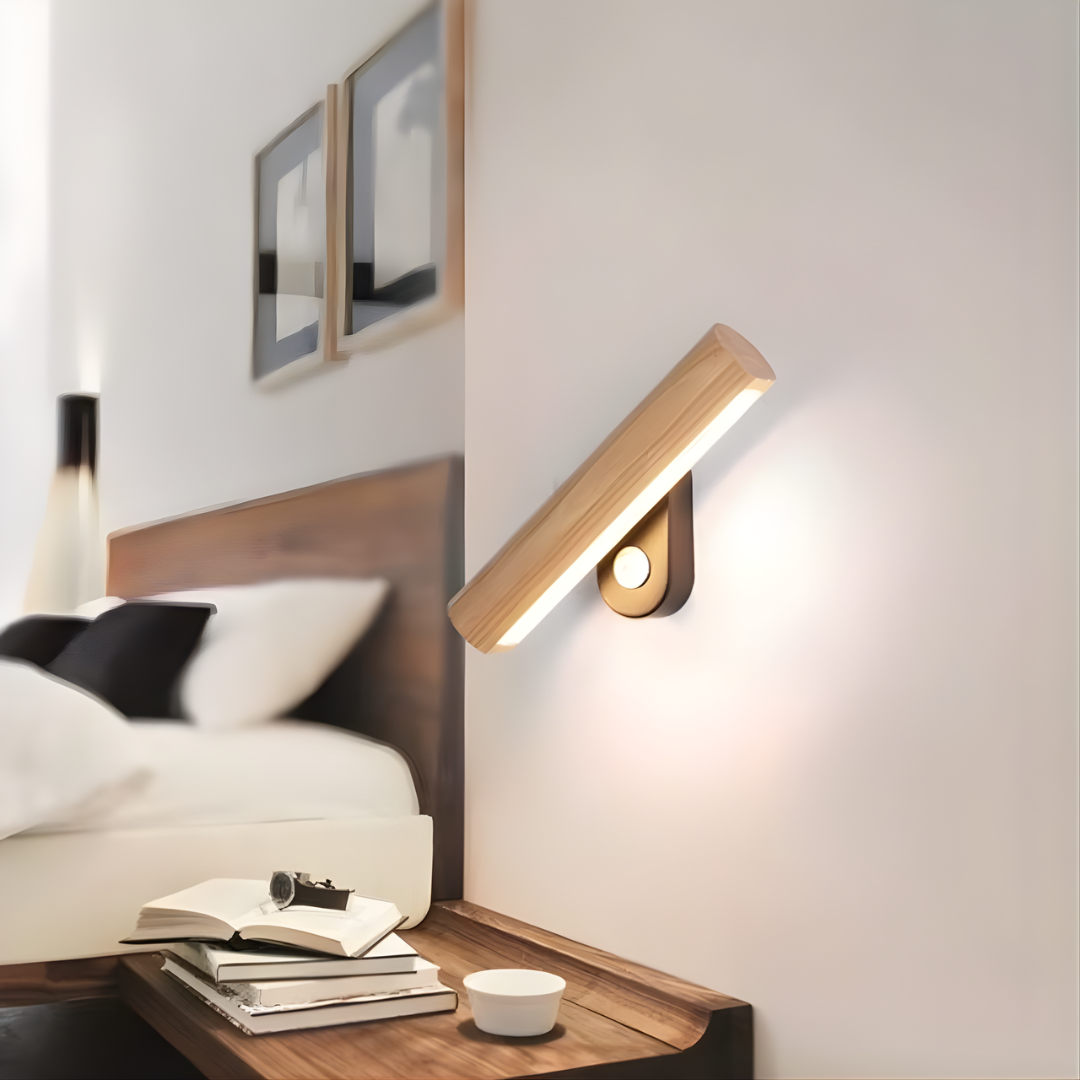 A modern wood-accented wall light with an adjustable LED head, offering warm or cool illumination and flexible directional lighting with natural elegance.