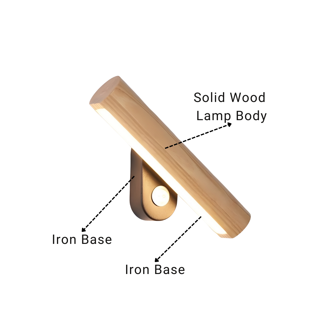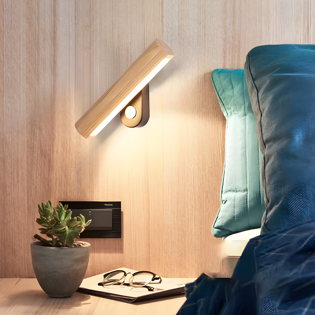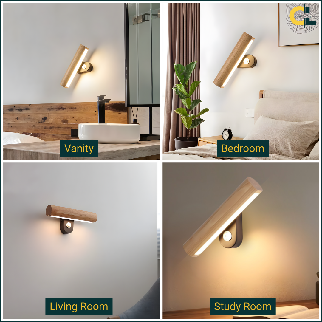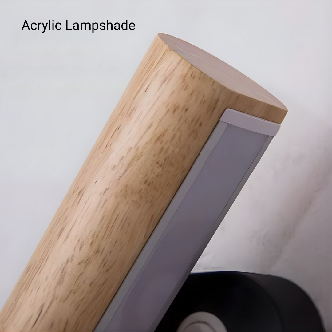 A modern wood-accented wall light with an adjustable LED head, offering warm or cool illumination and flexible directional lighting with natural elegance.