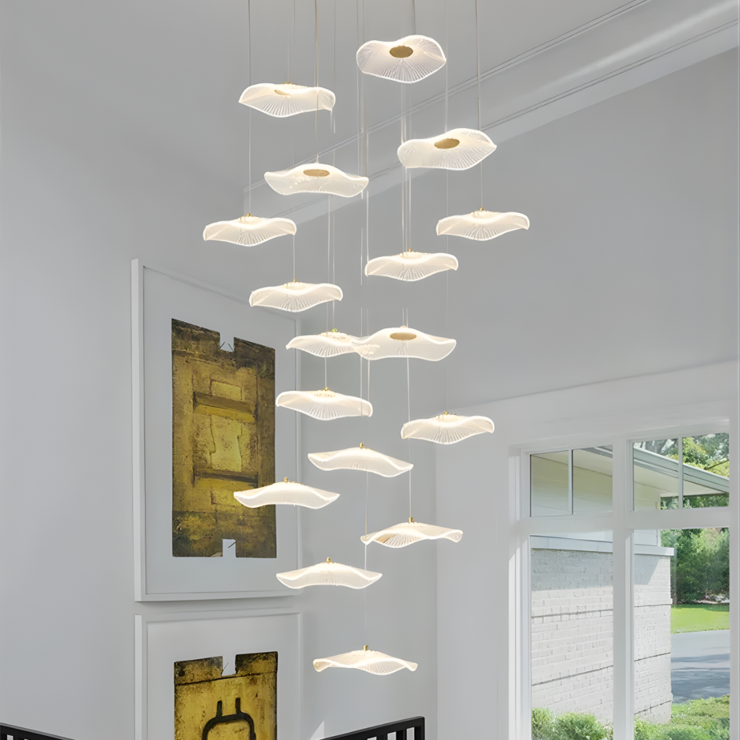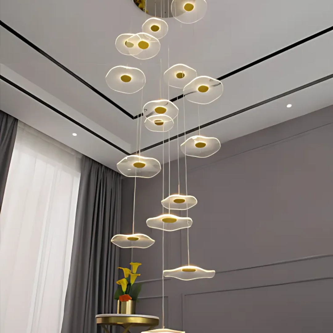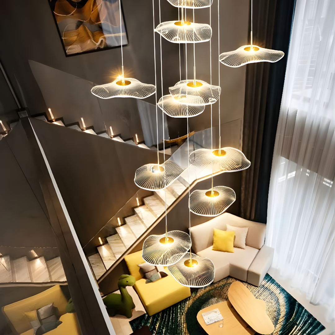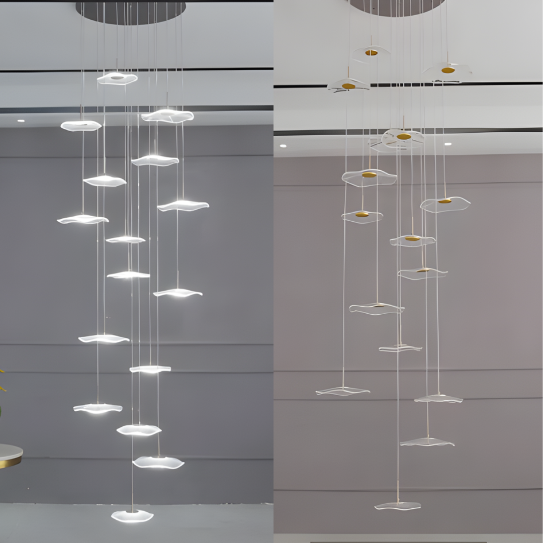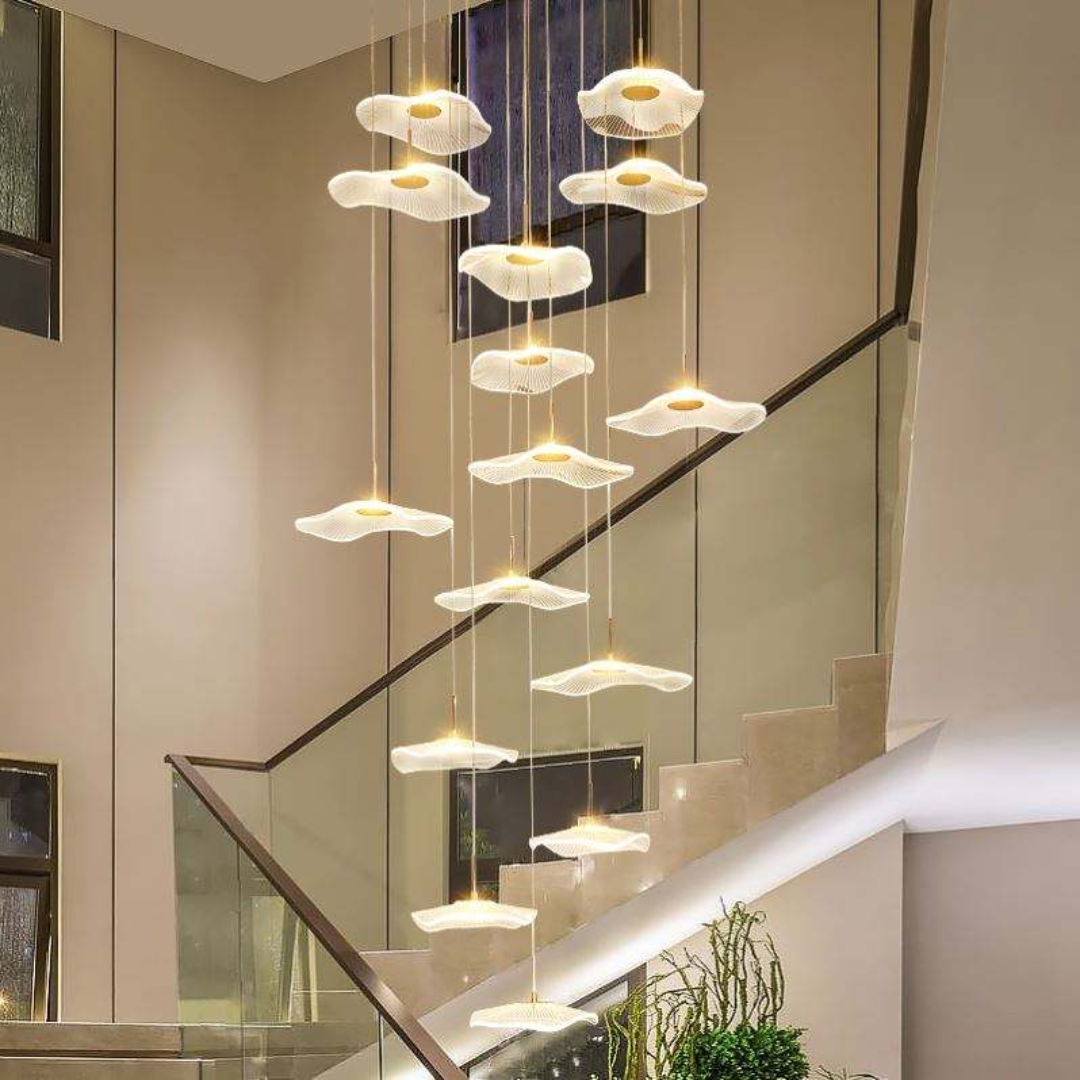 Make a bold artistic statement with the Daffodil elegant LED Staircase Chandelier, a sculptural masterpiece designed for high-ceiling spaces. Featuring petal-like acrylic shades that resemble lotus flowers or delicate leaves, this chandelier brings elegance and natural beauty into contemporary interiors. The warm LED glow and floating effect make it ideal for staircases, dining rooms, hotel lobbies, villas, and other architectural spaces that deserve a touch of creative sophistication.