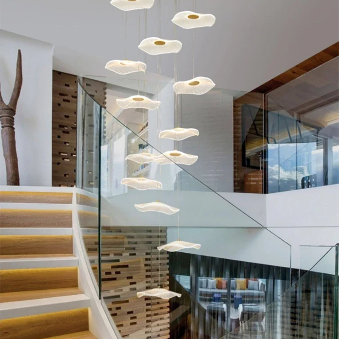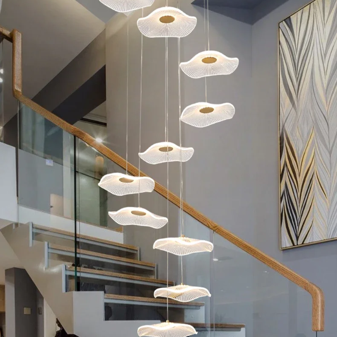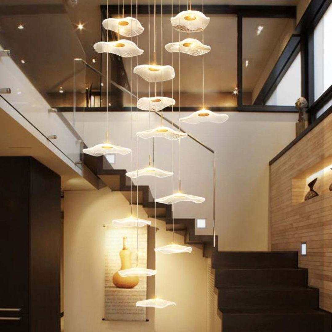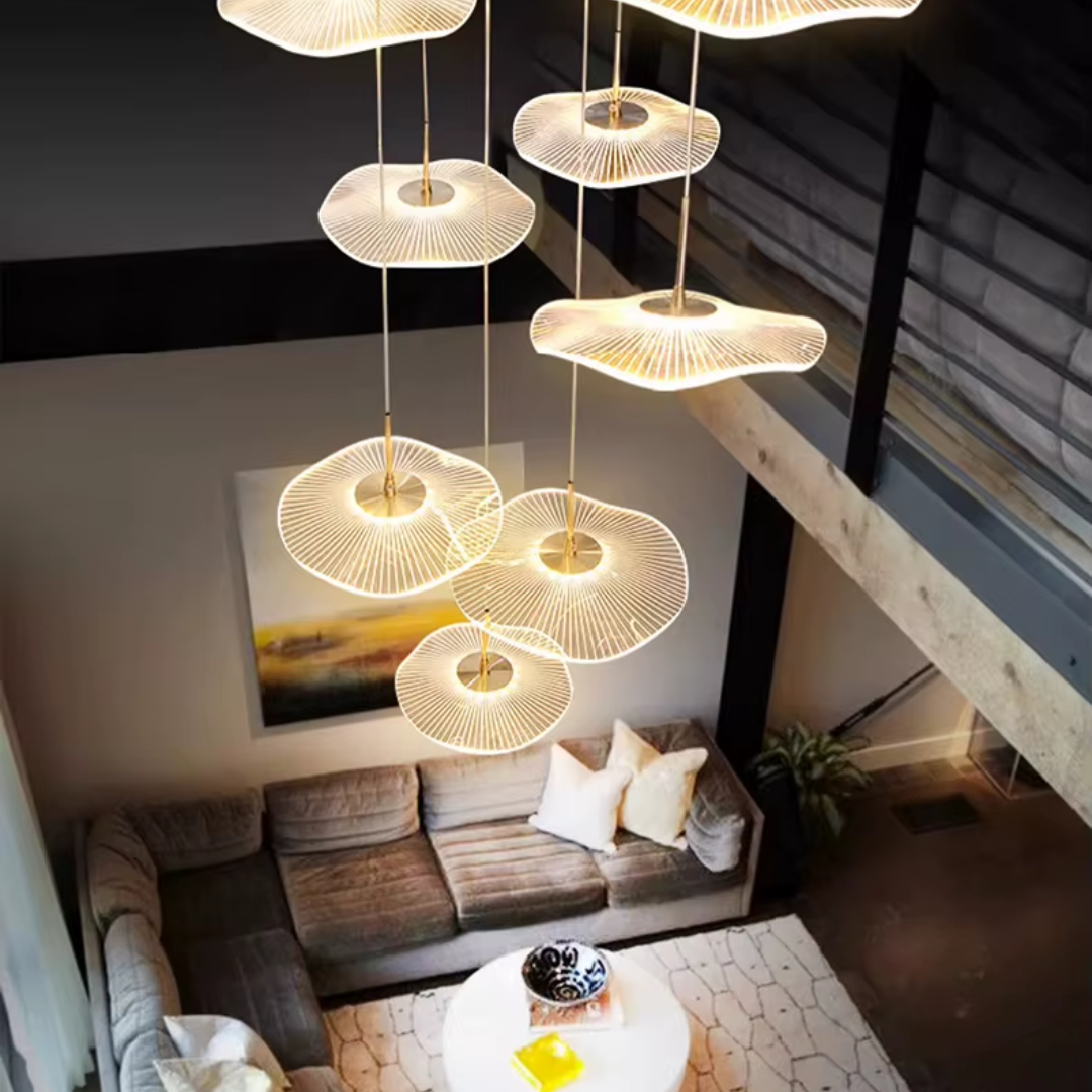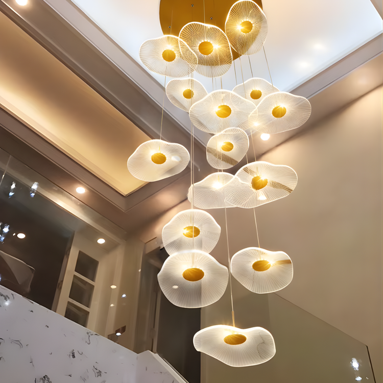 Make a bold artistic statement with the Daffodil elegant LED Staircase Chandelier, a sculptural masterpiece designed for high-ceiling spaces. Featuring petal-like acrylic shades that resemble lotus flowers or delicate leaves, this chandelier brings elegance and natural beauty into contemporary interiors. The warm LED glow and floating effect make it ideal for staircases, dining rooms, hotel lobbies, villas, and other architectural spaces that deserve a touch of creative sophistication.