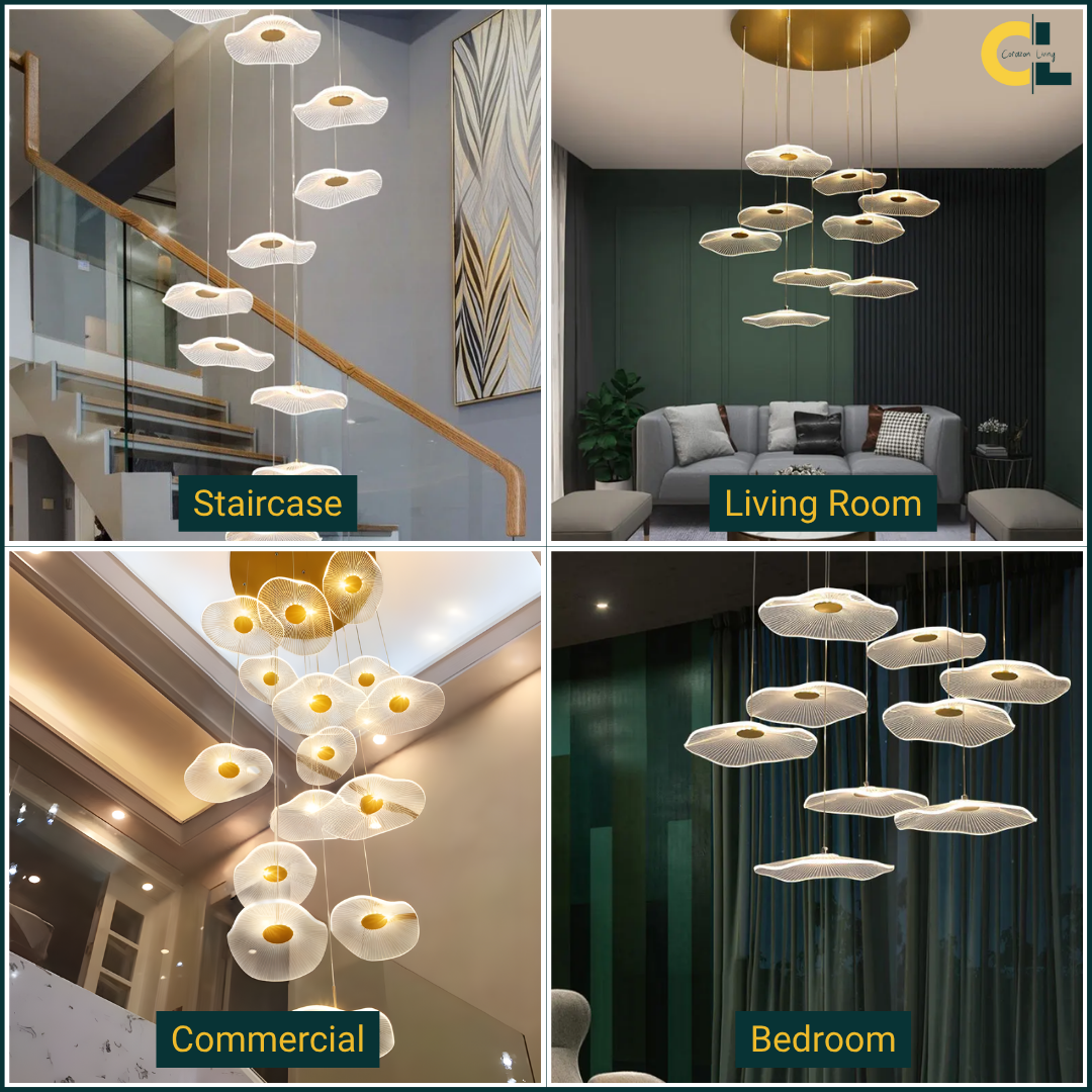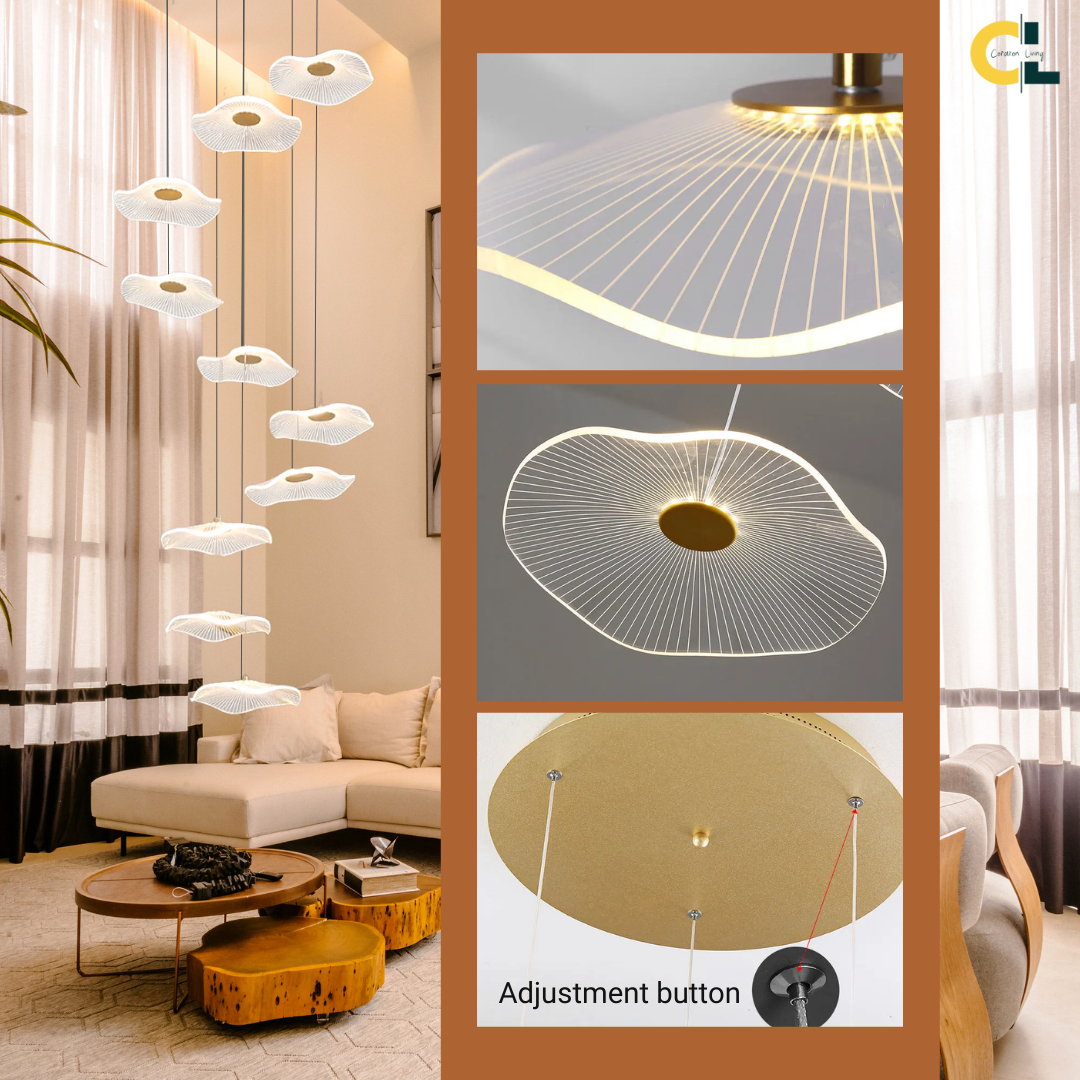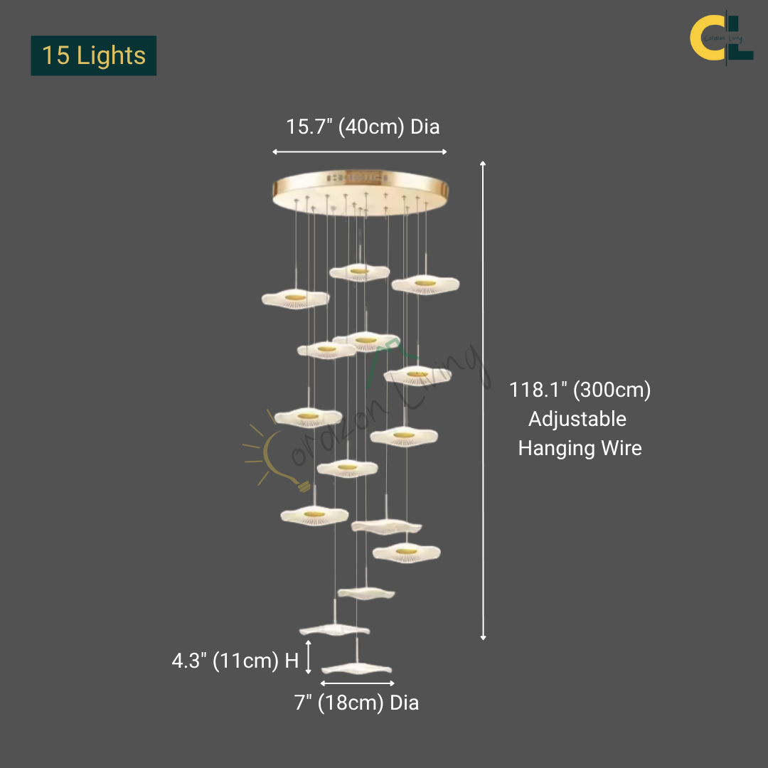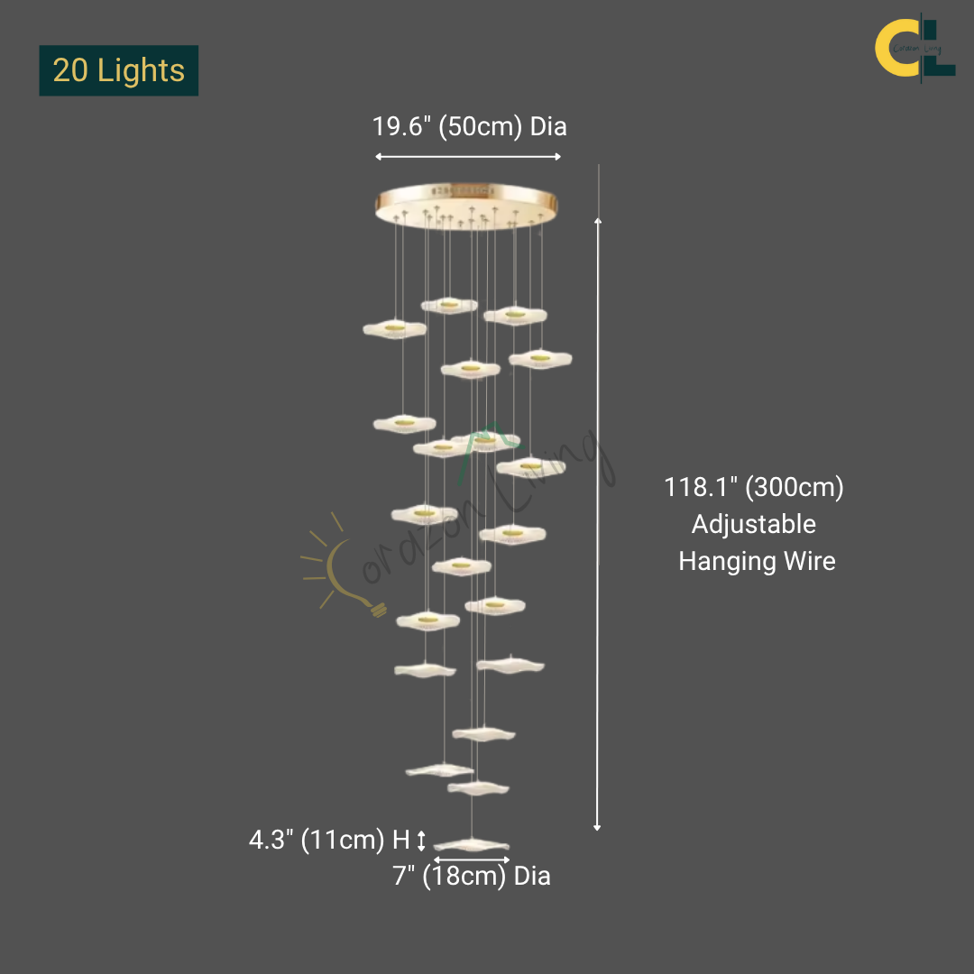 Make a bold artistic statement with the Daffodil elegant LED Staircase Chandelier, a sculptural masterpiece designed for high-ceiling spaces. Featuring petal-like acrylic shades that resemble lotus flowers or delicate leaves, this chandelier brings elegance and natural beauty into contemporary interiors. The warm LED glow and floating effect make it ideal for staircases, dining rooms, hotel lobbies, villas, and other architectural spaces that deserve a touch of creative sophistication.