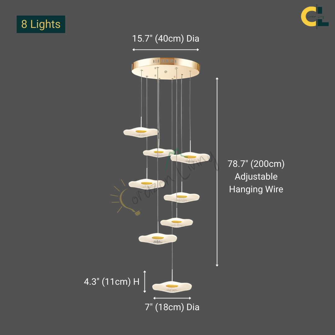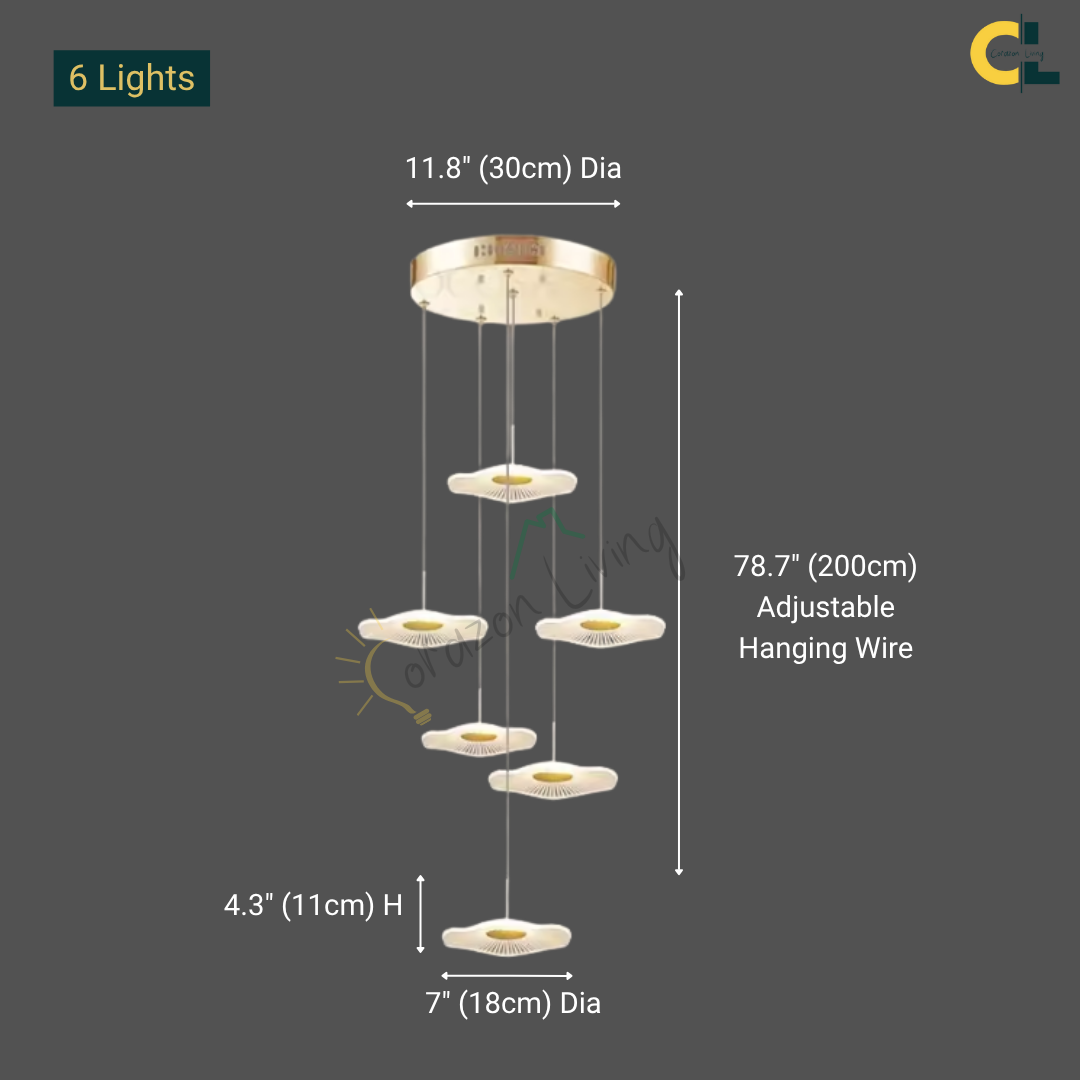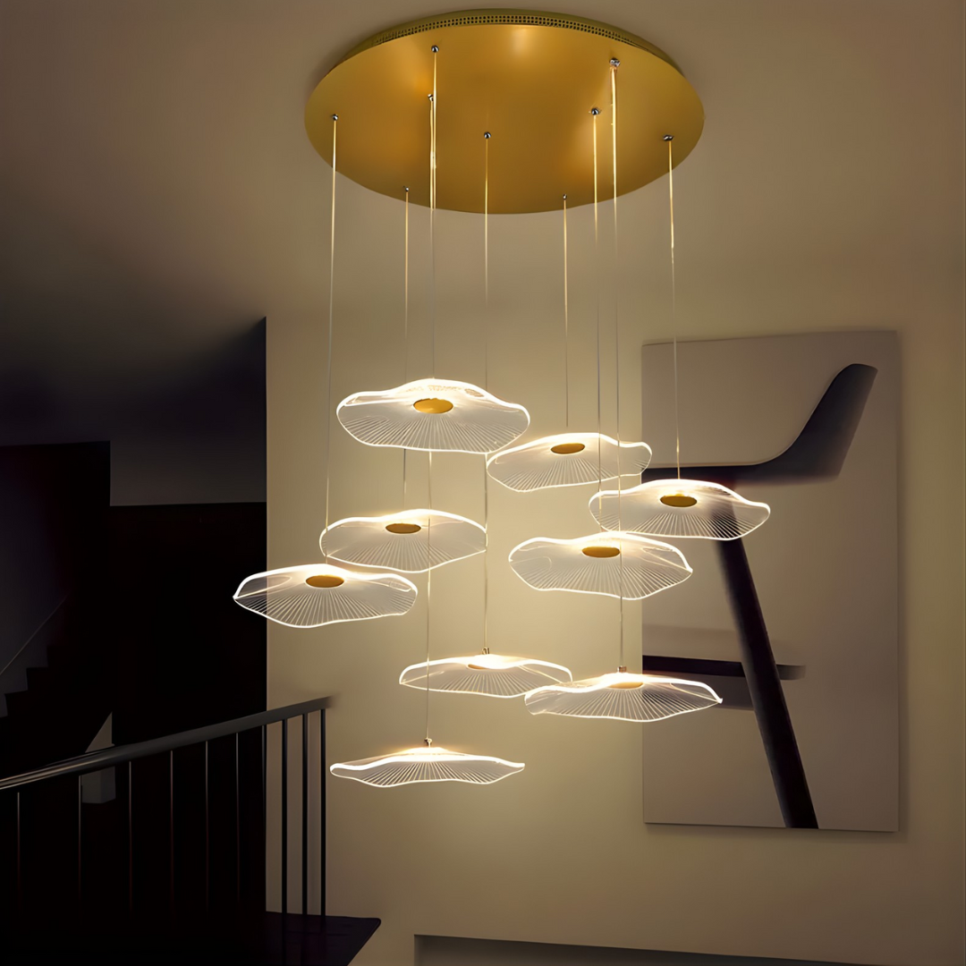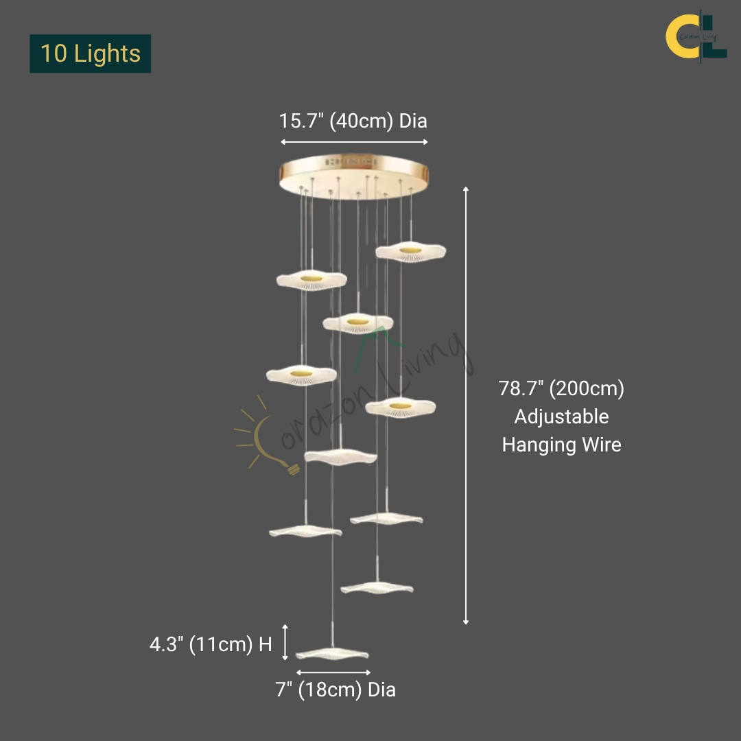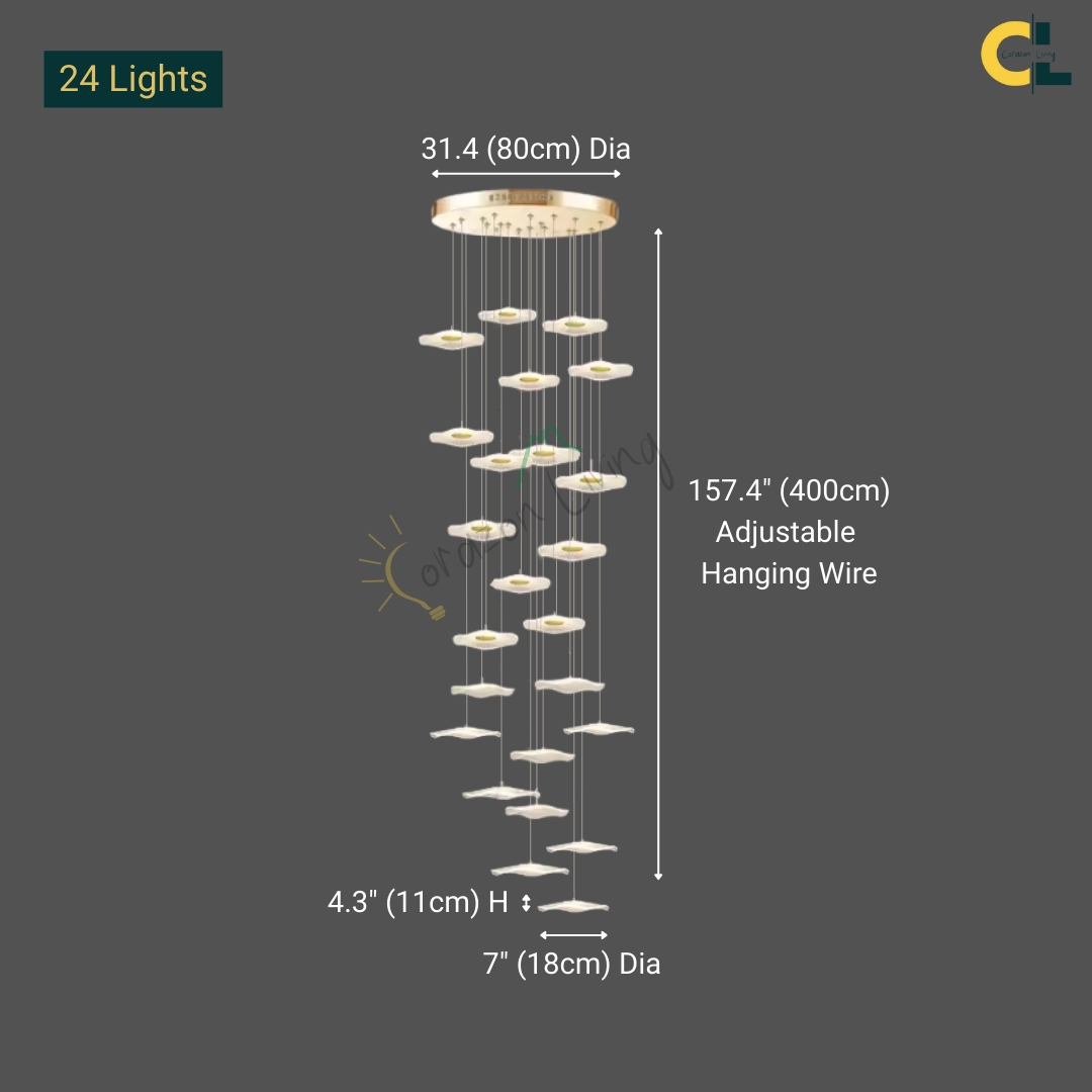 Make a bold artistic statement with the Daffodil elegant LED Staircase Chandelier, a sculptural masterpiece designed for high-ceiling spaces. Featuring petal-like acrylic shades that resemble lotus flowers or delicate leaves, this chandelier brings elegance and natural beauty into contemporary interiors. The warm LED glow and floating effect make it ideal for staircases, dining rooms, hotel lobbies, villas, and other architectural spaces that deserve a touch of creative sophistication.