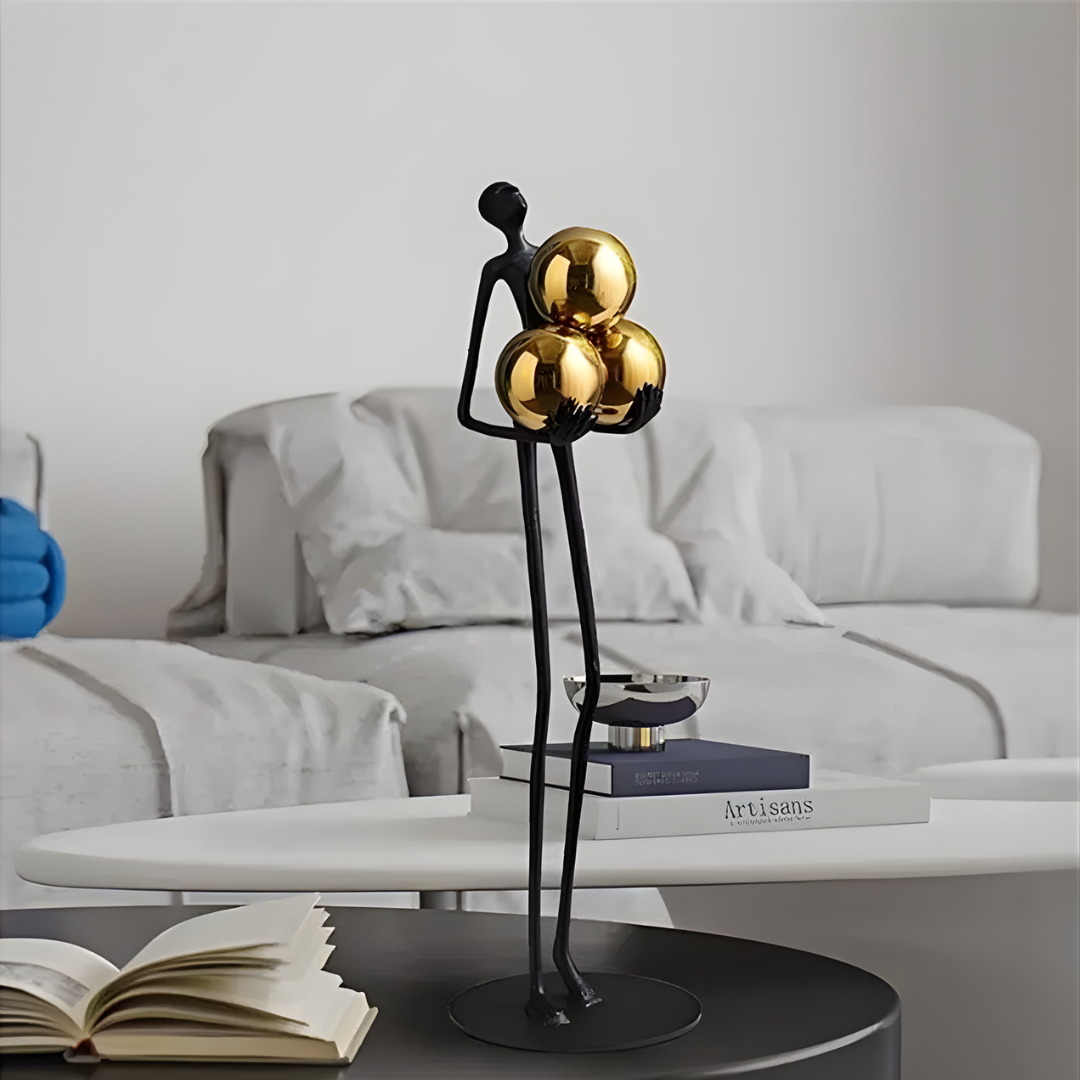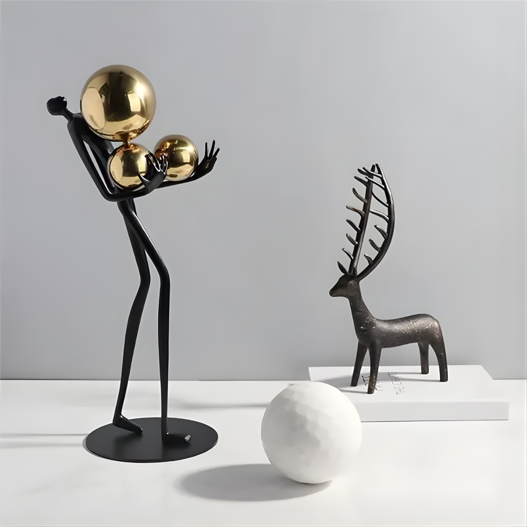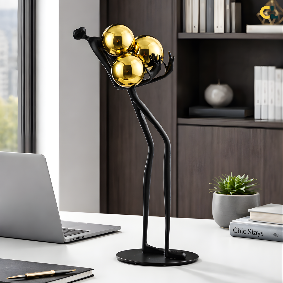 Modern abstract black iron figure holding a gold sphere for tabletop decor