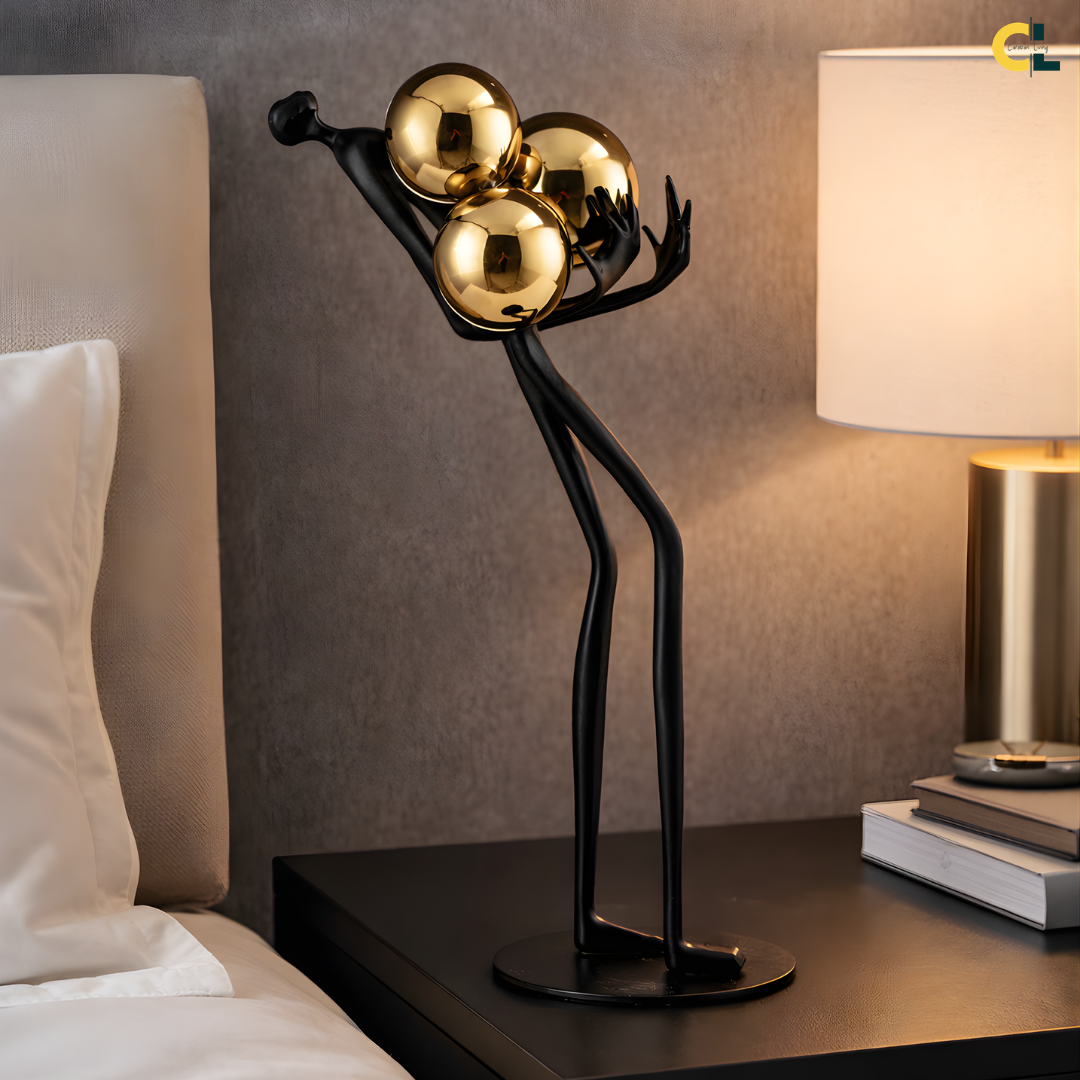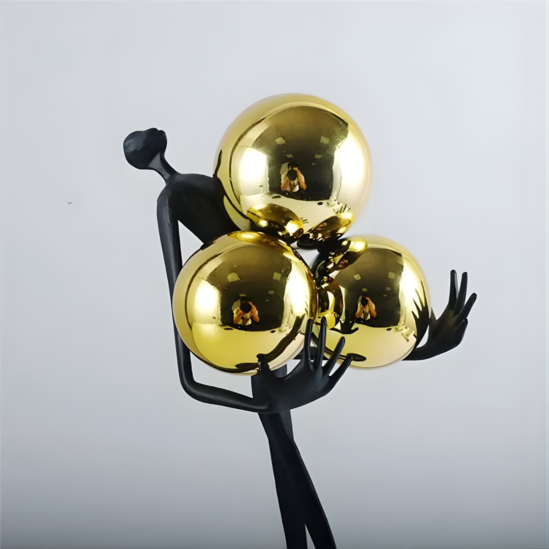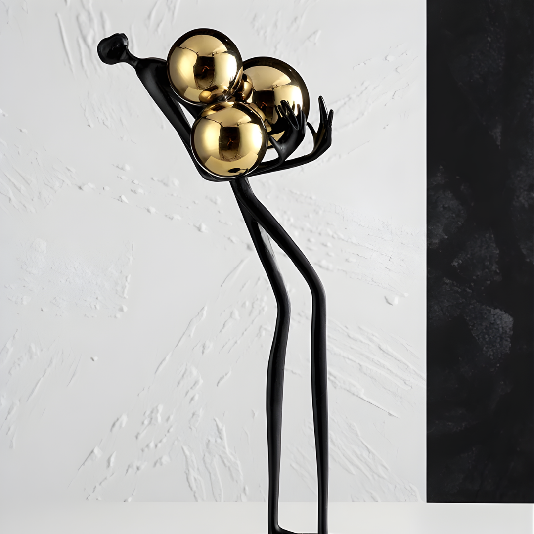 Modern abstract black iron figure holding a gold sphere for tabletop decor