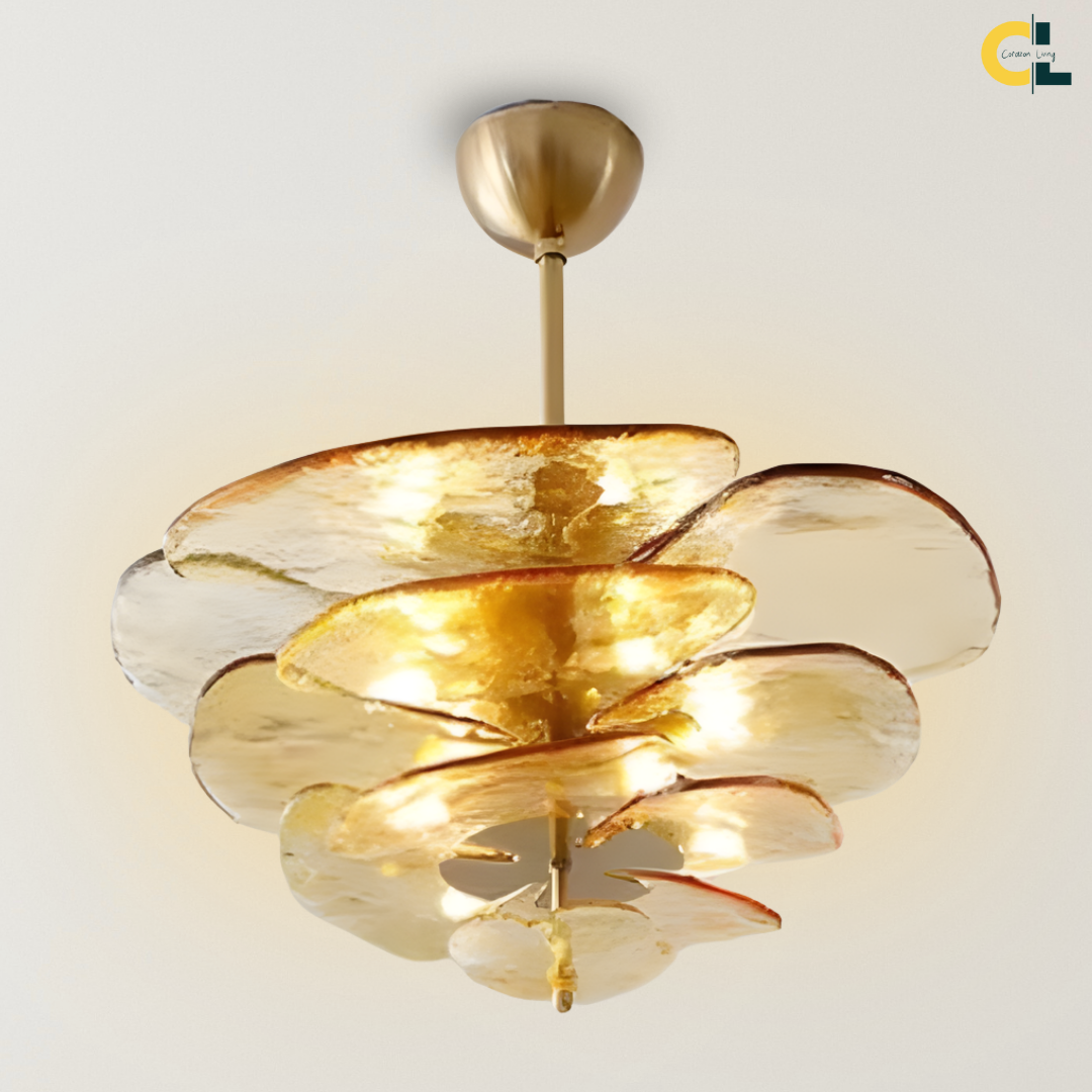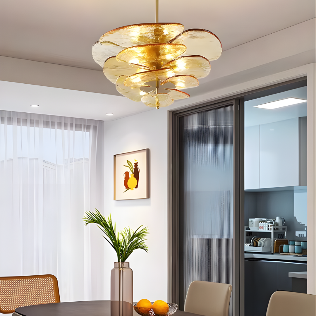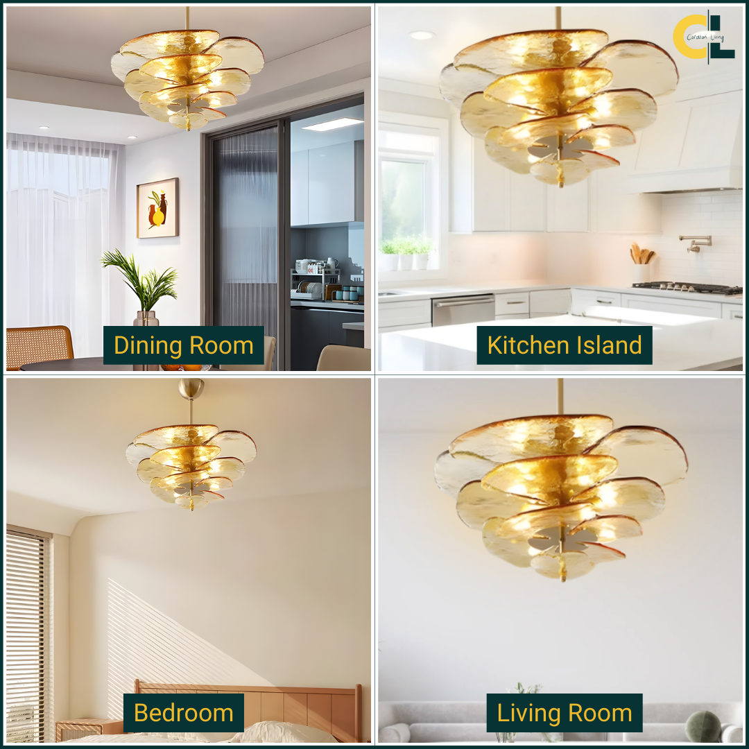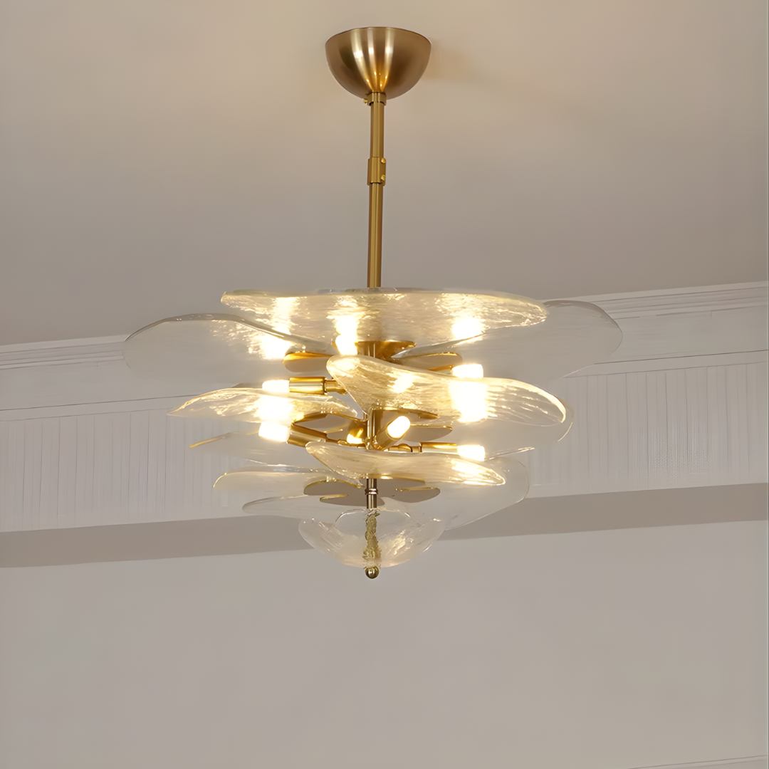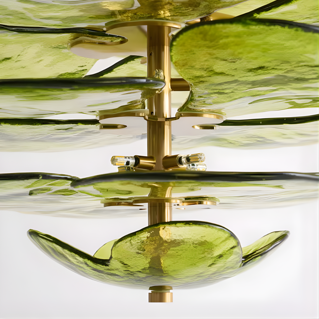 The Felicity Chandelier brings calm, botanical beauty to modern interiors. Inspired by layered leaves, its hand-shaped Murano glass panels float in an elegant formation, gently diffusing light for a warm, inviting glow without glare.