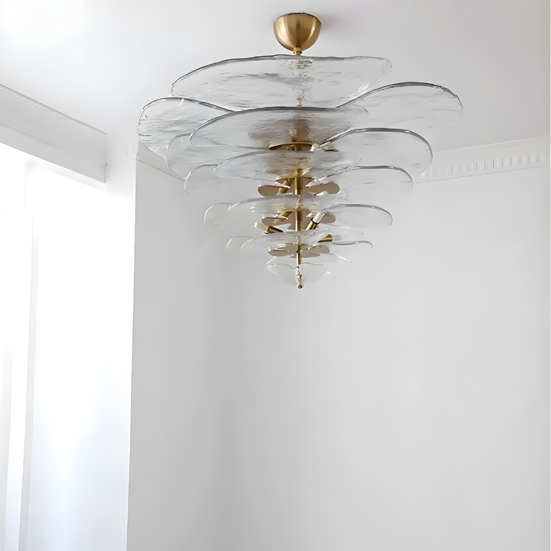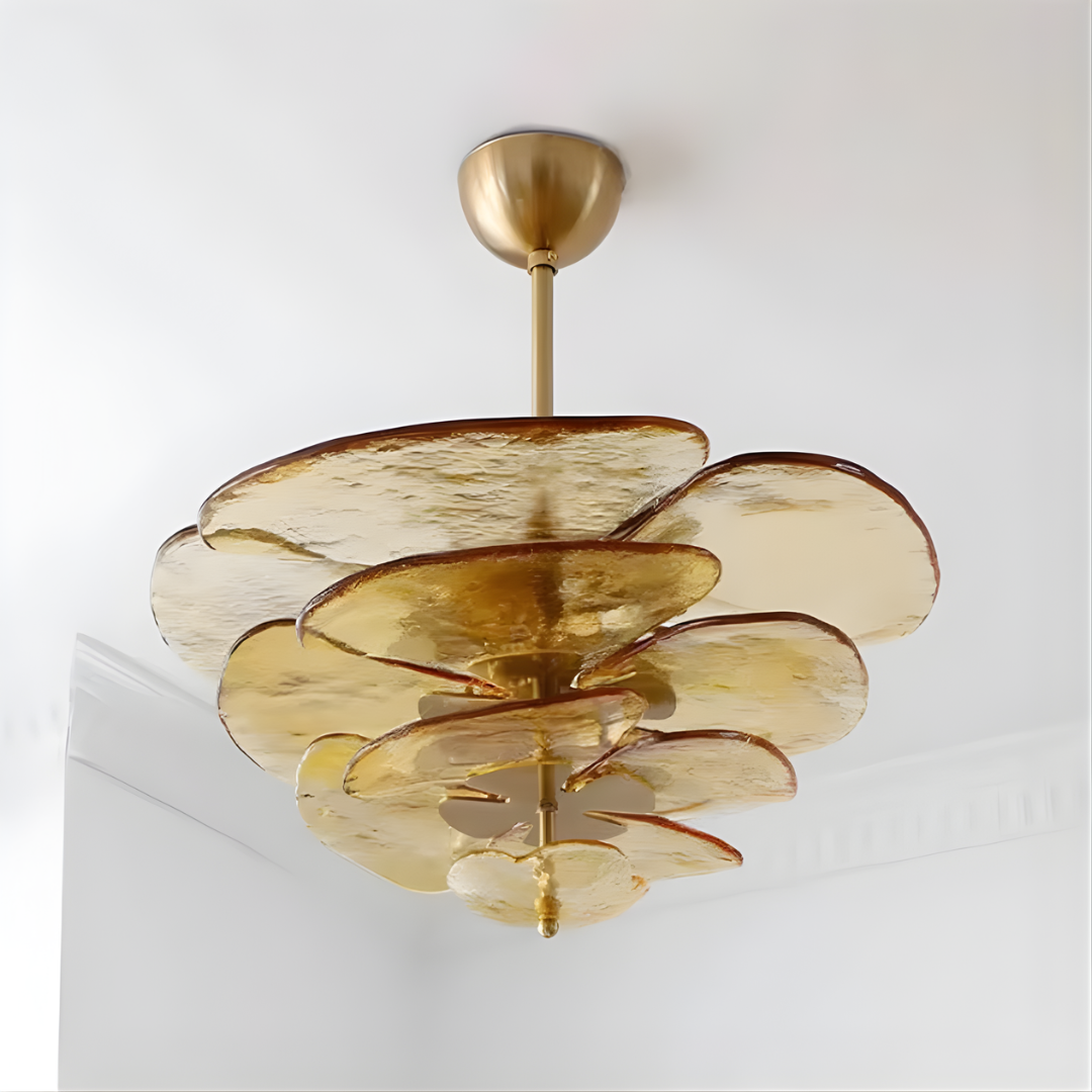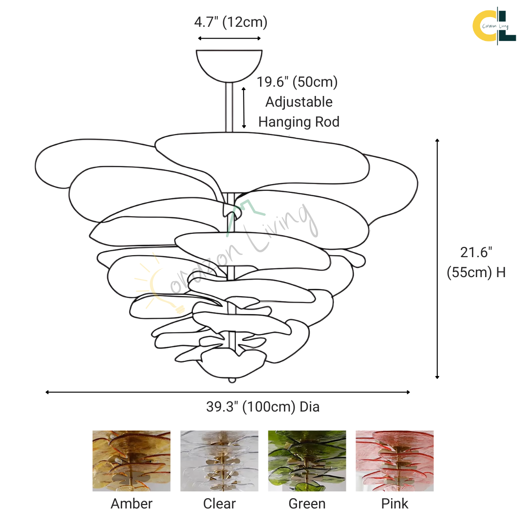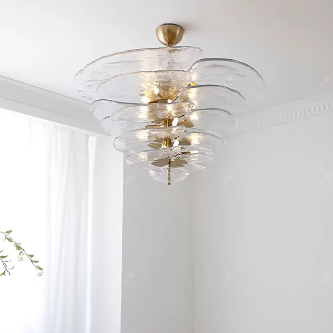 The Felicity Chandelier brings calm, botanical beauty to modern interiors. Inspired by layered leaves, its hand-shaped Murano glass panels float in an elegant formation, gently diffusing light for a warm, inviting glow without glare.