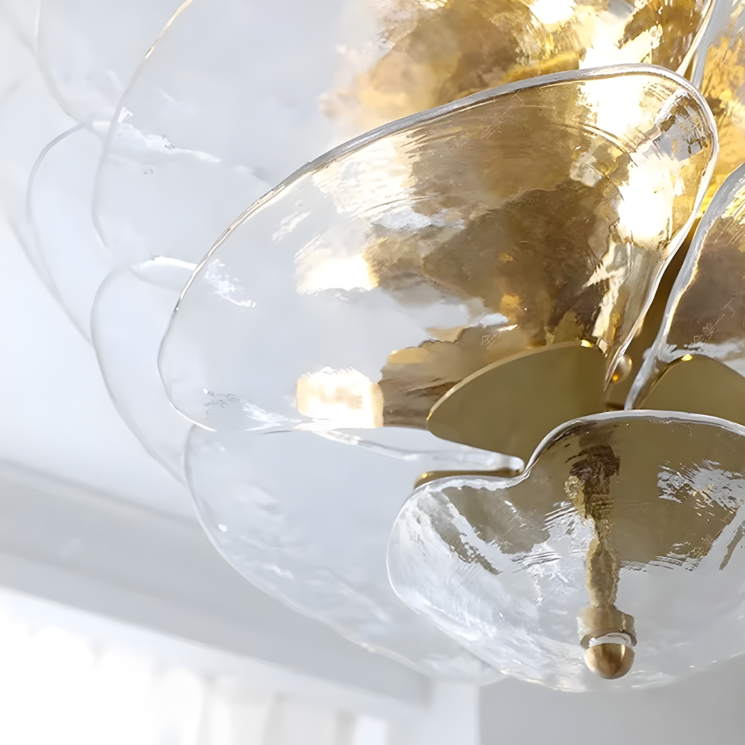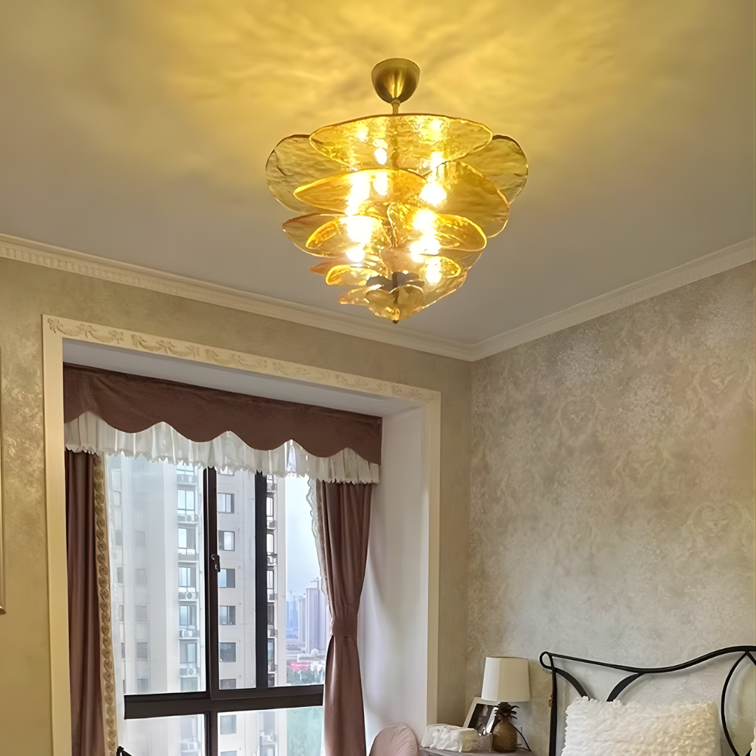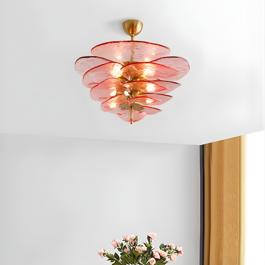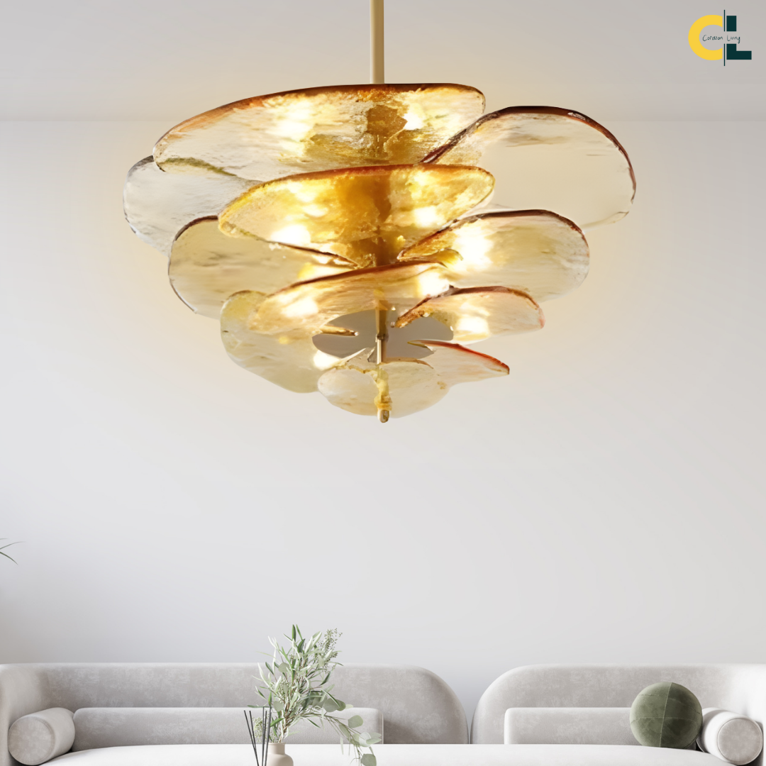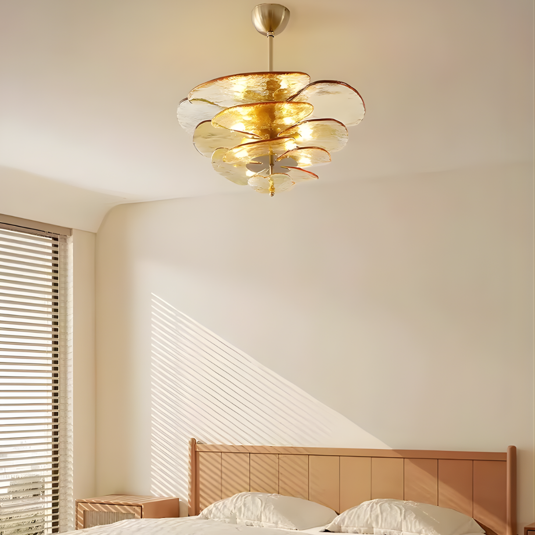 The Felicity Chandelier brings calm, botanical beauty to modern interiors. Inspired by layered leaves, its hand-shaped Murano glass panels float in an elegant formation, gently diffusing light for a warm, inviting glow without glare.