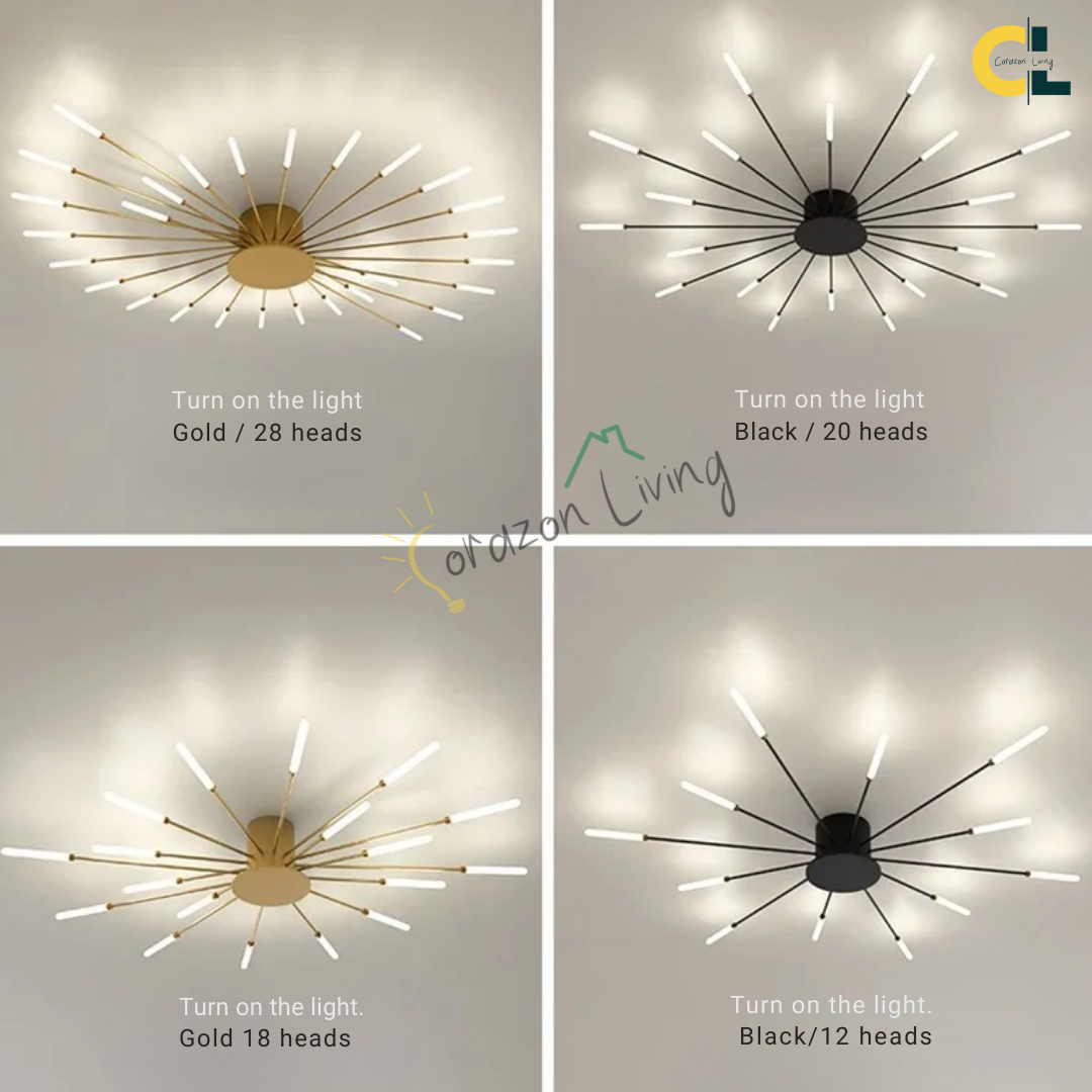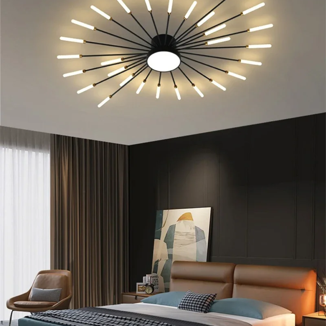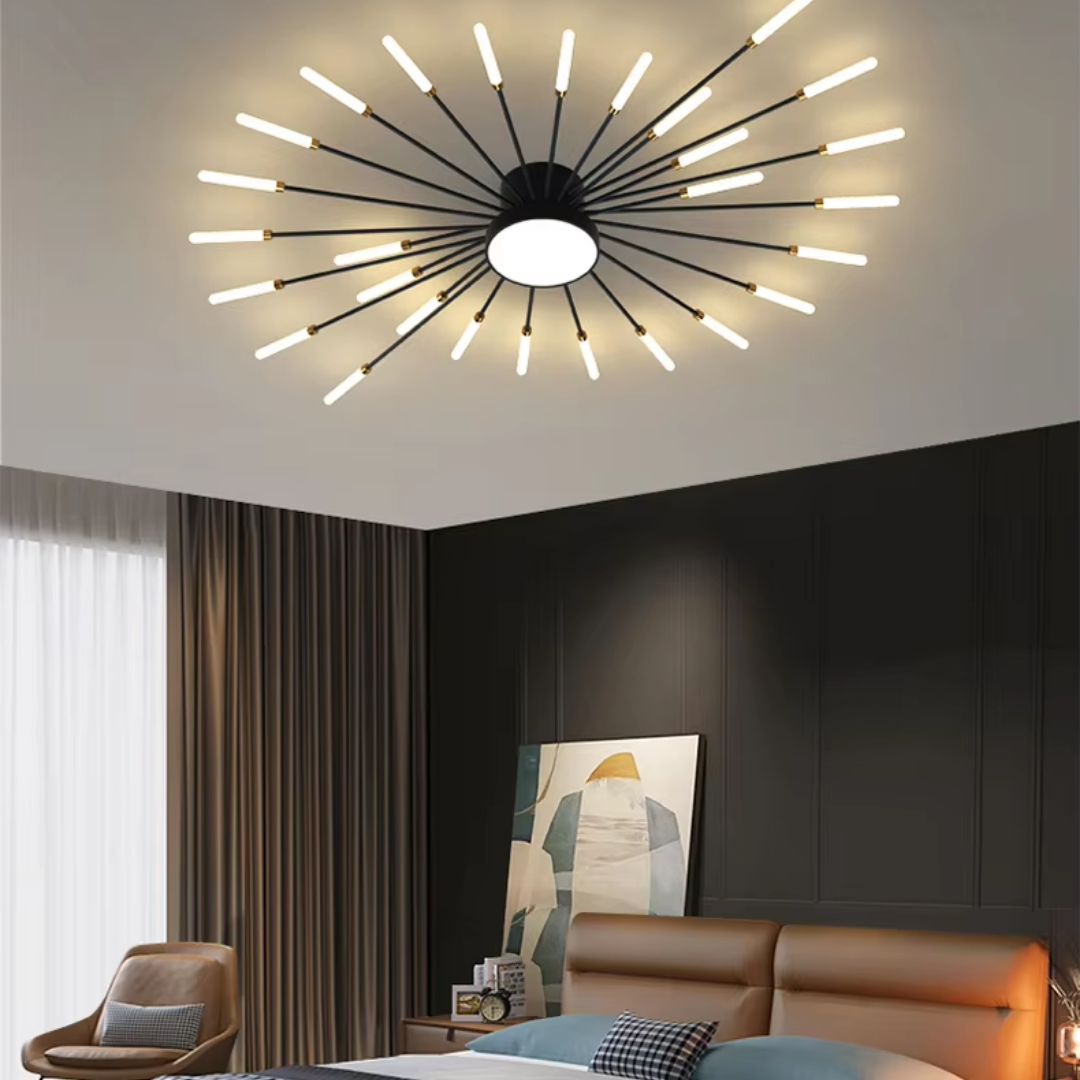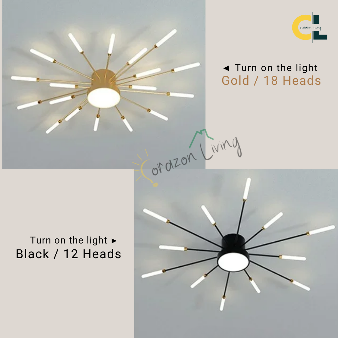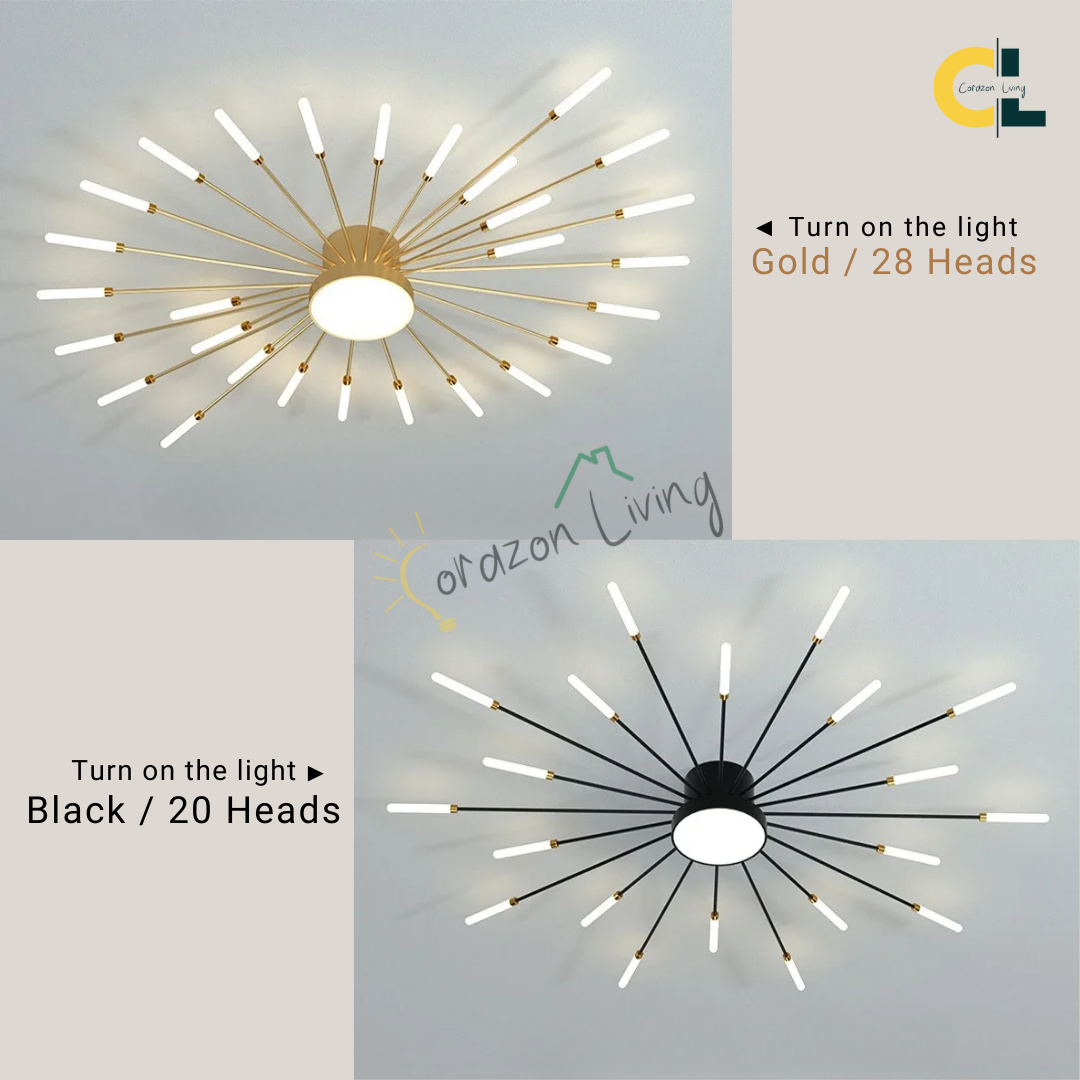 This LED ceiling light features a striking black and gold starburst design, combining modern elegance with radiant, eye-catching illumination.