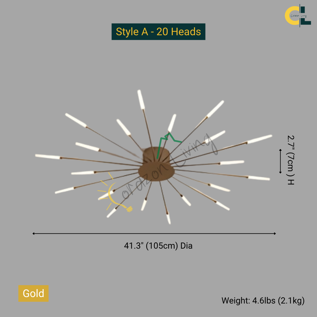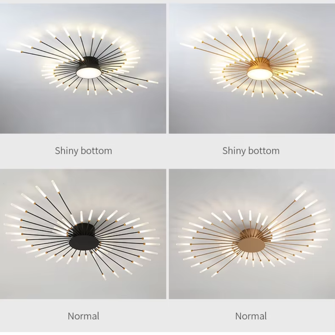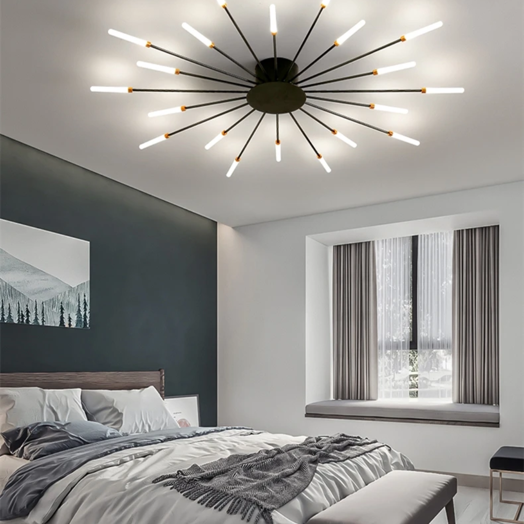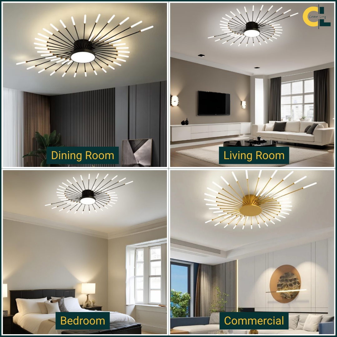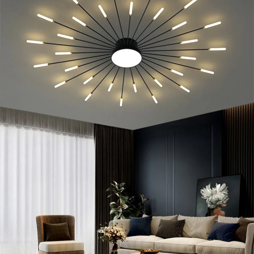 This LED ceiling light features a striking black and gold starburst design, combining modern elegance with radiant, eye-catching illumination.
