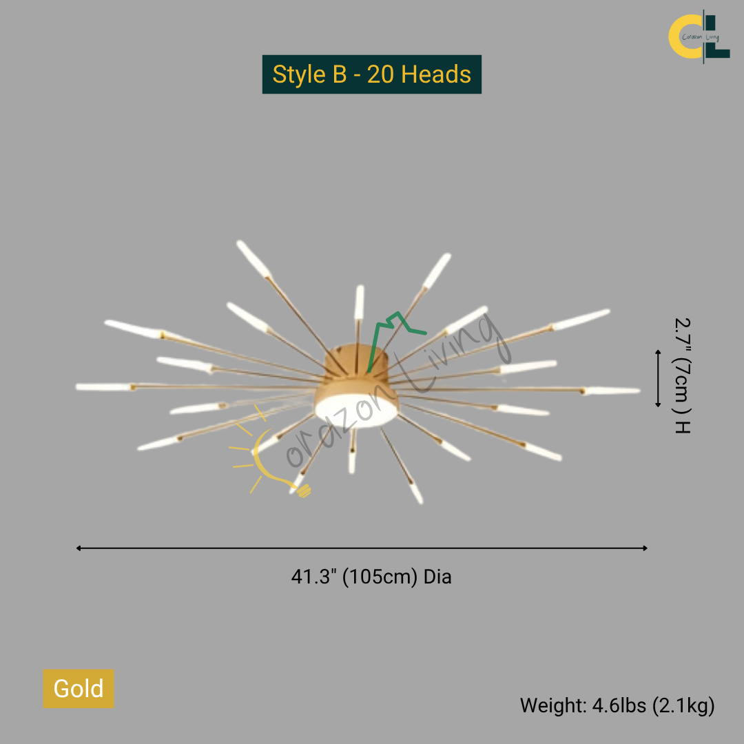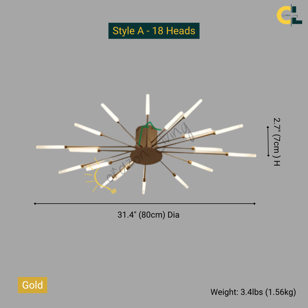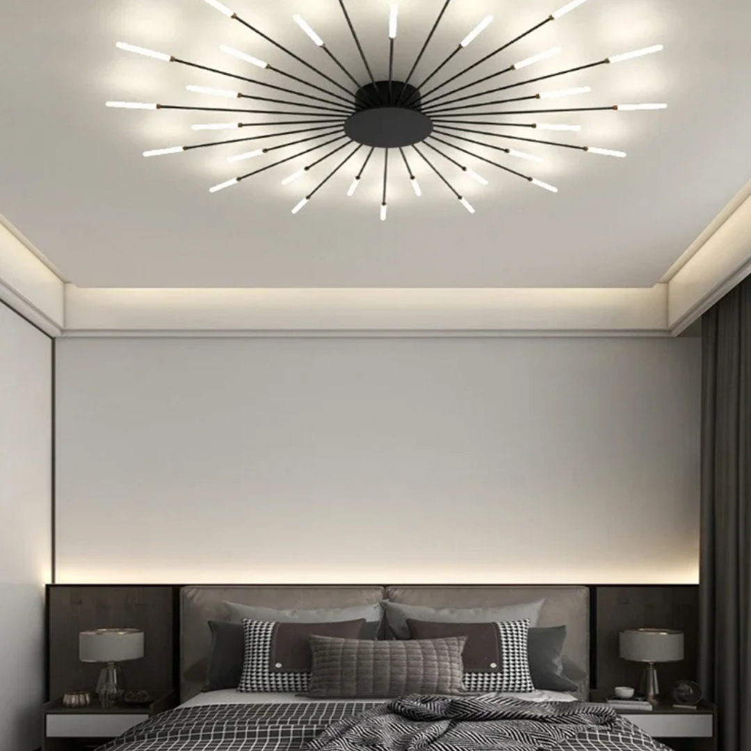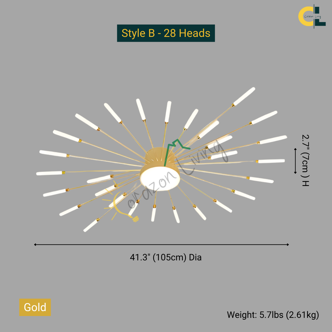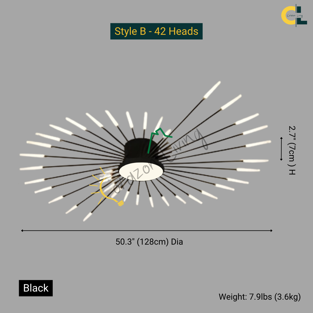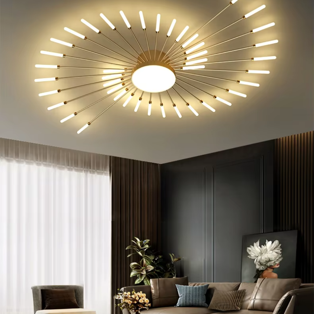 This LED ceiling light features a striking black and gold starburst design, combining modern elegance with radiant, eye-catching illumination.