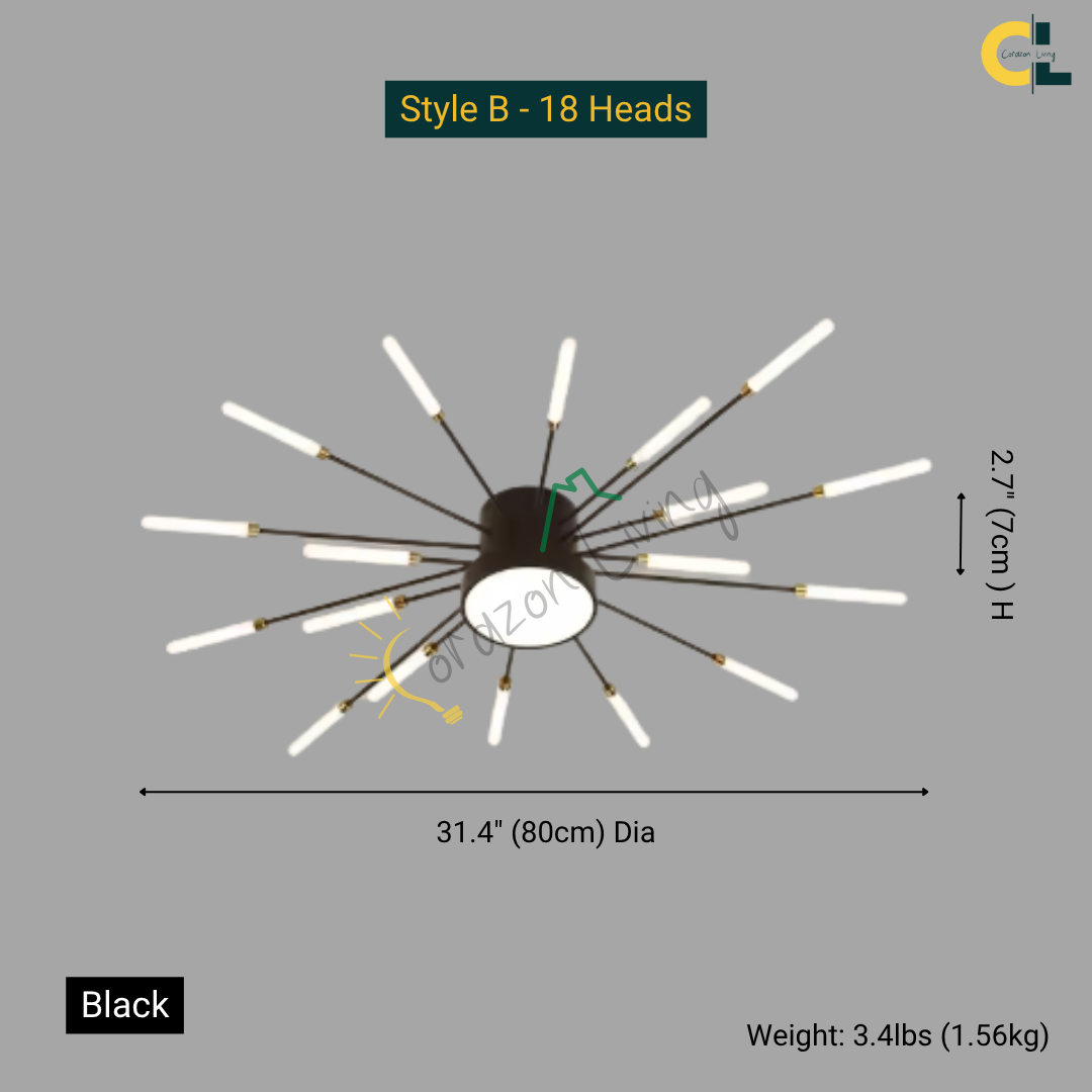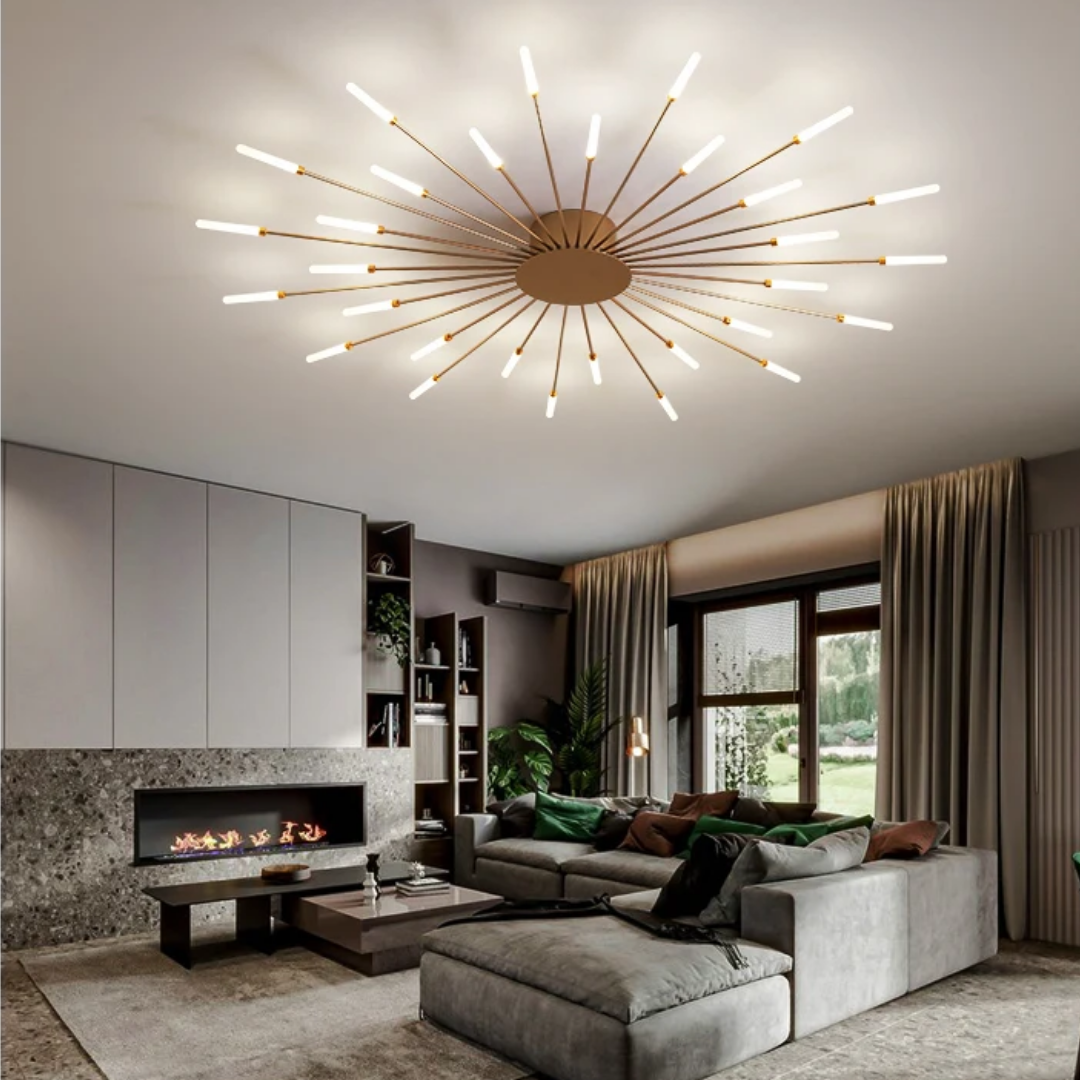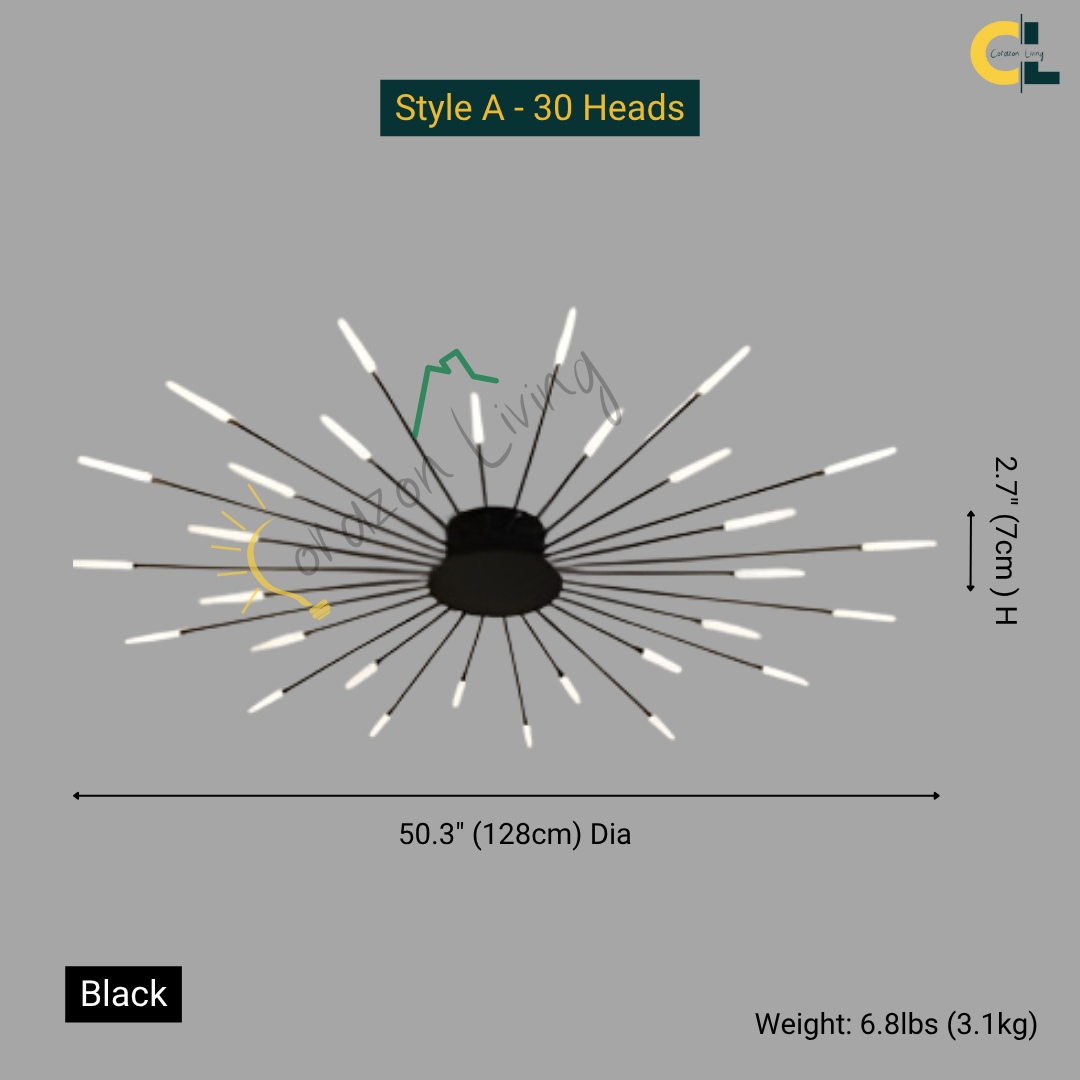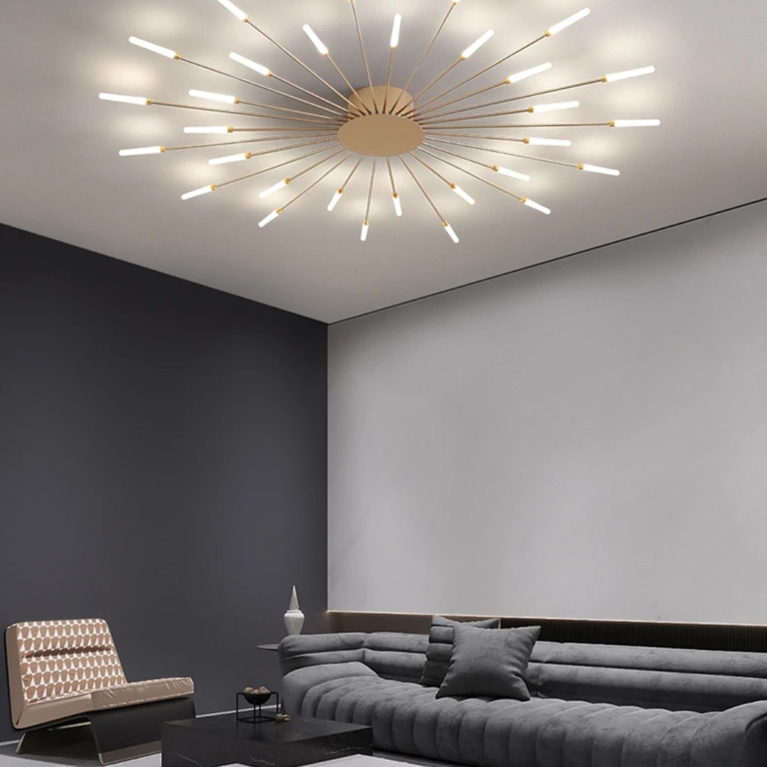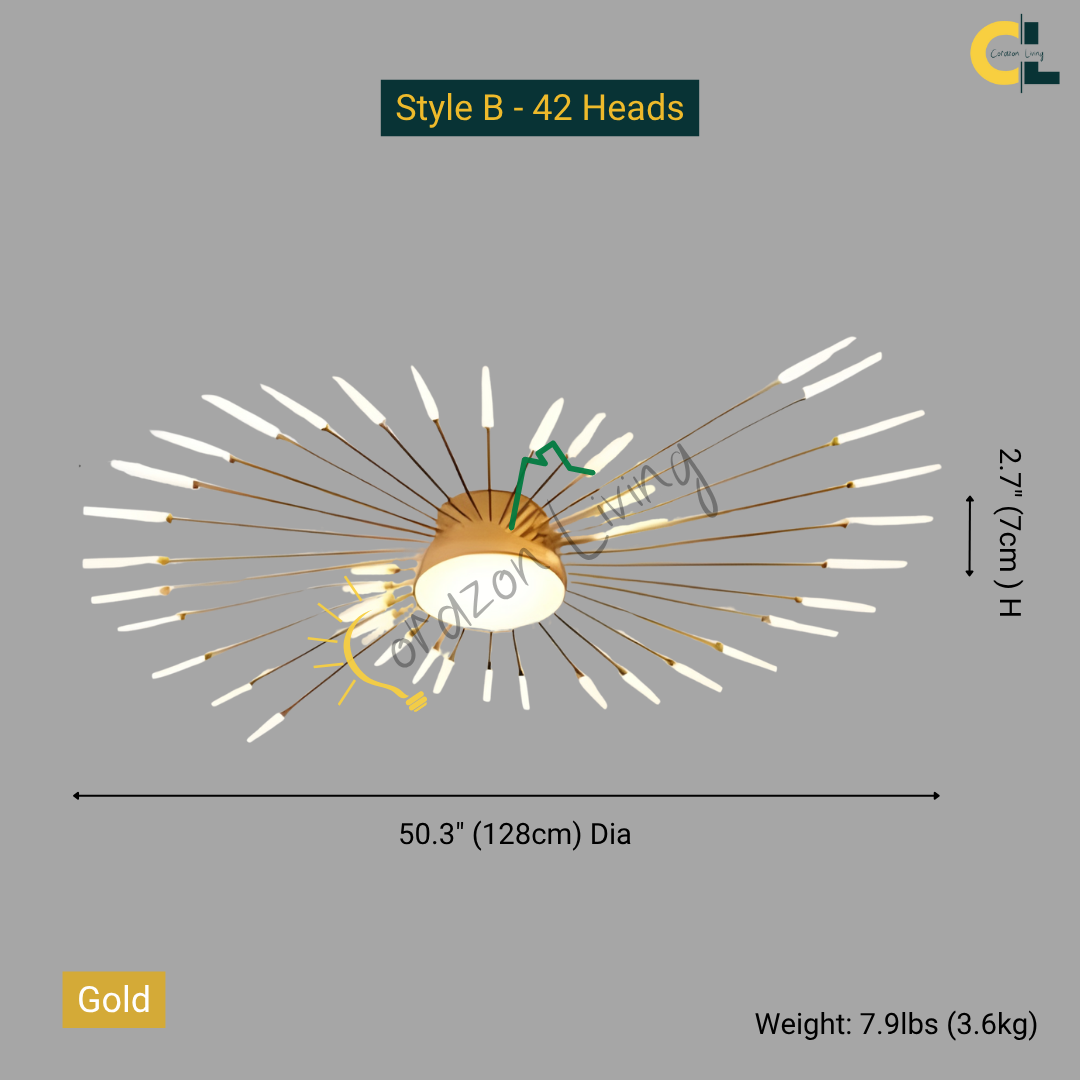 This LED ceiling light features a striking black and gold starburst design, combining modern elegance with radiant, eye-catching illumination.