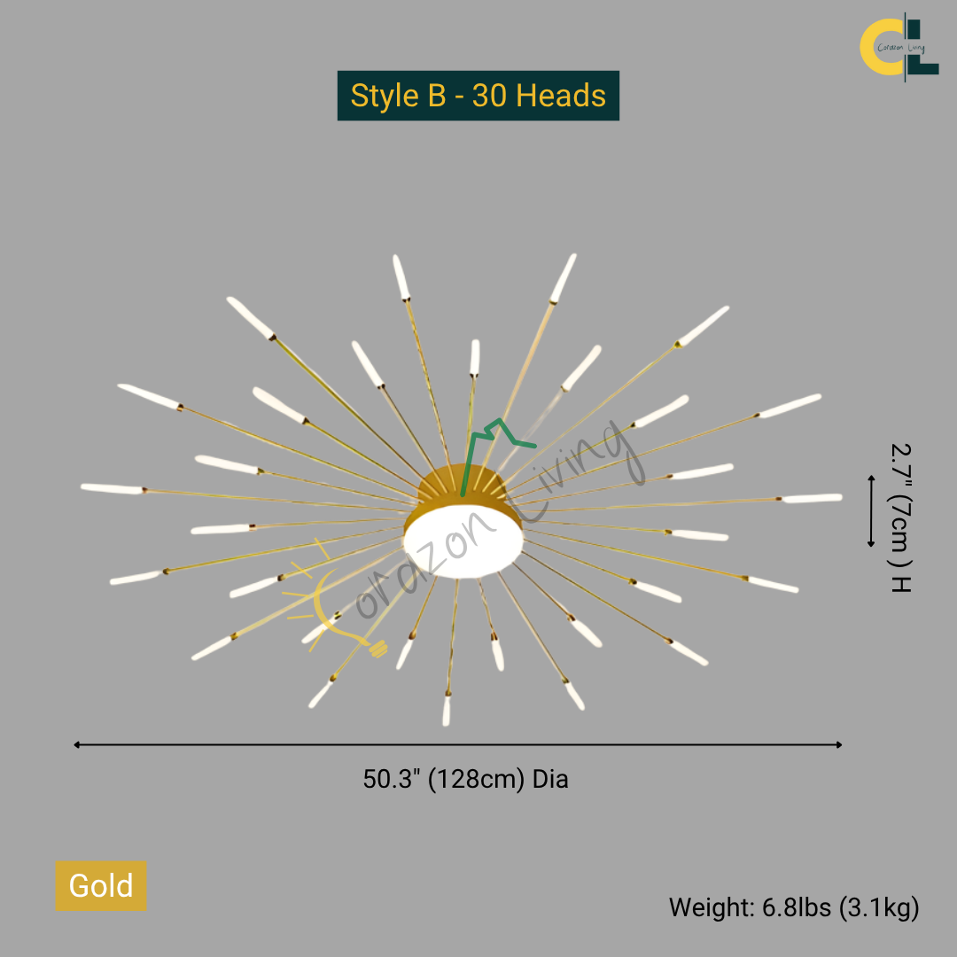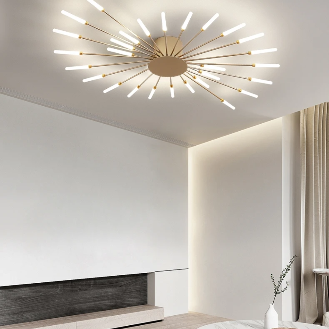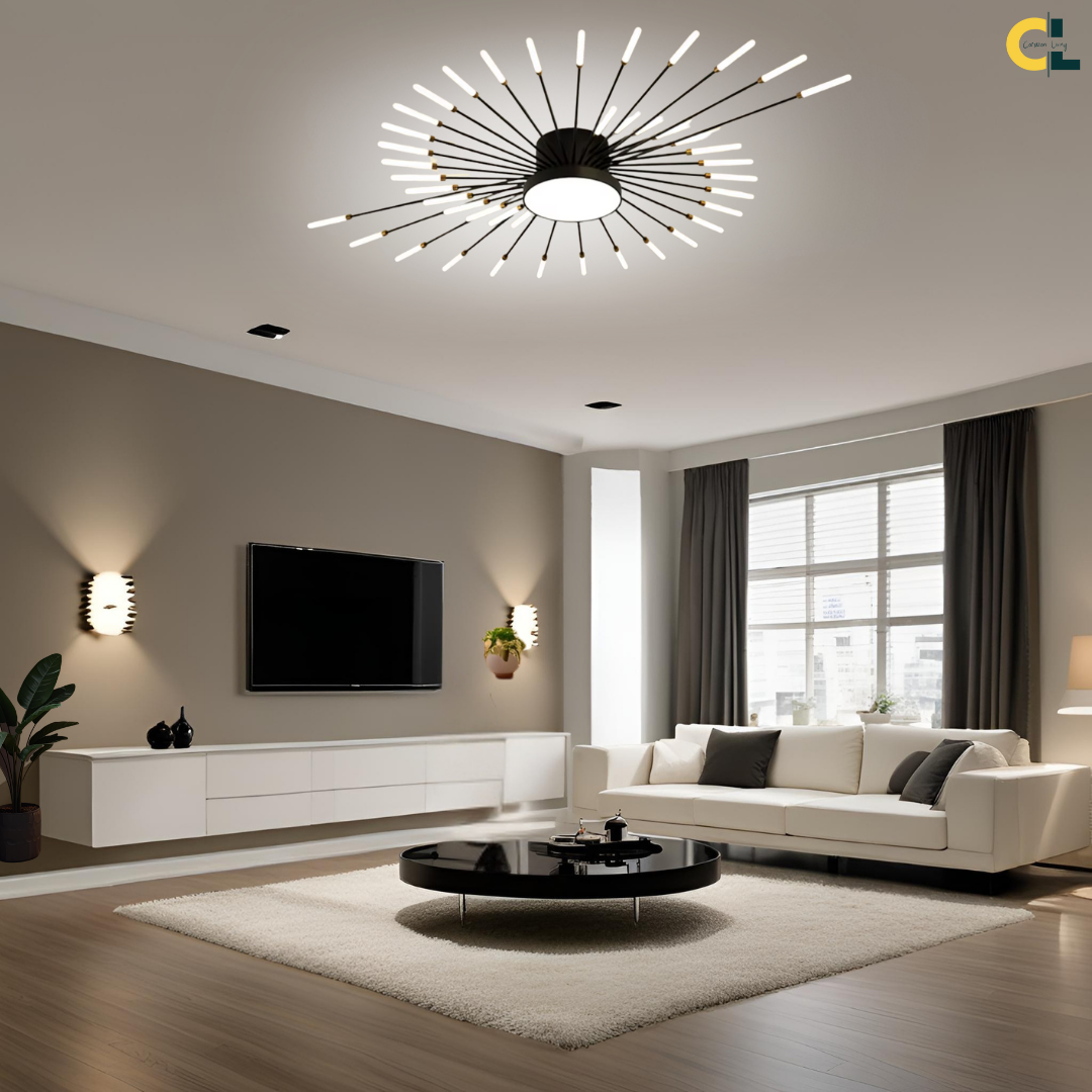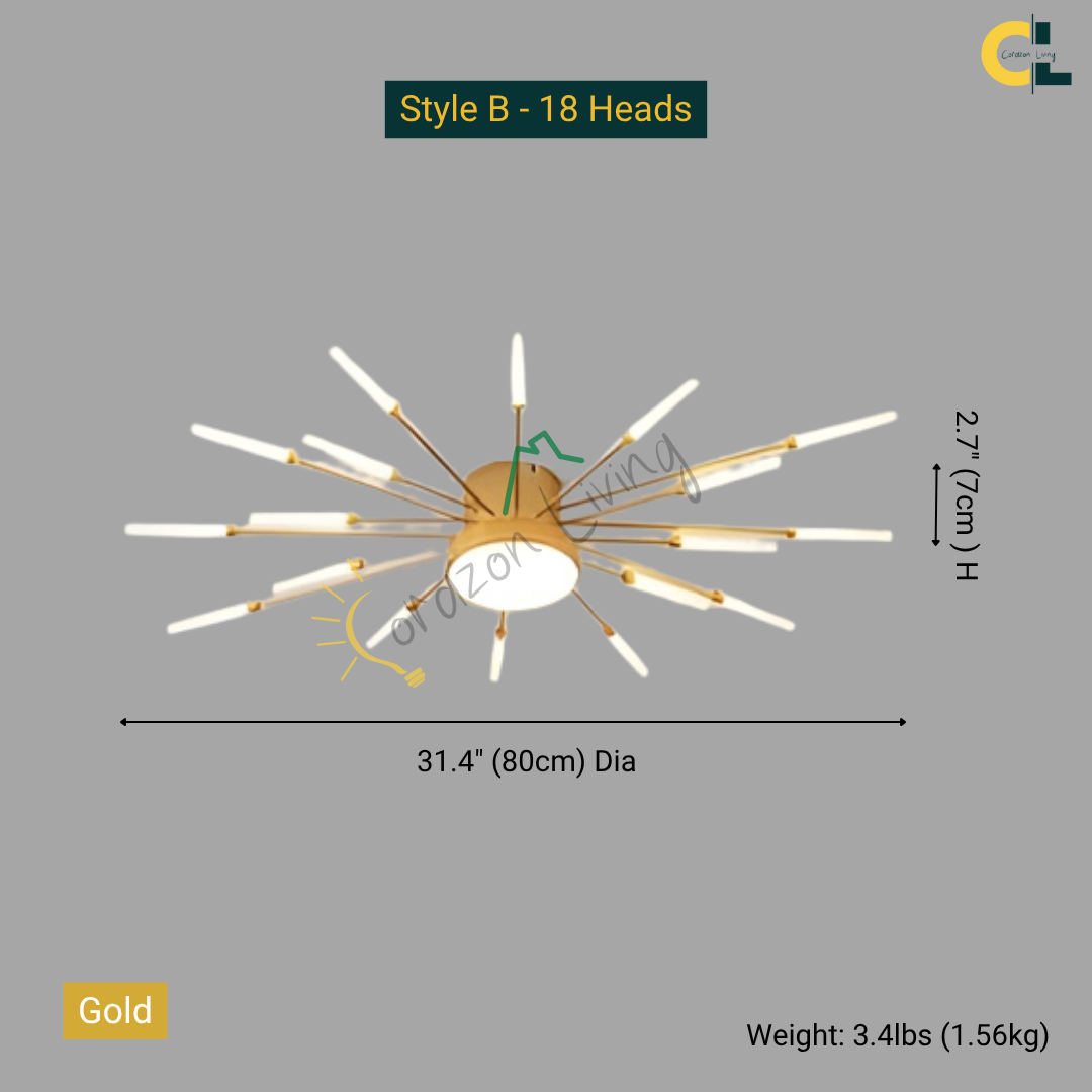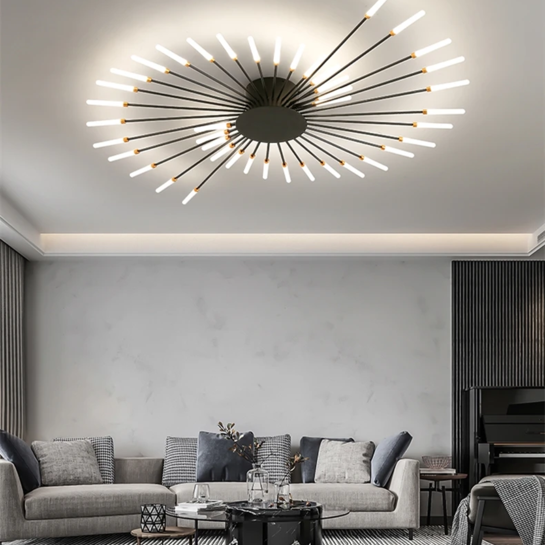 This LED ceiling light features a striking black and gold starburst design, combining modern elegance with radiant, eye-catching illumination.