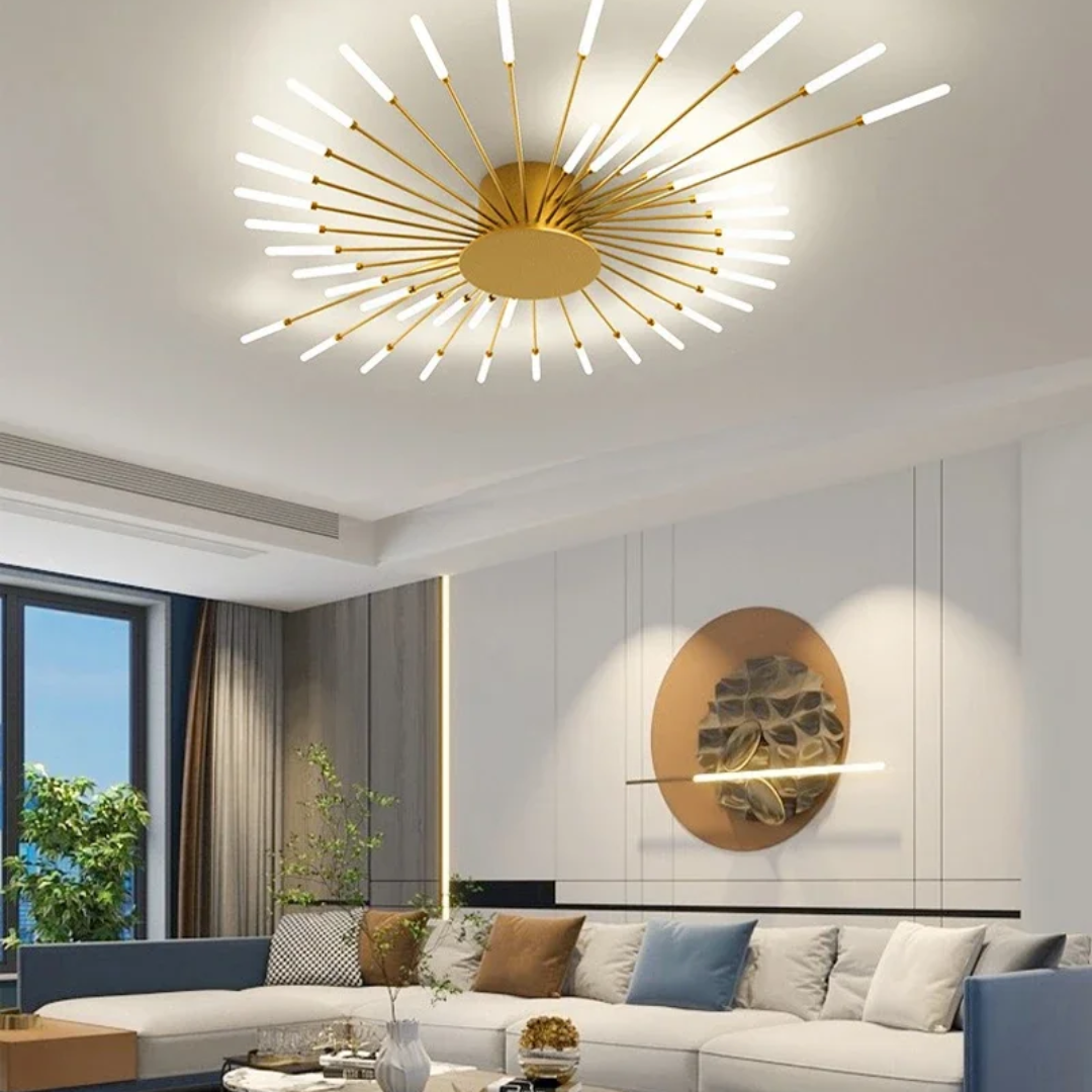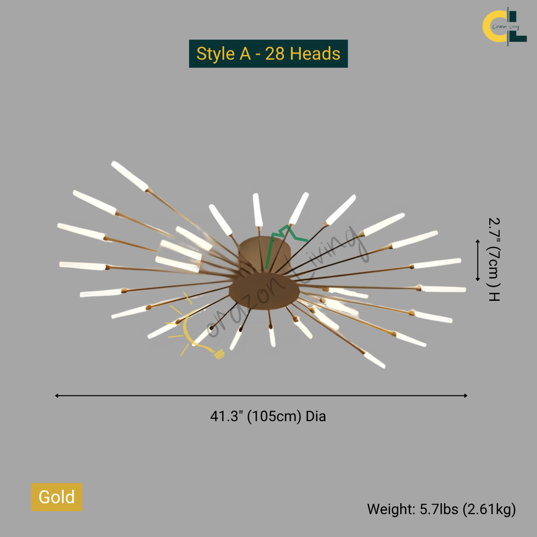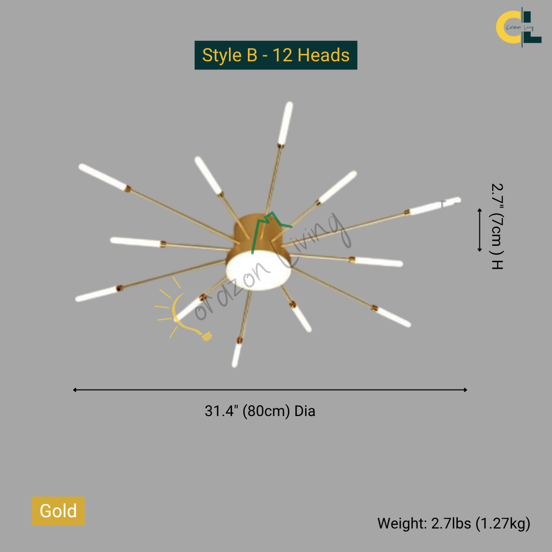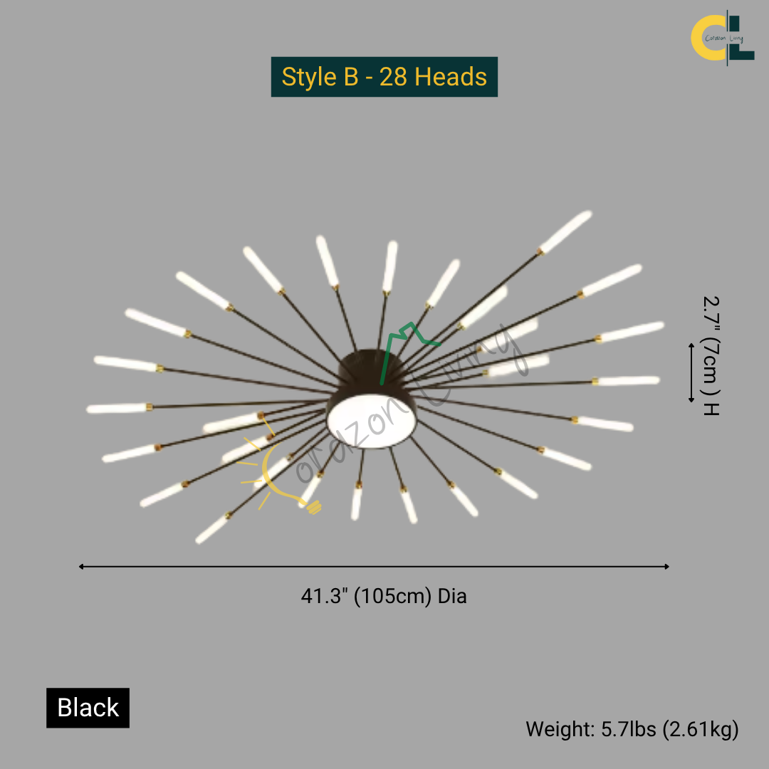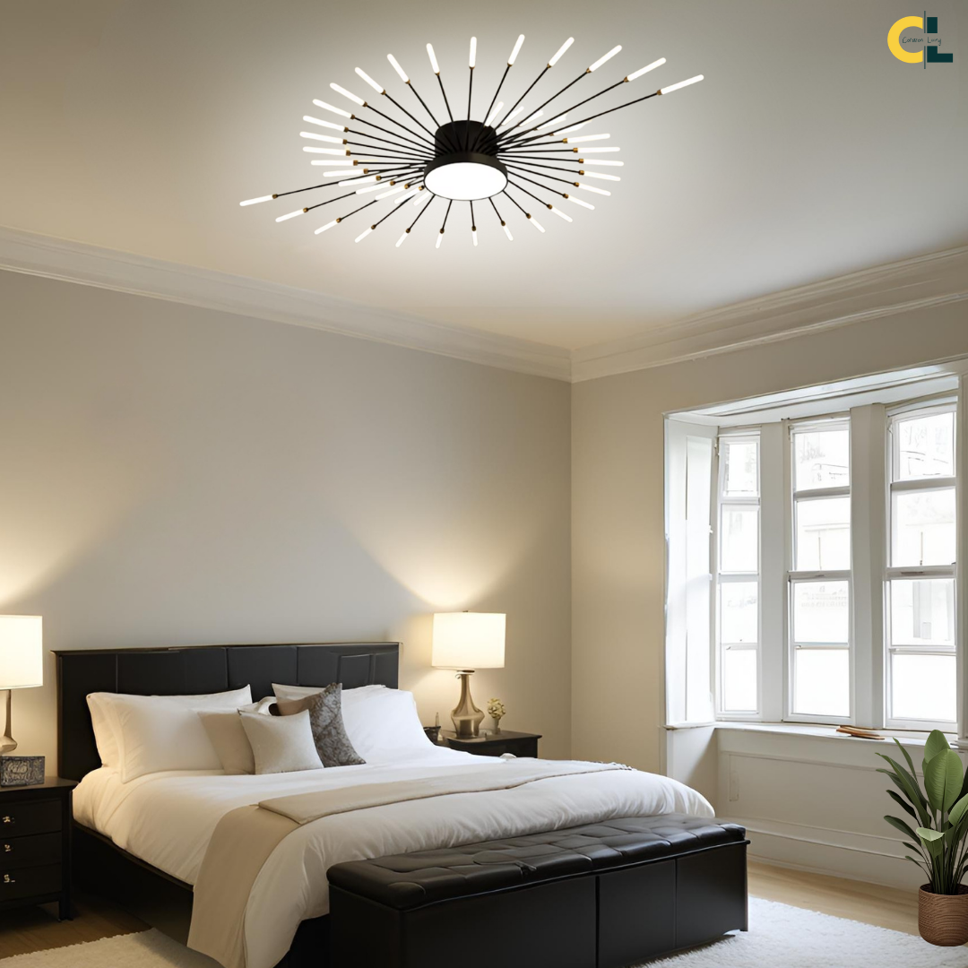 This LED ceiling light features a striking black and gold starburst design, combining modern elegance with radiant, eye-catching illumination.
