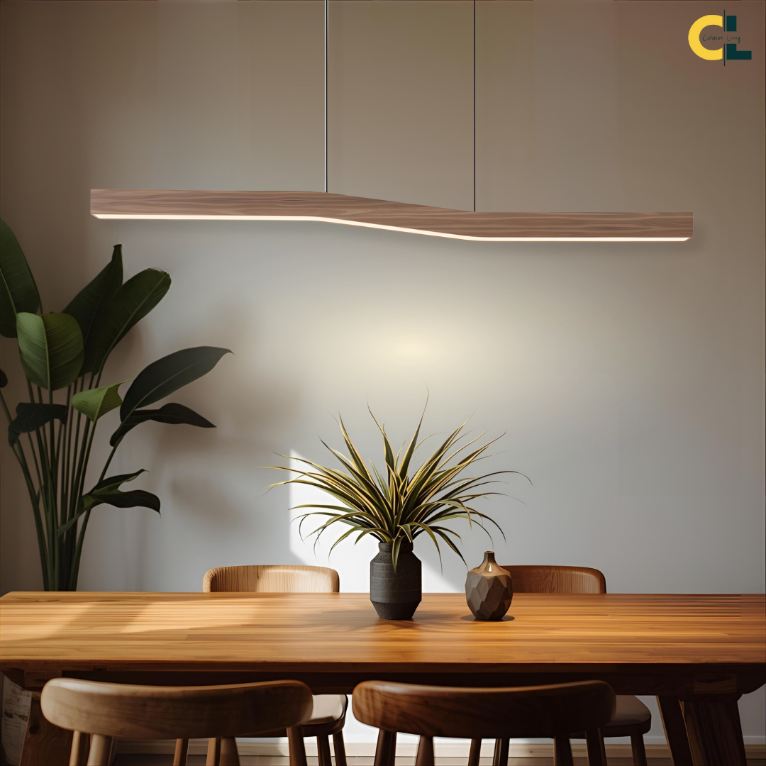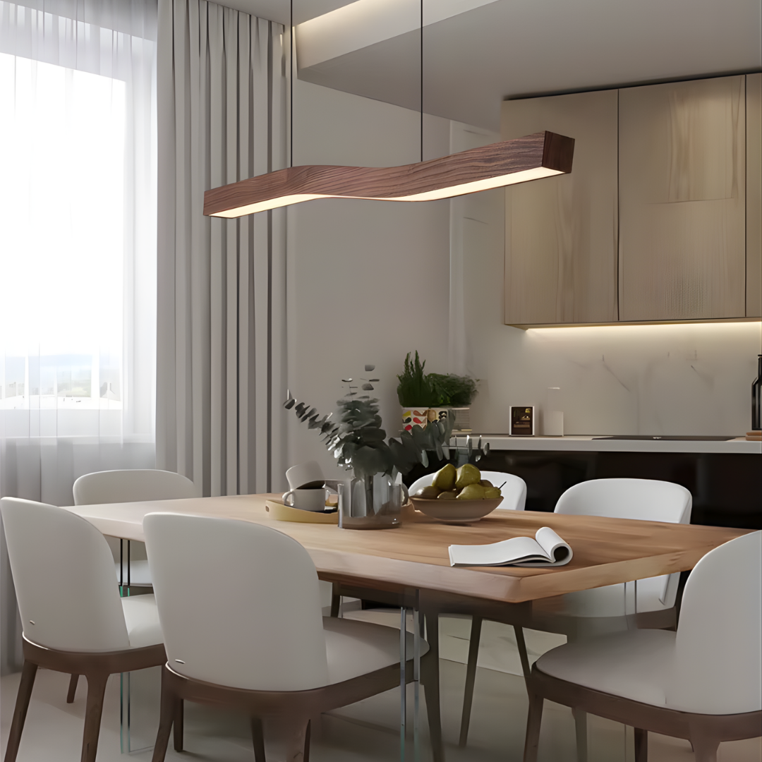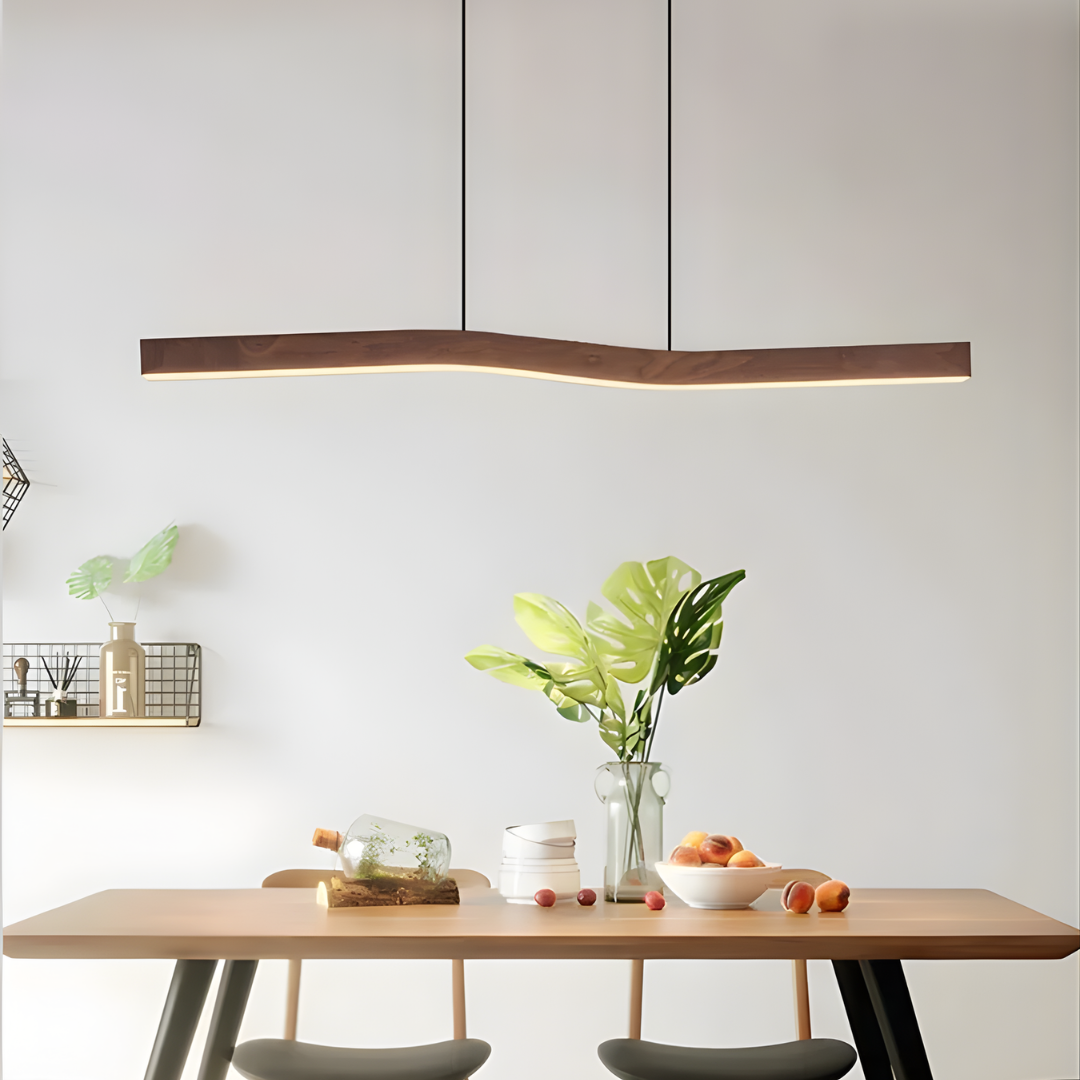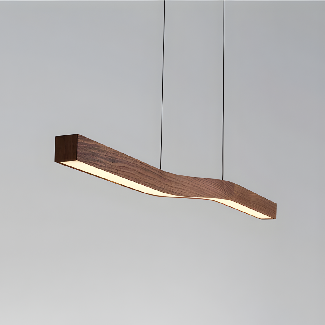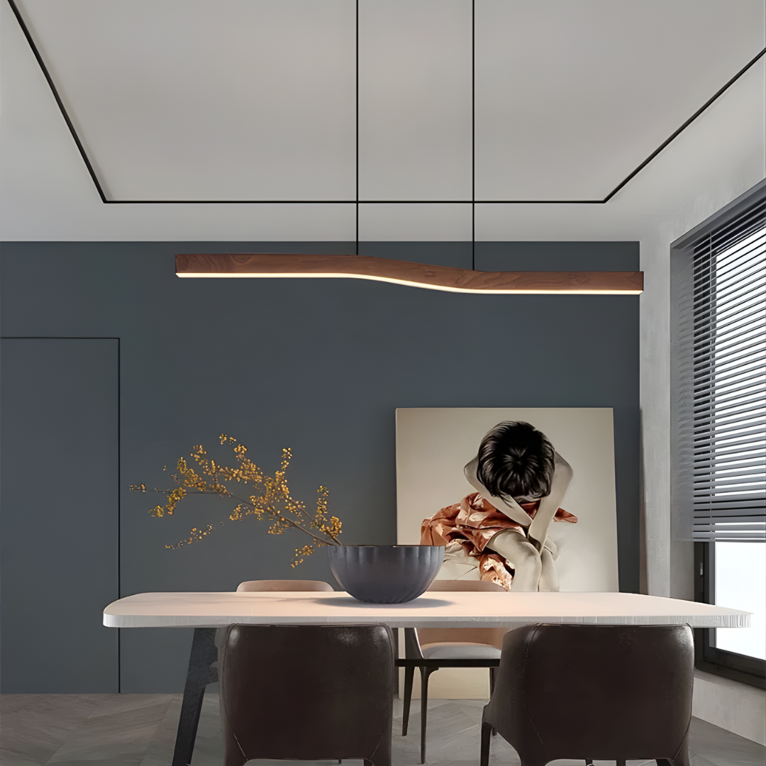 Embrace timeless simplicity and natural elegance with this Halune linear pendant light. Featuring a warm walnut wood grain finish and a long strip form, this minimalist fixture blends organic textures with modern functionality. Ideal for dining rooms, offices, or upscale interiors, this light creates a serene atmosphere with soft LED illumination. Its understated luxury and artistic design bring calm and refined creativity to any space.