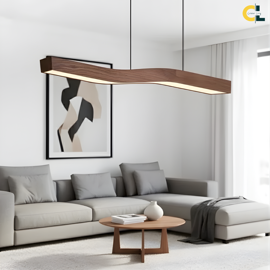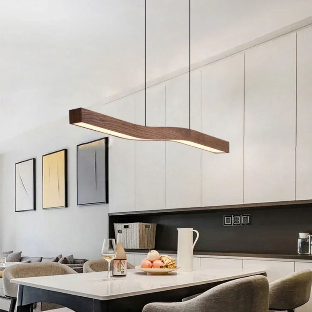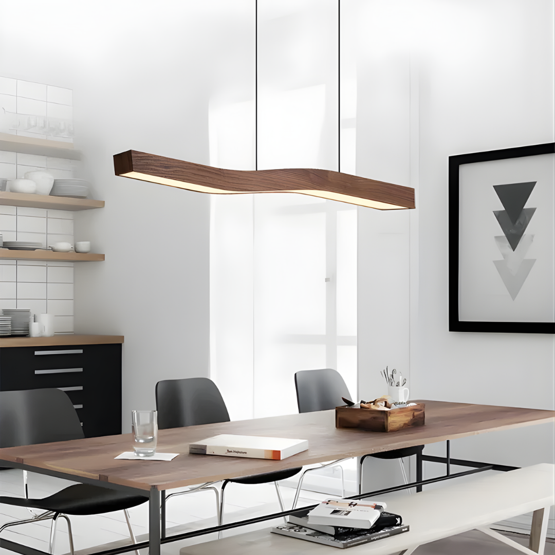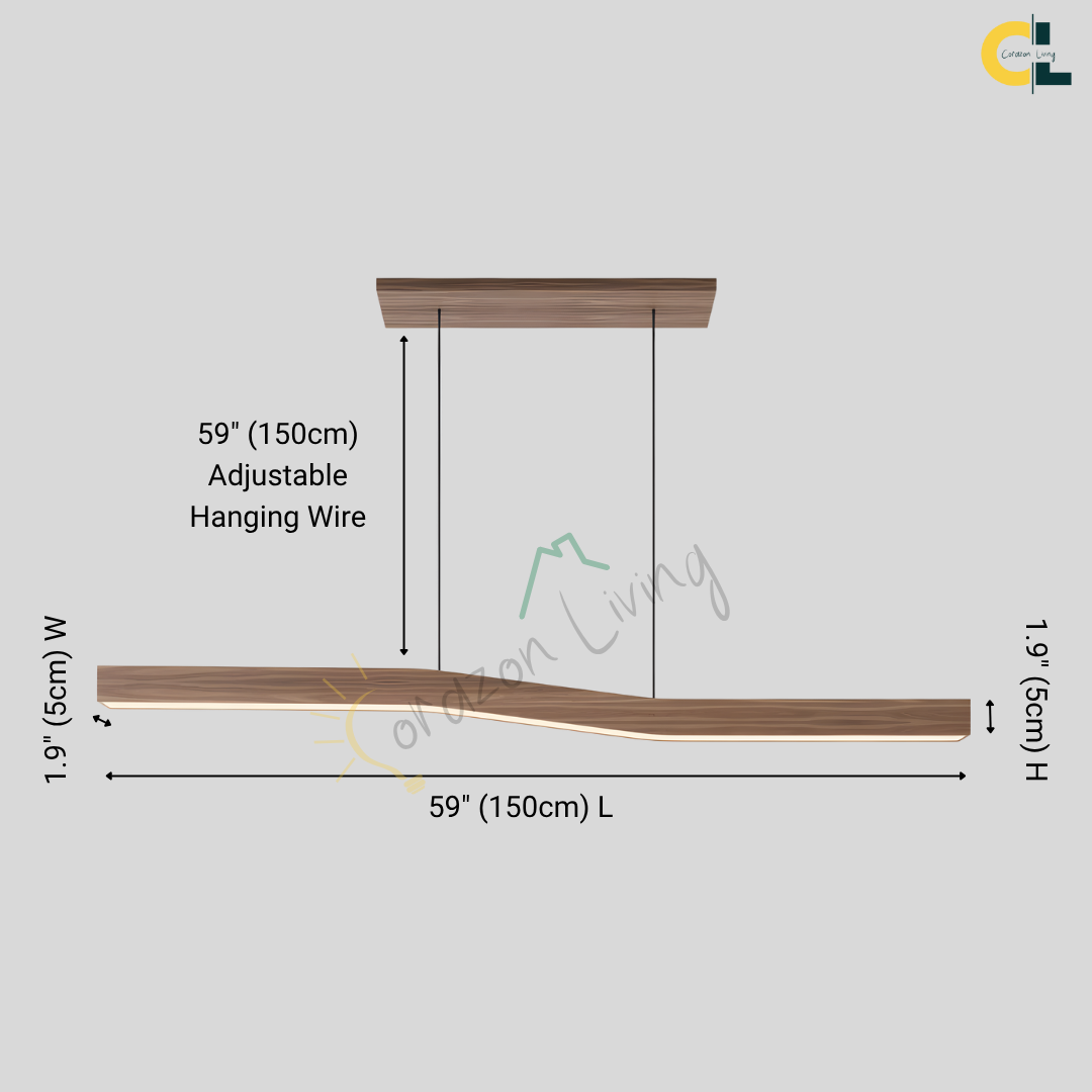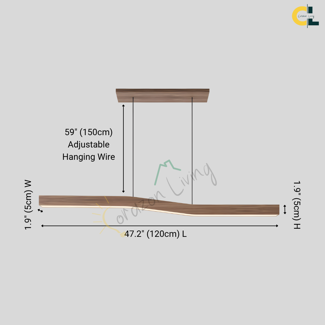 Embrace timeless simplicity and natural elegance with this Halune linear pendant light. Featuring a warm walnut wood grain finish and a long strip form, this minimalist fixture blends organic textures with modern functionality. Ideal for dining rooms, offices, or upscale interiors, this light creates a serene atmosphere with soft LED illumination. Its understated luxury and artistic design bring calm and refined creativity to any space.