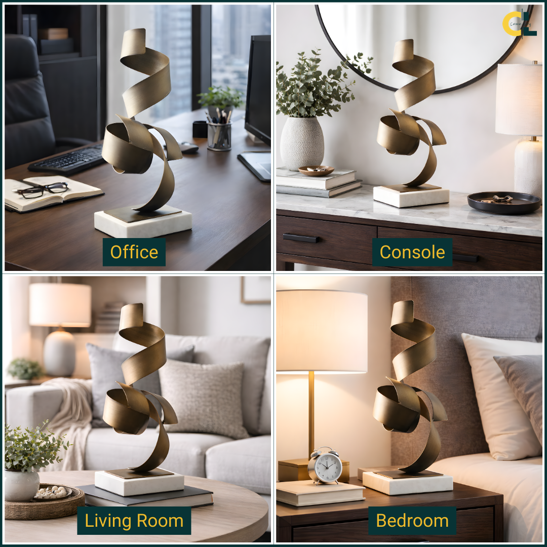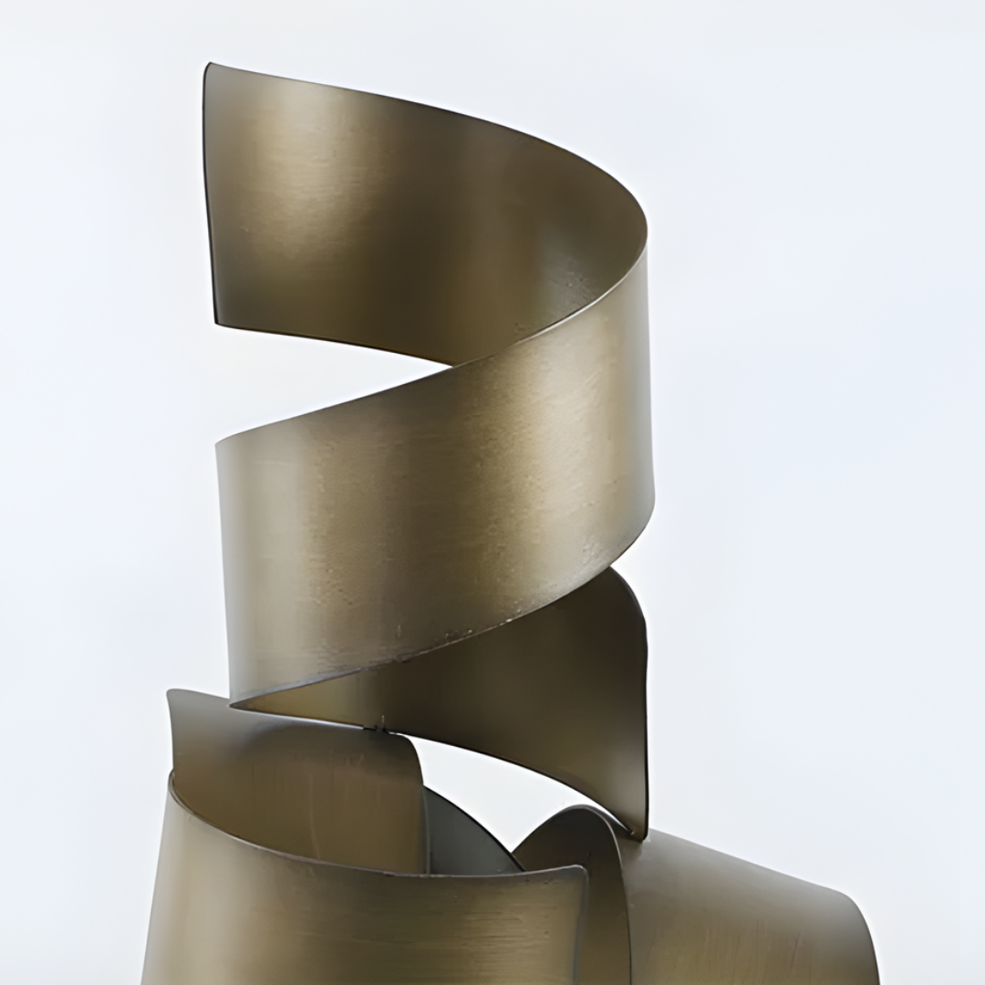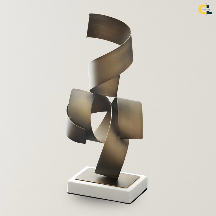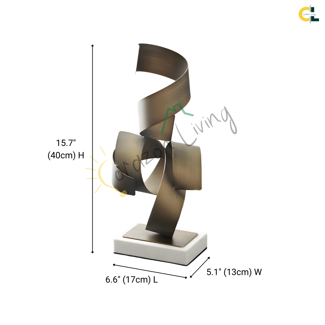 Iris is a sculptural tabletop accent designed to elevate modern spaces with quiet movement. Antique bronze finished steel ribbons twist into a refined helix form, set on a crisp white marble base for a clean, balanced look.
