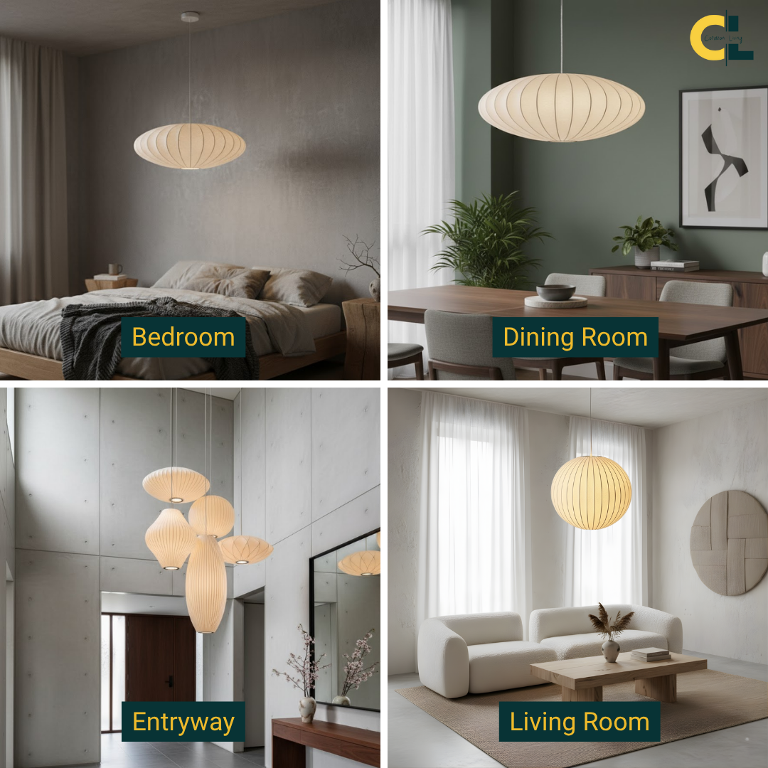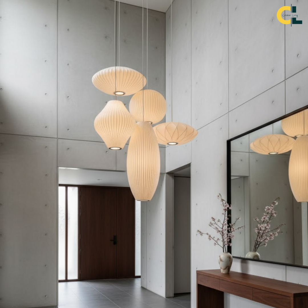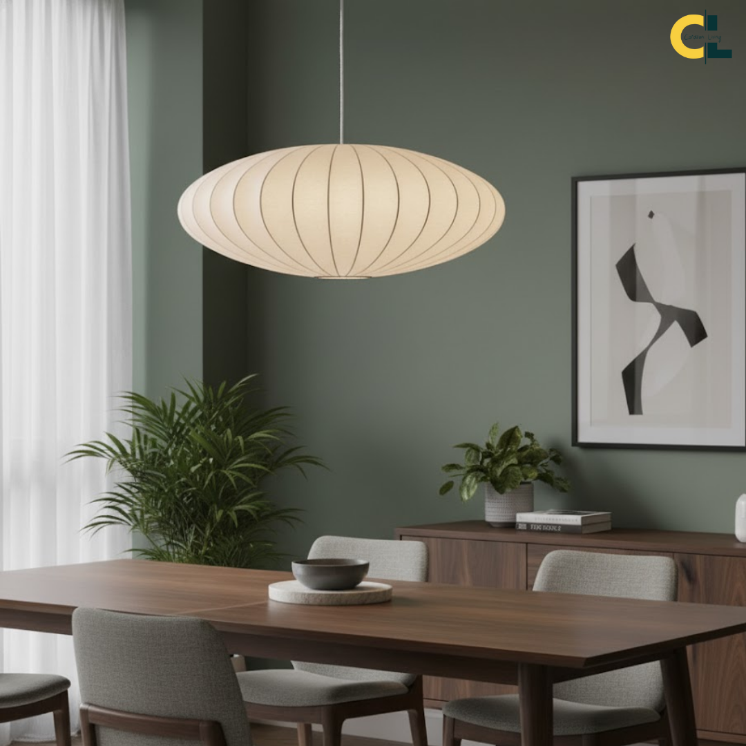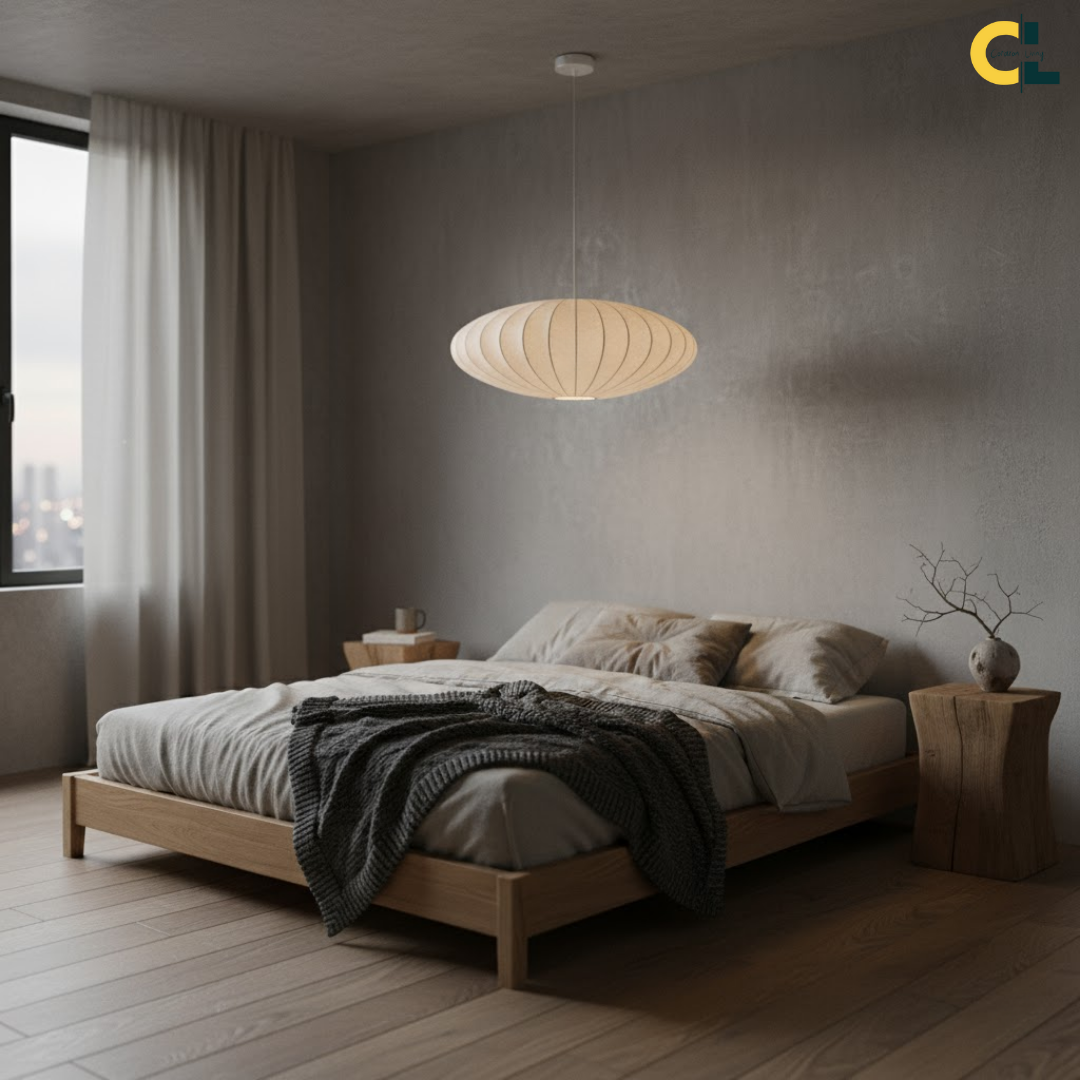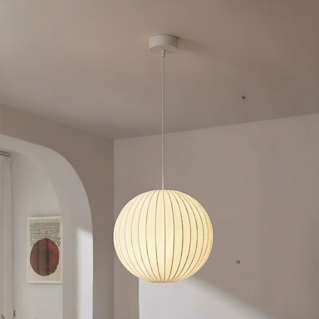 A minimalist Japanese-inspired pendant light with a soft silk shade that creates a warm, serene, and elegant ambiance for any interior.