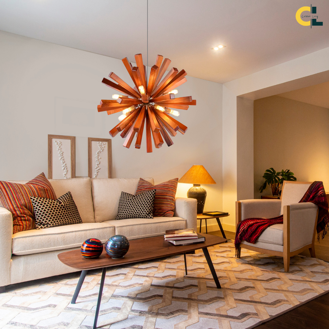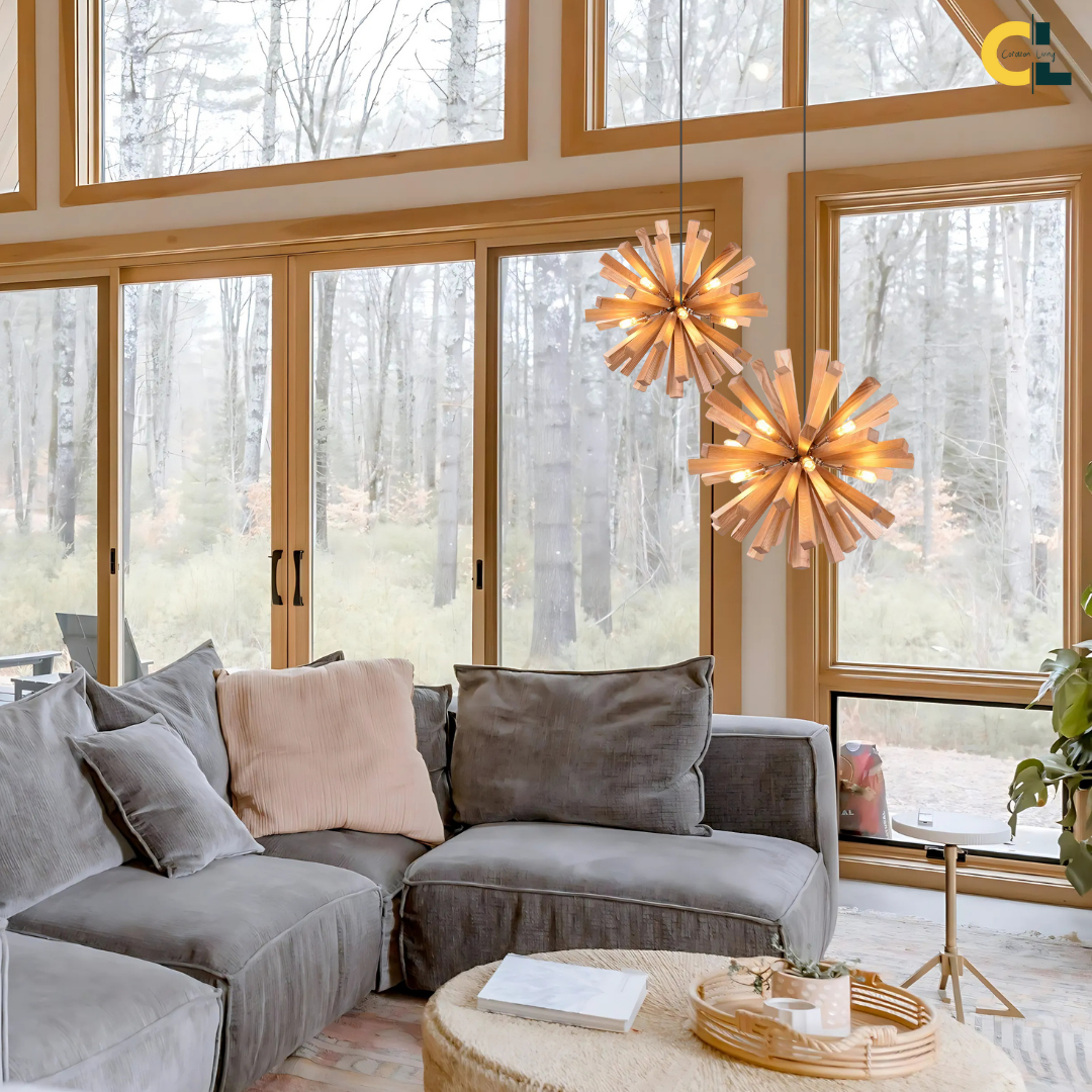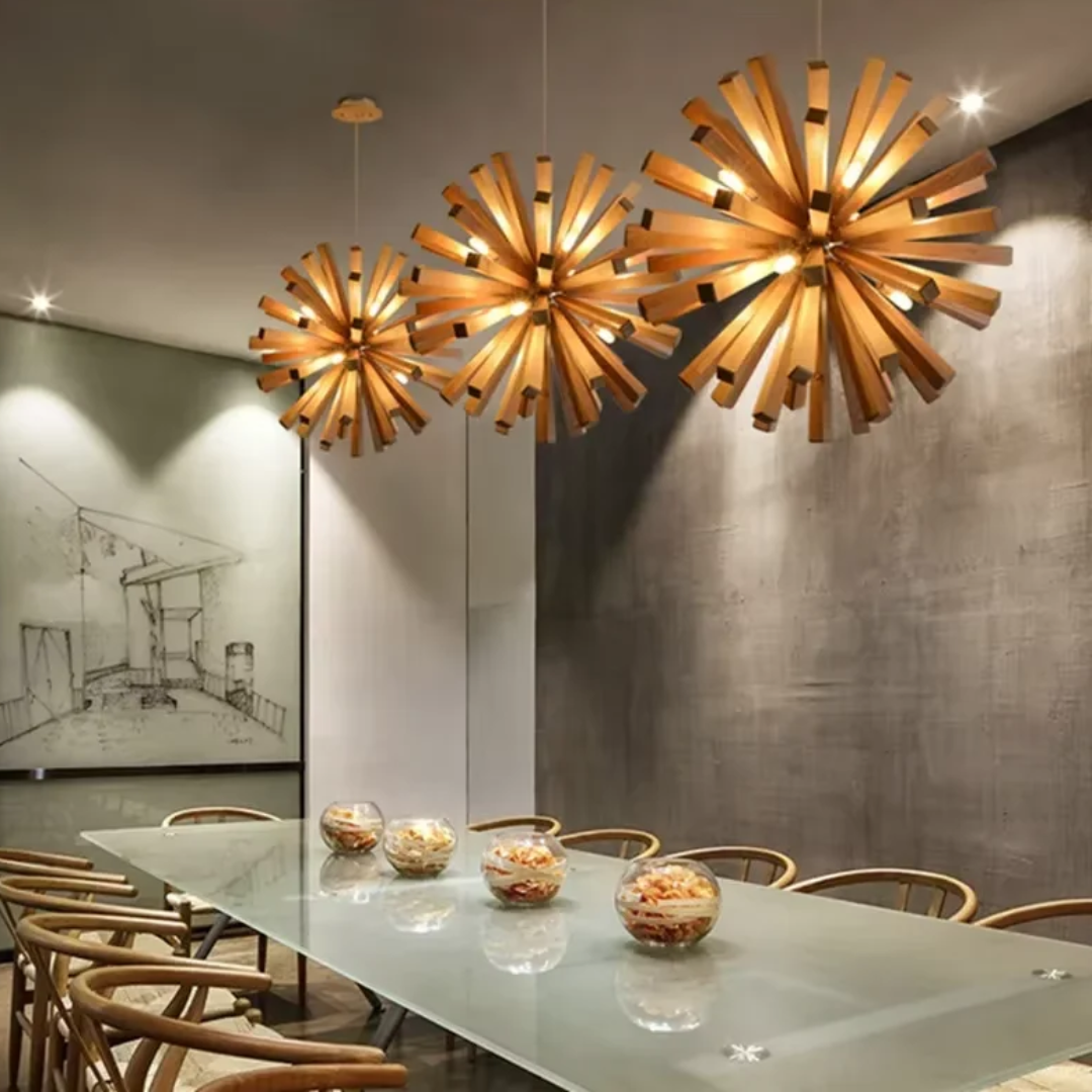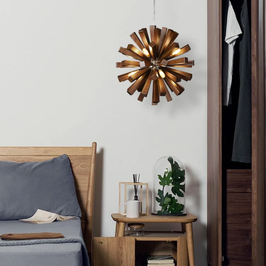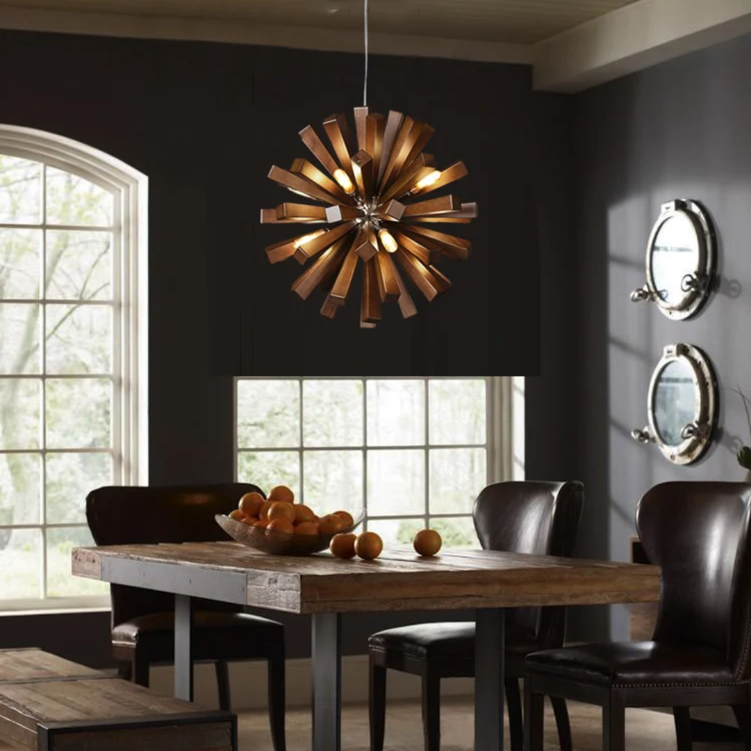 This rustic yet refined wooden pendant light features a satellite-style silhouette that diffuses light softly, creating a cozy, ambient glow. The perfect statement lighting for lovers of creative, handcrafted décor, it complements both modern and traditional interiors.