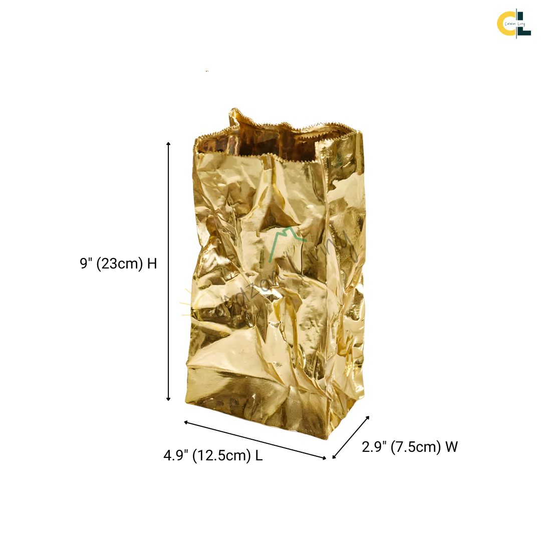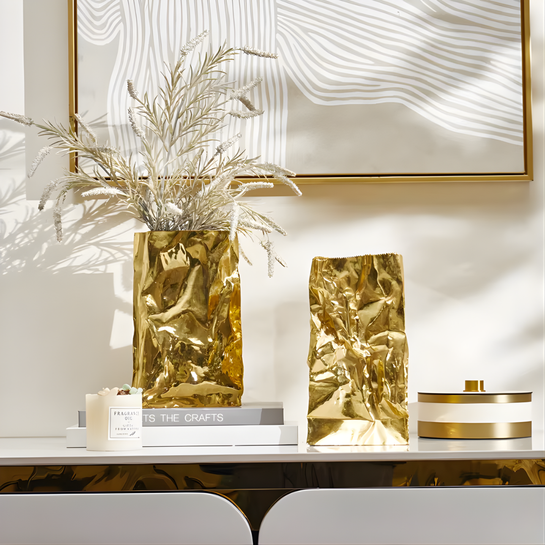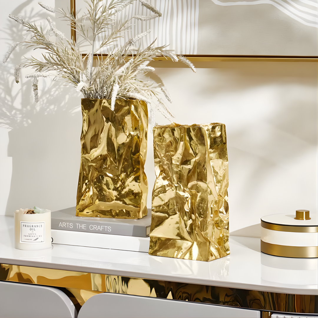 Loretta is a luxury gold flower vase designed to bring warm shine and sculptural texture to modern interiors. Its crinkled, artful surface reflects light softly, adding depth and a refined glow to your tabletop styling.