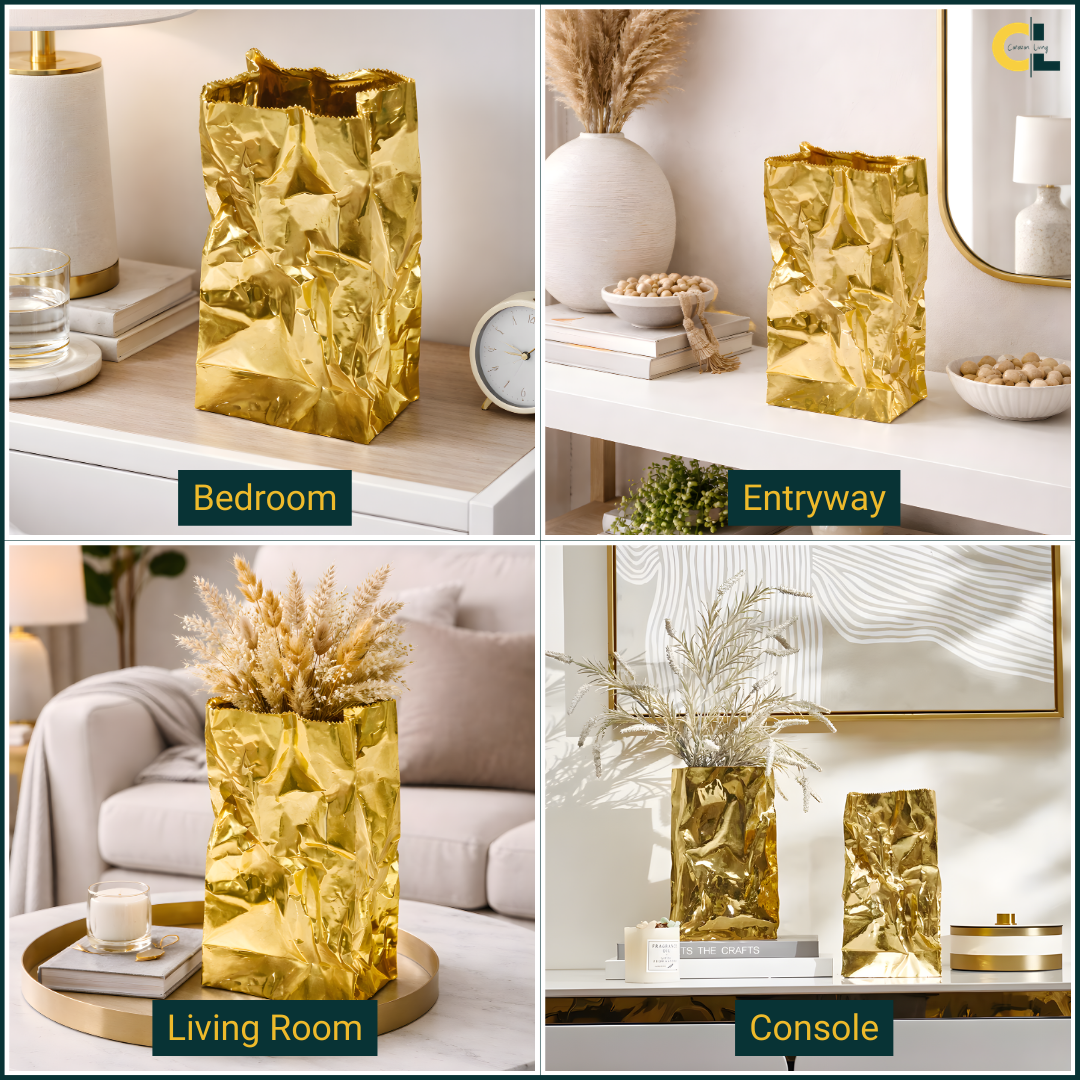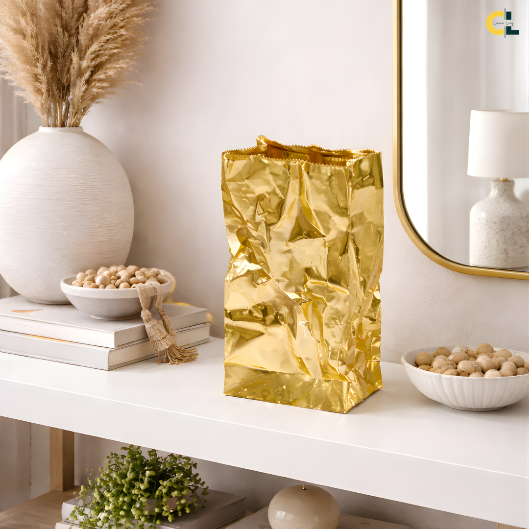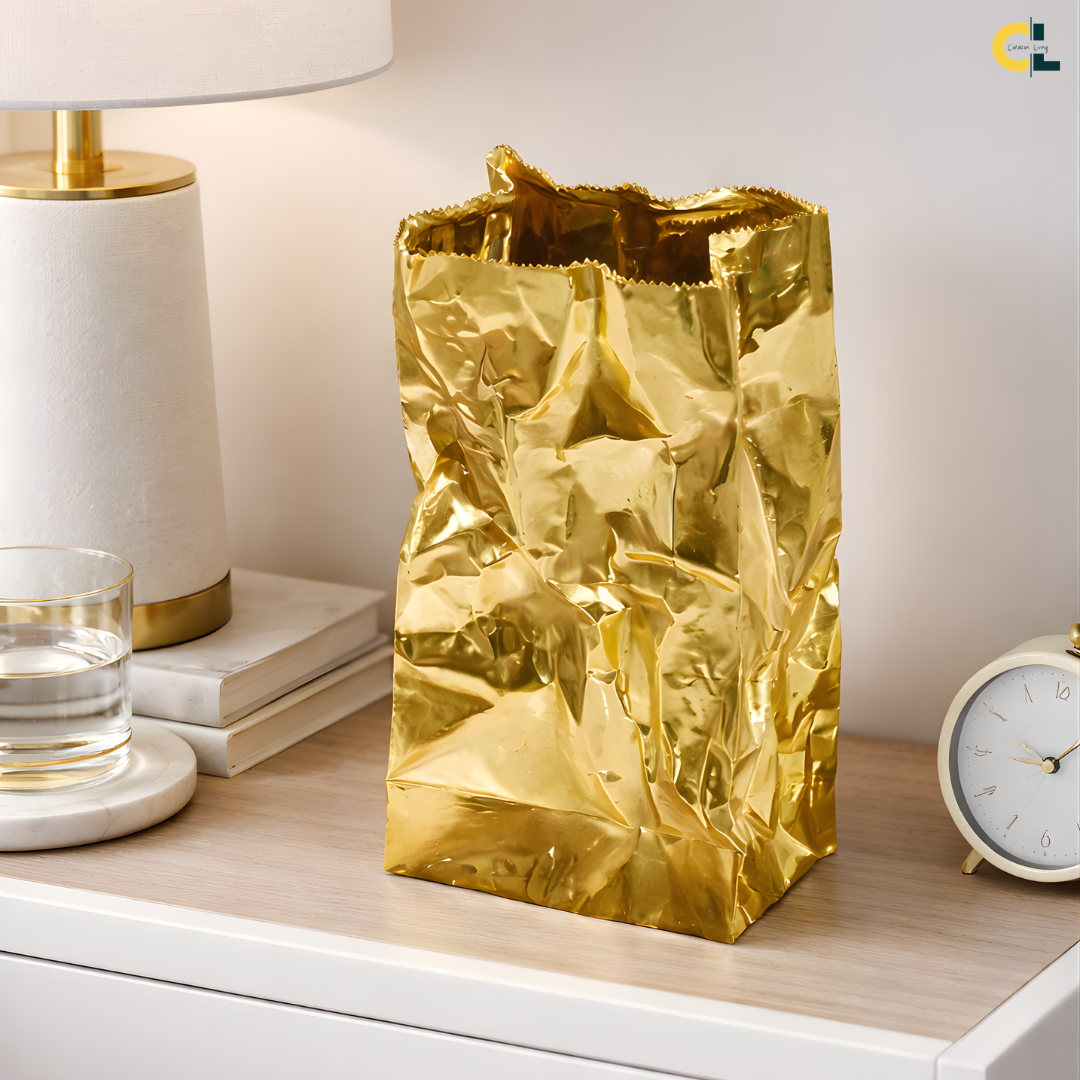Loretta is a luxury gold flower vase designed to bring warm shine and sculptural texture to modern interiors. Its crinkled, artful surface reflects light softly, adding depth and a refined glow to your tabletop styling.