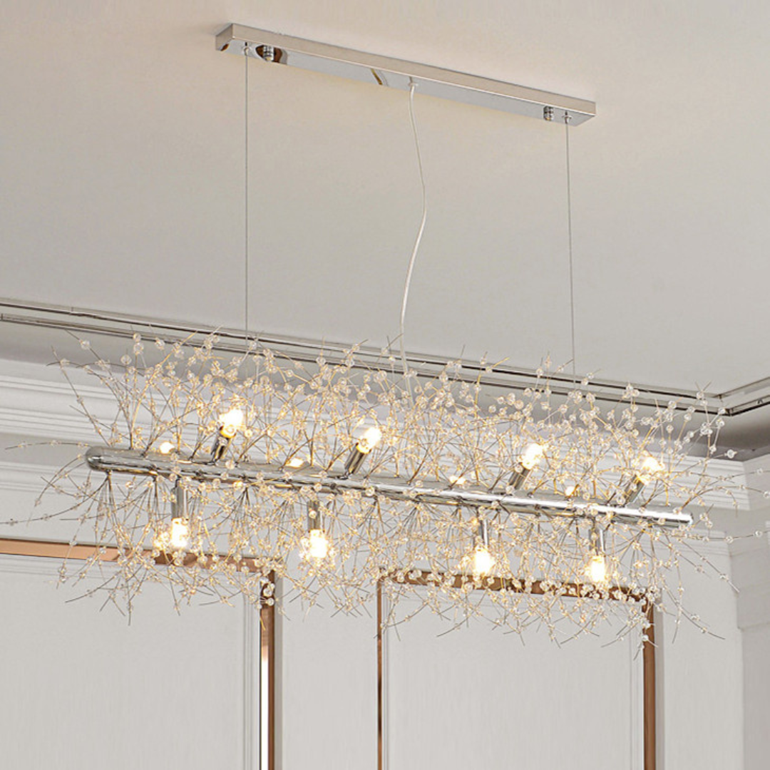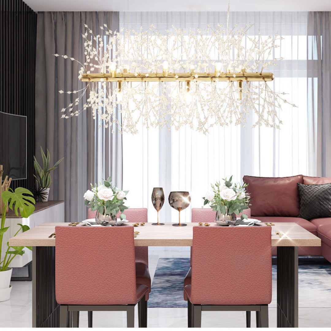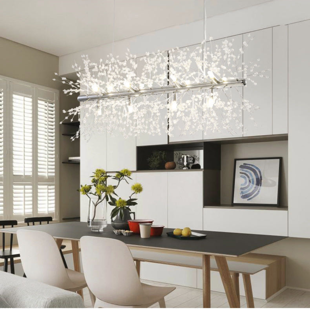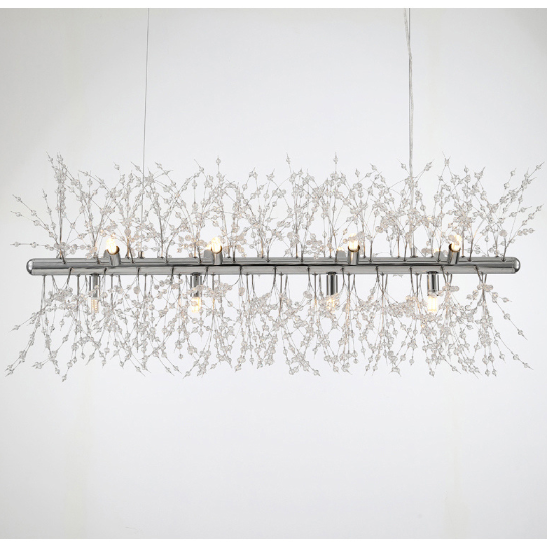 Its branch inspired design provides balanced illumination making it ideal for living spaces dining areas restaurants or boutique hotels. Available in chrome or gold finishes this chandelier features adjustable hanging cords for a refined contemporary look.