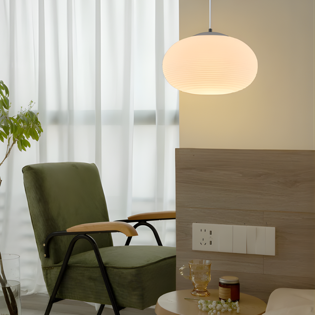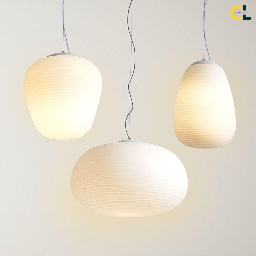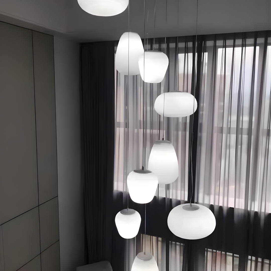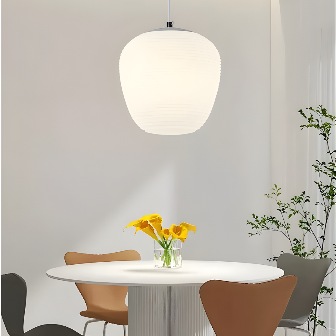 Modern design with smooth milky white glass shades creates warm, inviting illumination for versatile interior spaces.