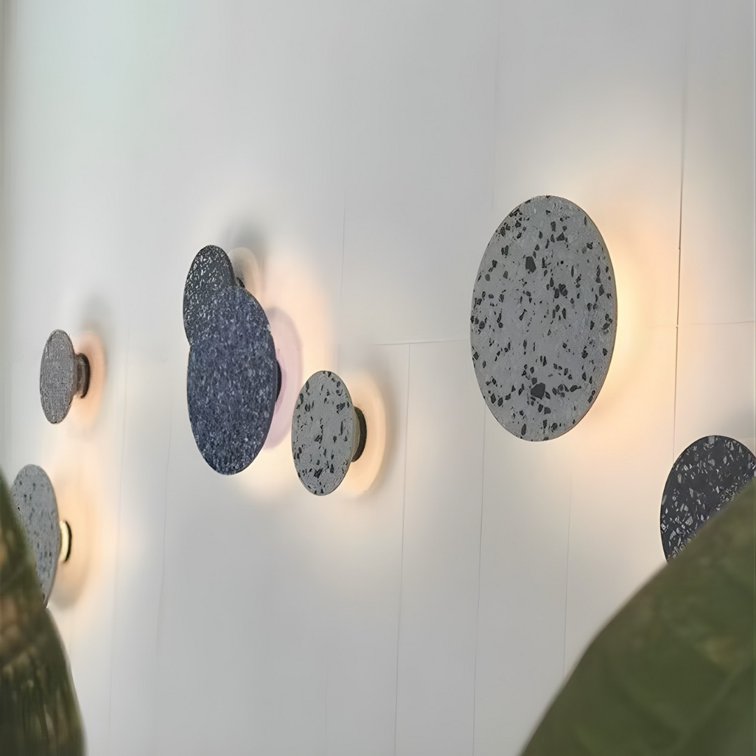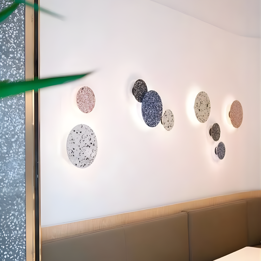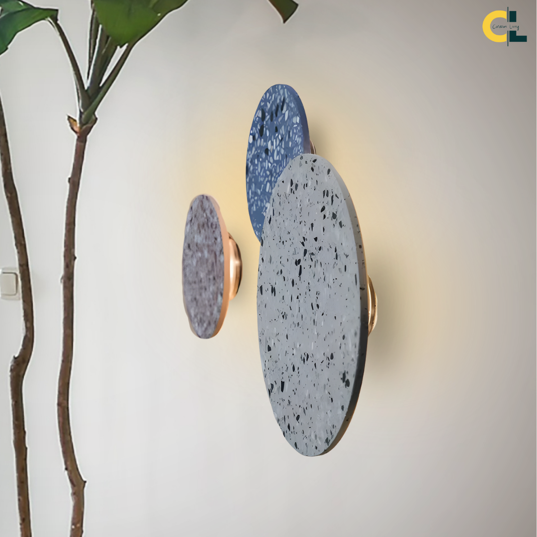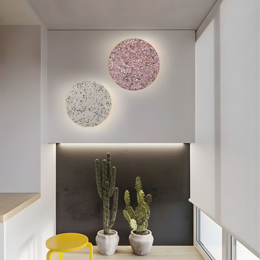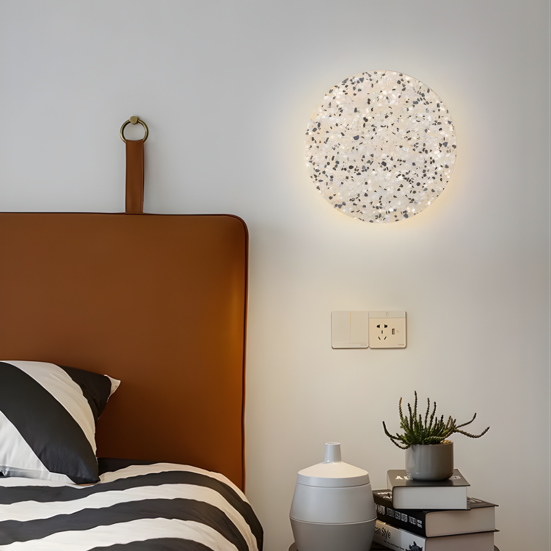 A modern terrazzo wall light crafted with iron, offering soft ambient illumination, vibrant color options, and versatile lighting tones for artistic elegance.