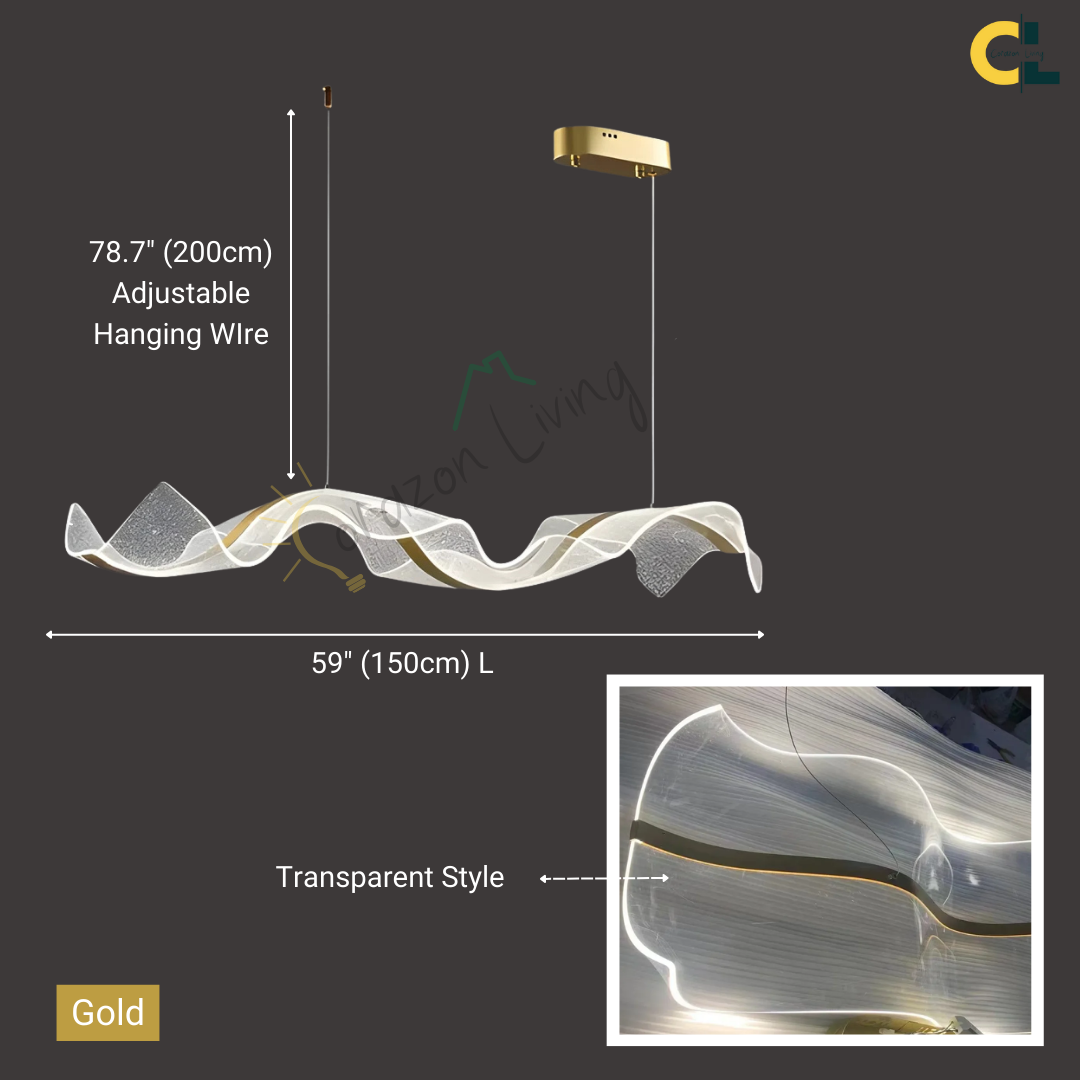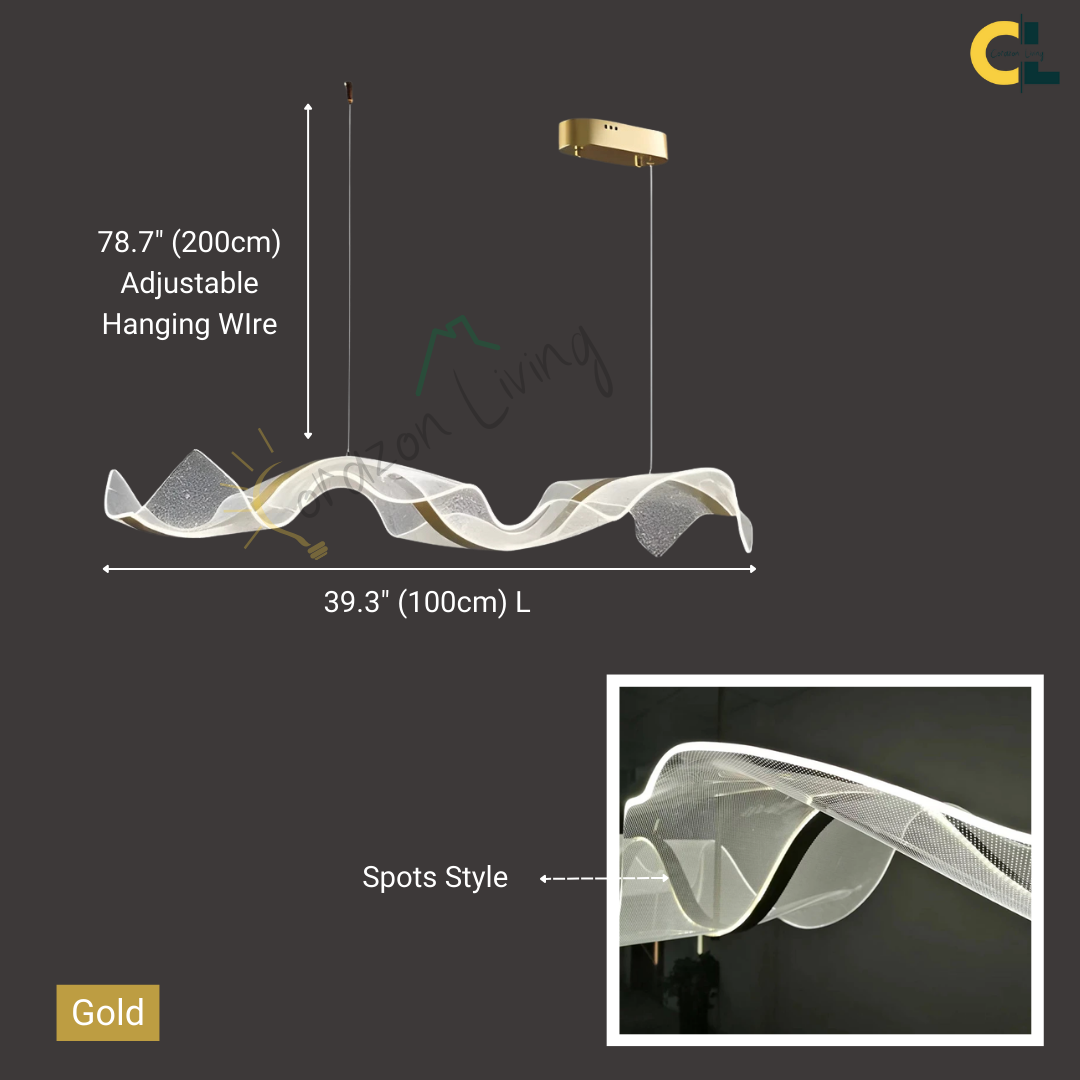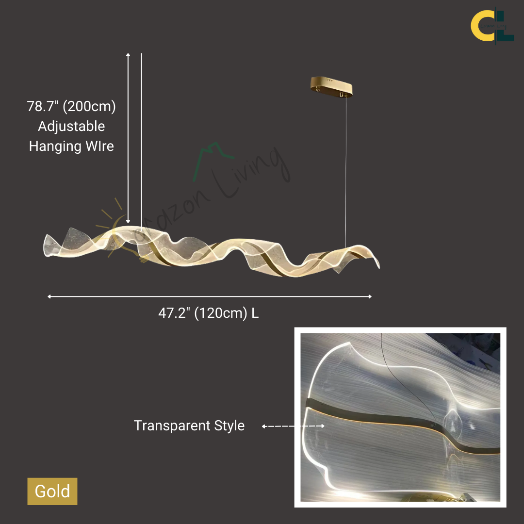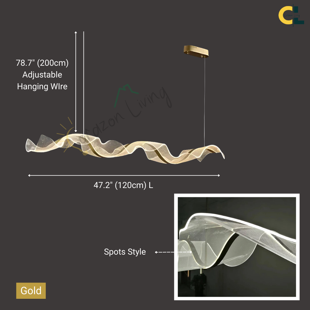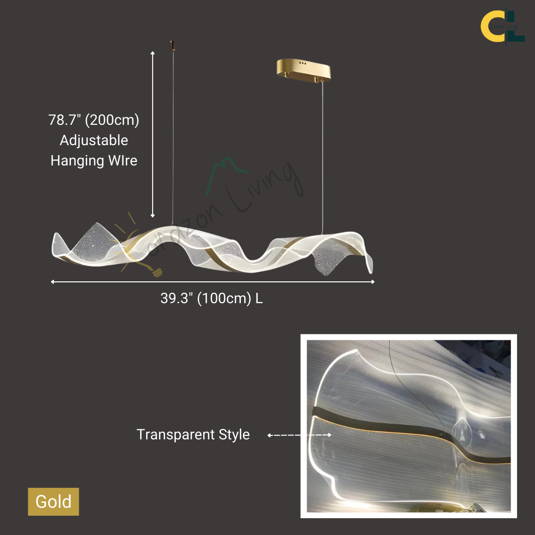 Add a sculptural statement to your space with this Mirenne modern acrylic ribbon LED chandelier, designed with a flowing wave form that blends elegance and innovation. The dynamic shape creates a striking visual impact while providing soft, energy-efficient illumination. Available in luxurious gold finishes, this hanging light fixture is ideal for dining rooms, kitchen islands, living rooms, and home bars. Crafted from durable acrylic and metal, this chandelier brings modern sophistication and functional lighting into contemporary interiors.