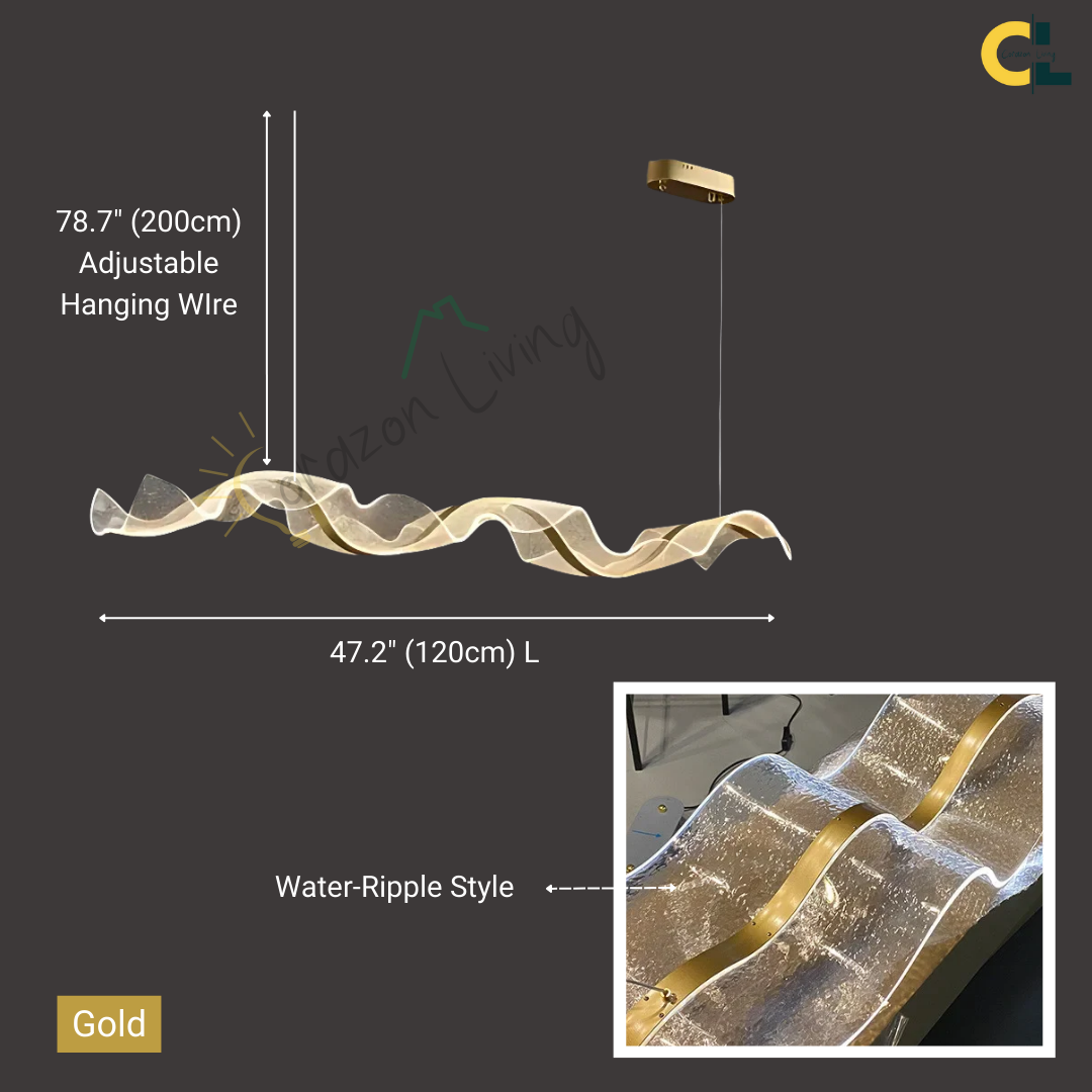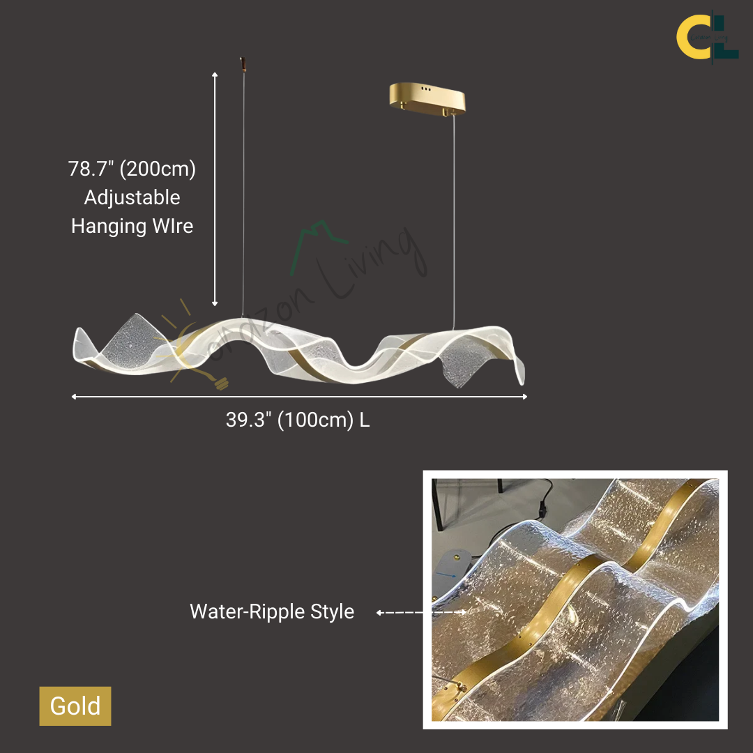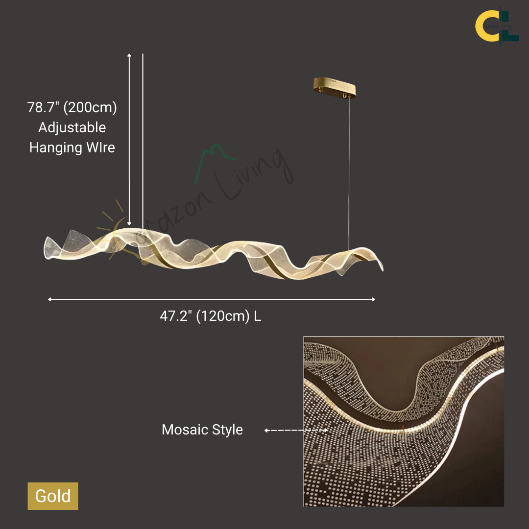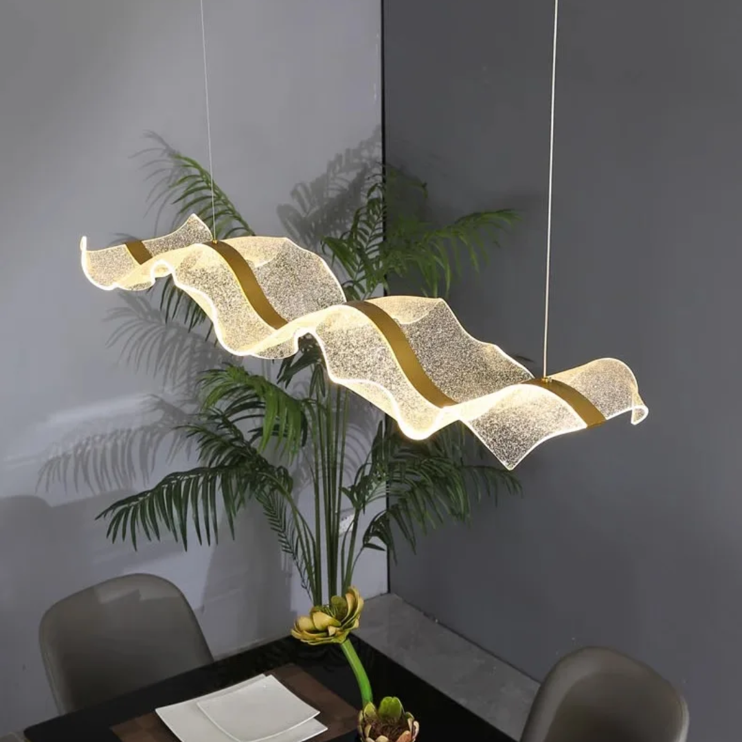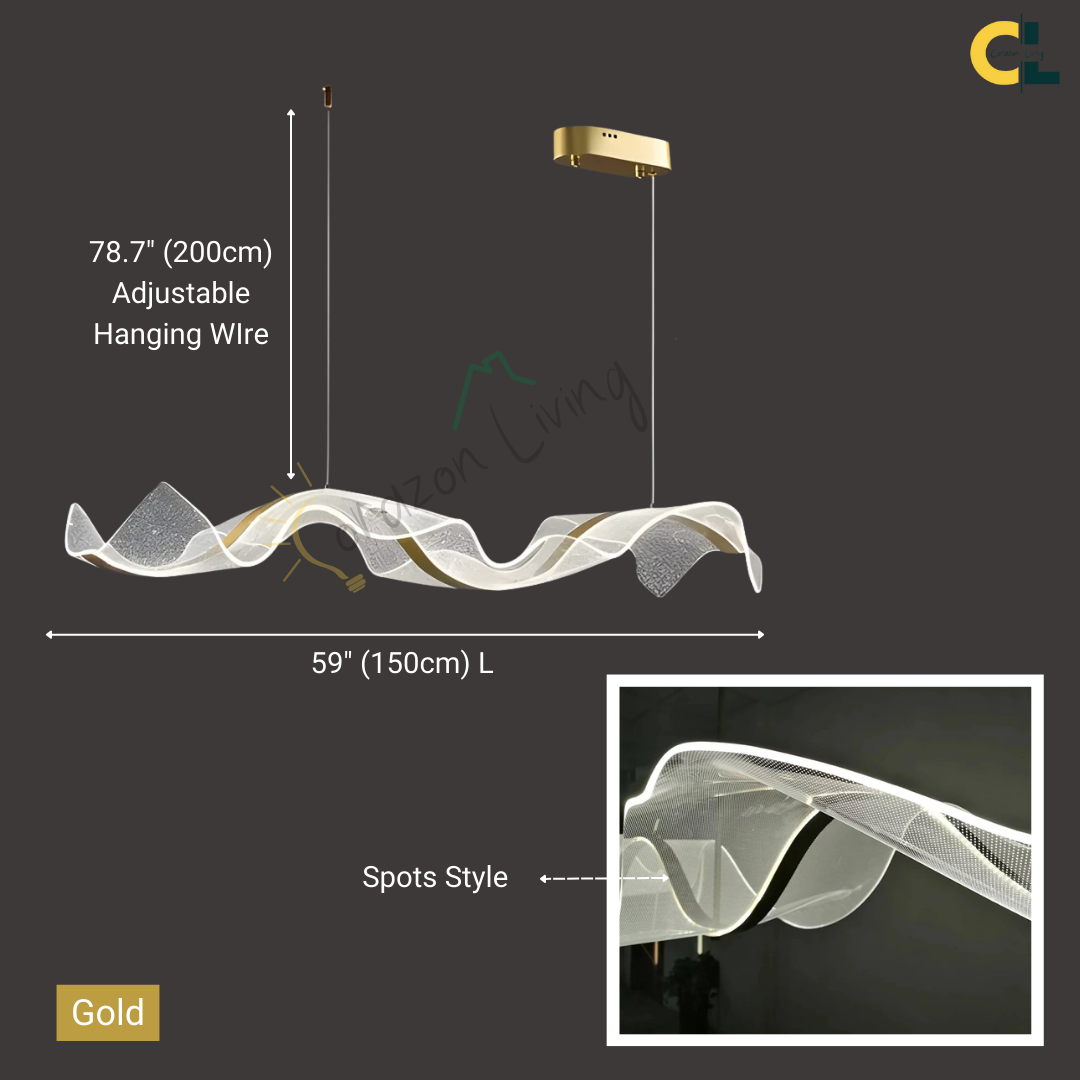 Add a sculptural statement to your space with this Mirenne modern acrylic ribbon LED chandelier, designed with a flowing wave form that blends elegance and innovation. The dynamic shape creates a striking visual impact while providing soft, energy-efficient illumination. Available in luxurious gold finishes, this hanging light fixture is ideal for dining rooms, kitchen islands, living rooms, and home bars. Crafted from durable acrylic and metal, this chandelier brings modern sophistication and functional lighting into contemporary interiors.