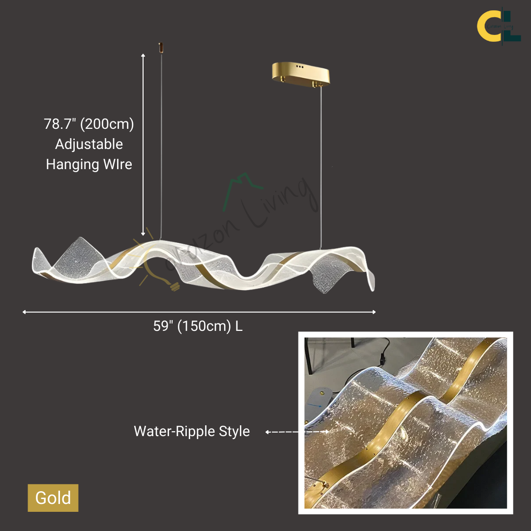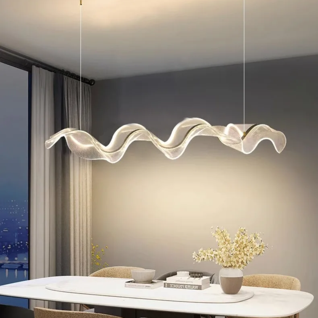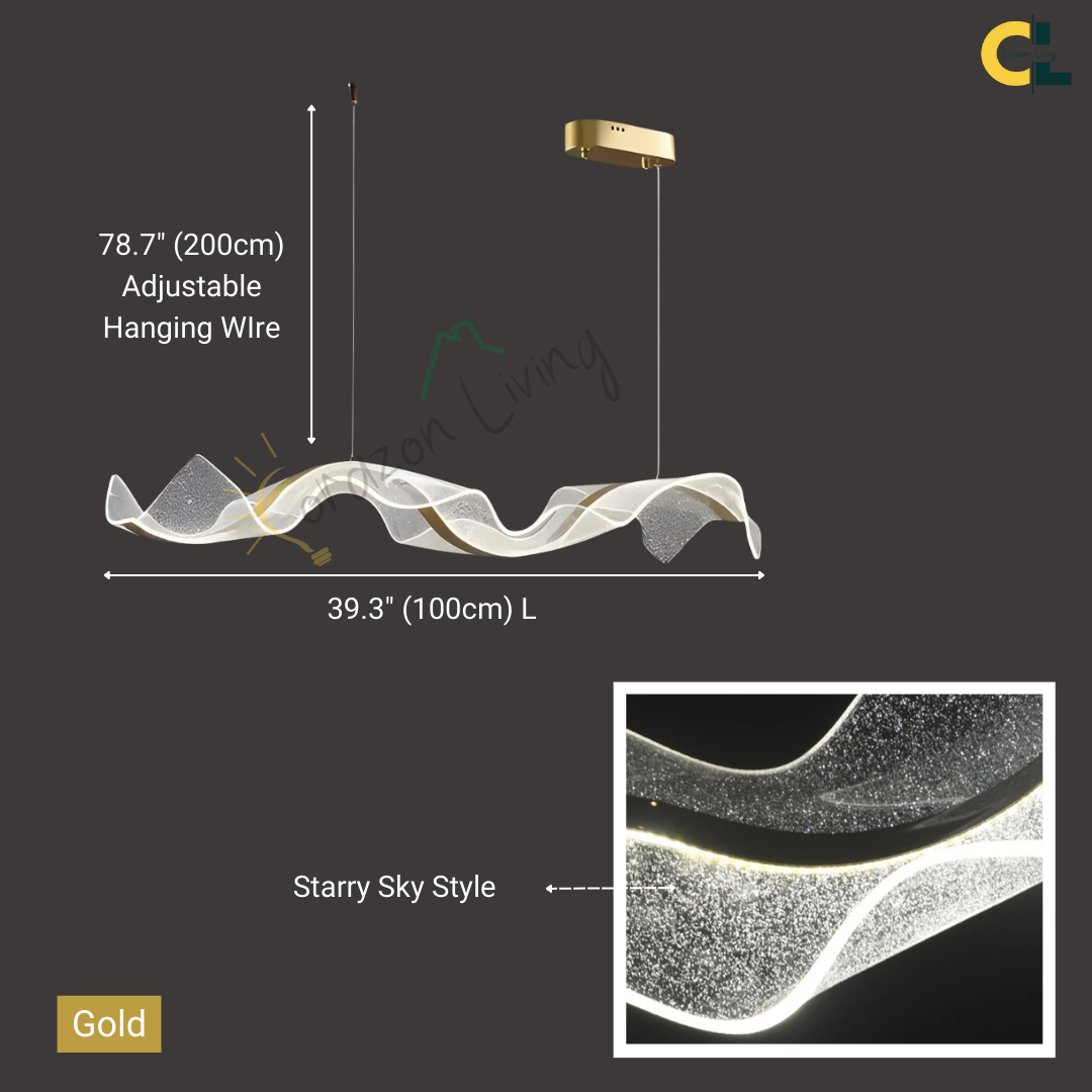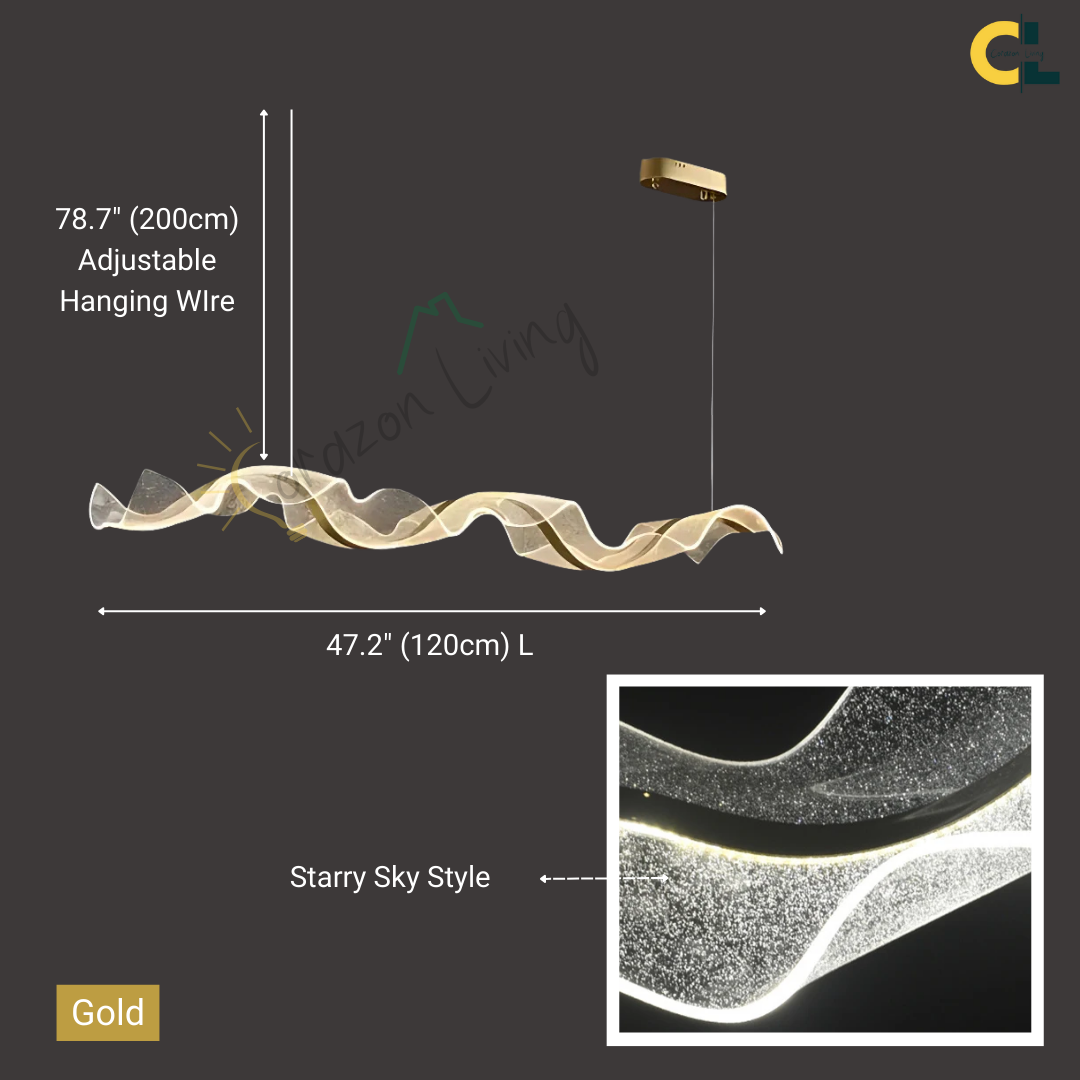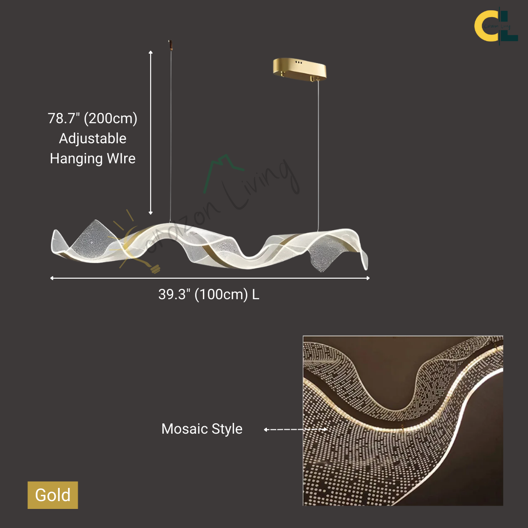 Add a sculptural statement to your space with this Mirenne modern acrylic ribbon LED chandelier, designed with a flowing wave form that blends elegance and innovation. The dynamic shape creates a striking visual impact while providing soft, energy-efficient illumination. Available in luxurious gold finishes, this hanging light fixture is ideal for dining rooms, kitchen islands, living rooms, and home bars. Crafted from durable acrylic and metal, this chandelier brings modern sophistication and functional lighting into contemporary interiors.
