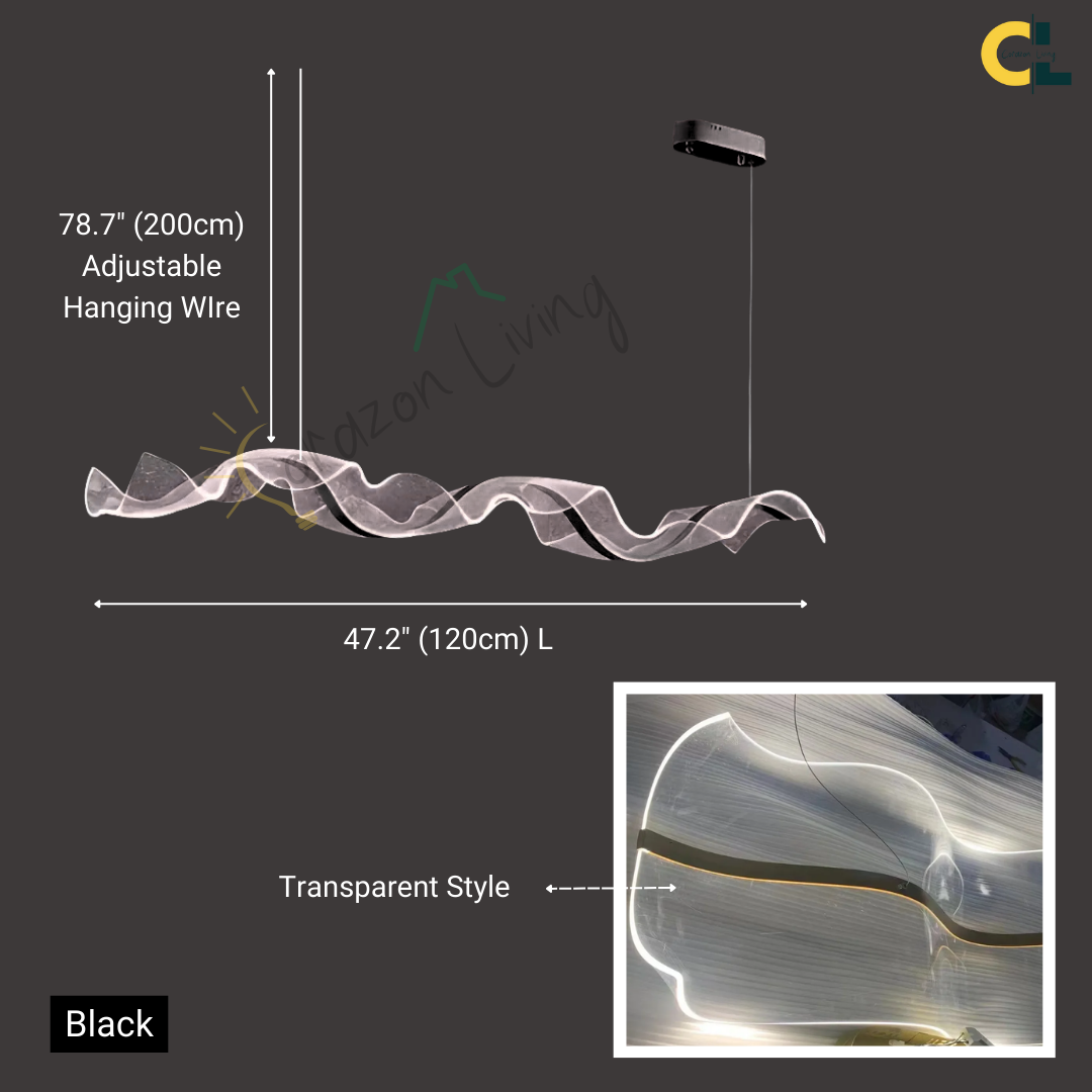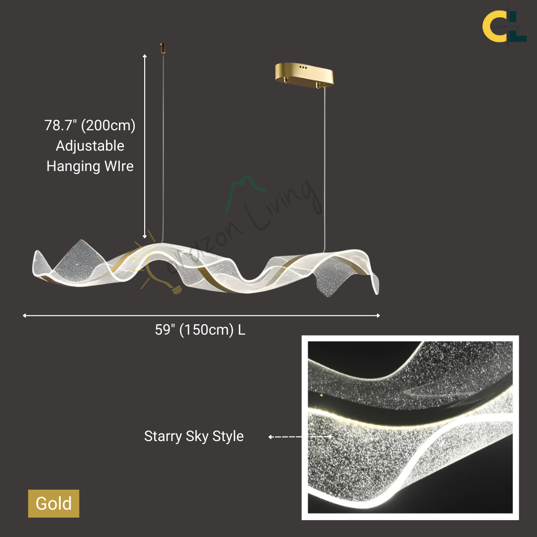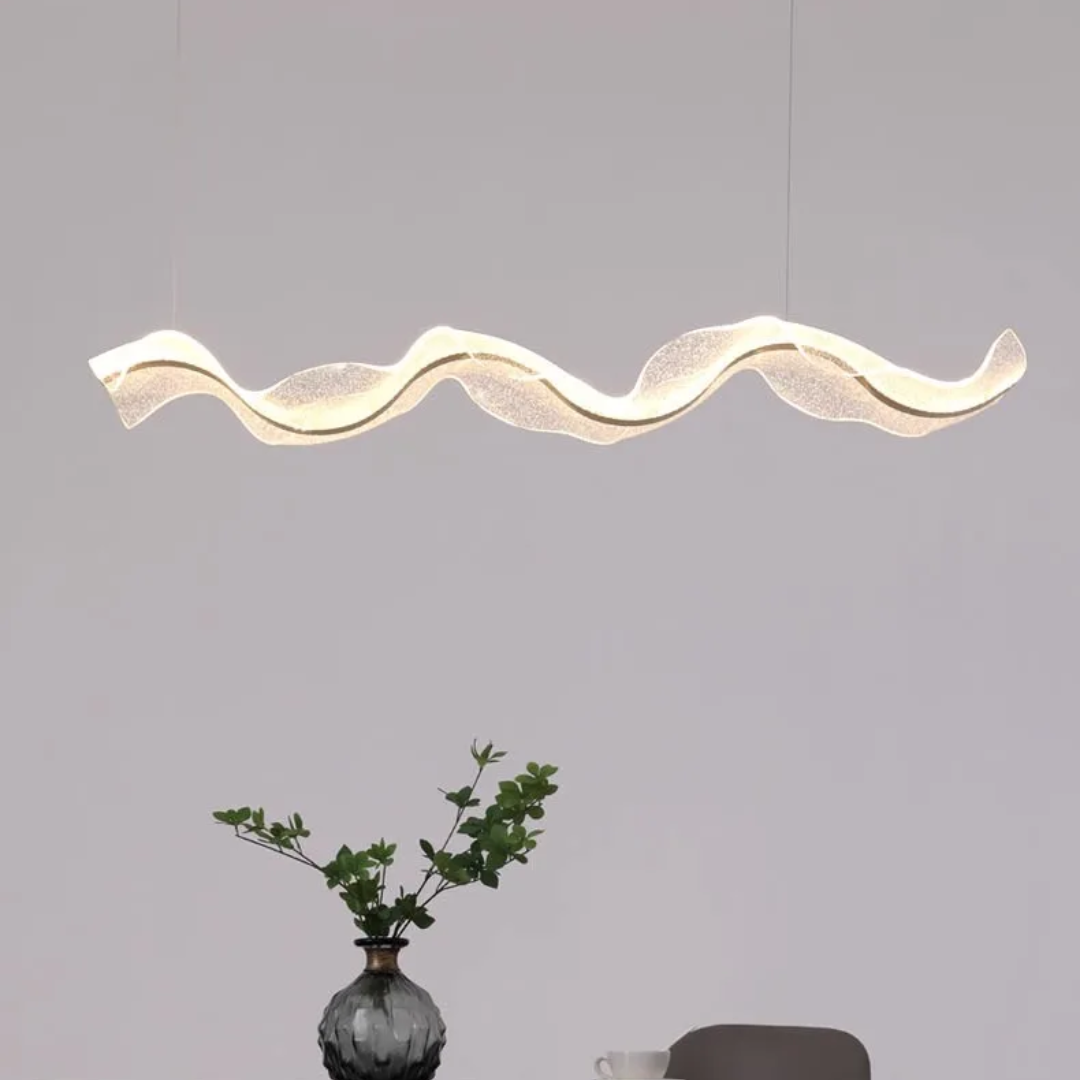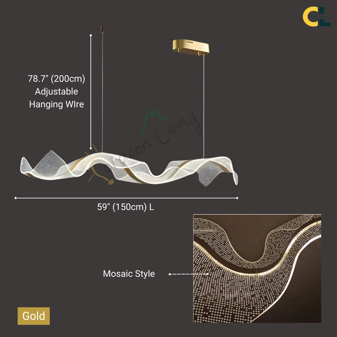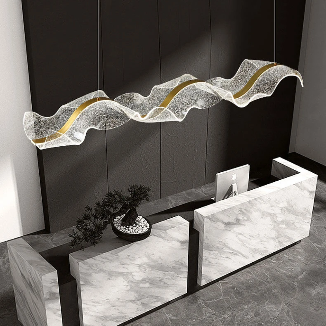 Add a sculptural statement to your space with this Mirenne modern acrylic ribbon LED chandelier, designed with a flowing wave form that blends elegance and innovation. The dynamic shape creates a striking visual impact while providing soft, energy-efficient illumination. Available in luxurious gold finishes, this hanging light fixture is ideal for dining rooms, kitchen islands, living rooms, and home bars. Crafted from durable acrylic and metal, this chandelier brings modern sophistication and functional lighting into contemporary interiors.