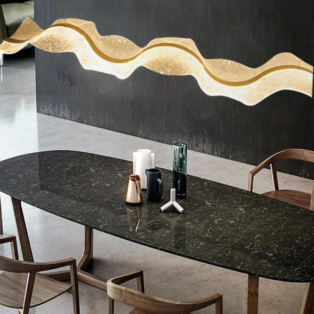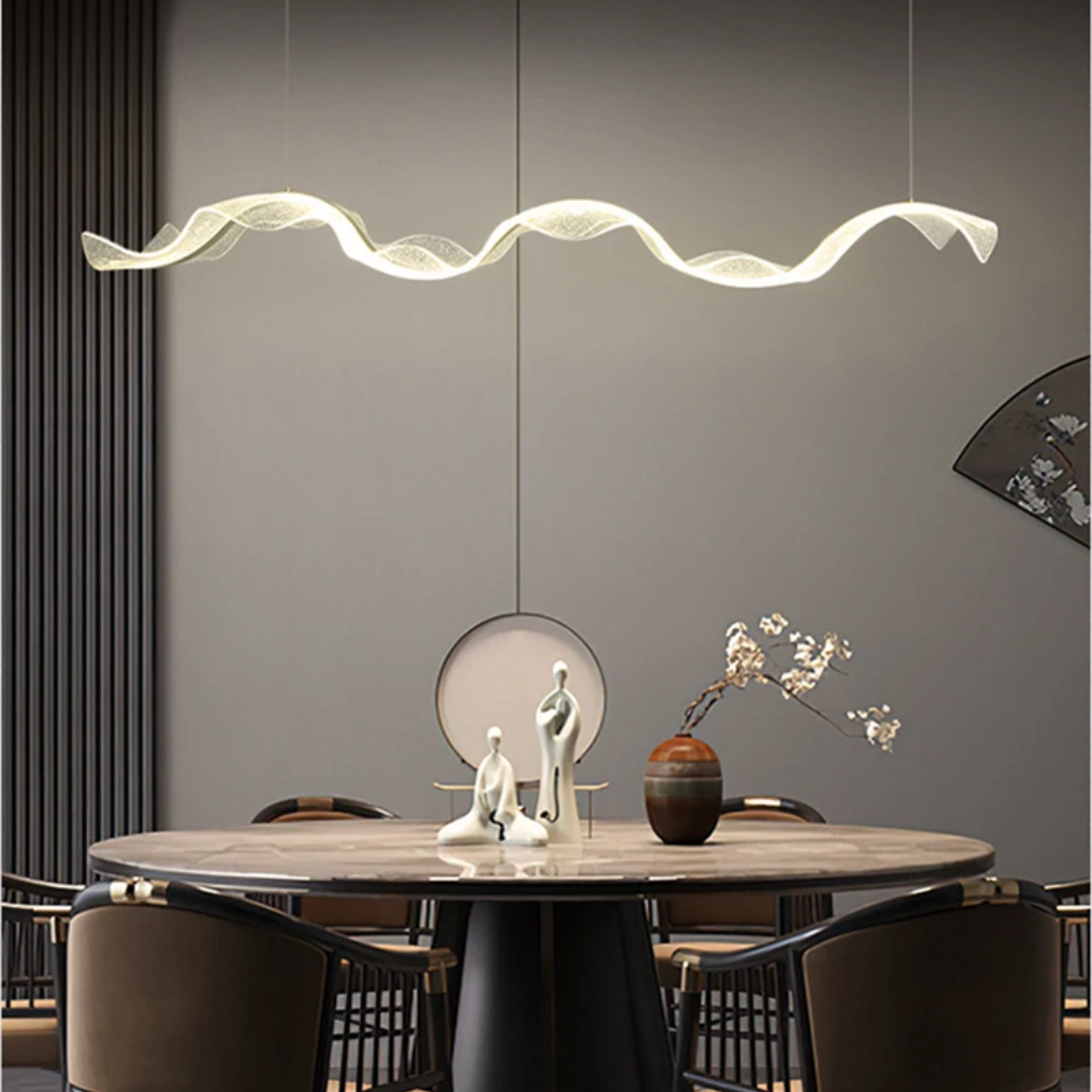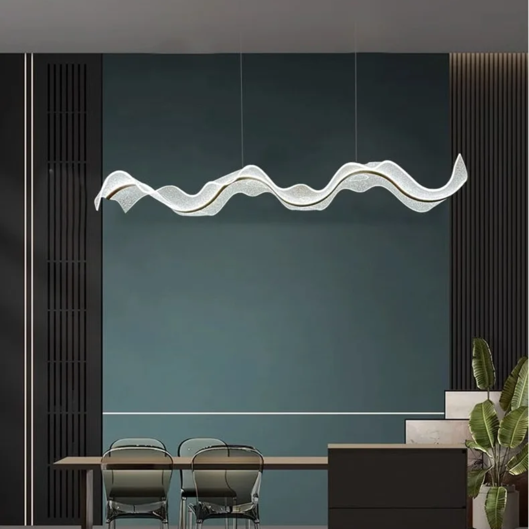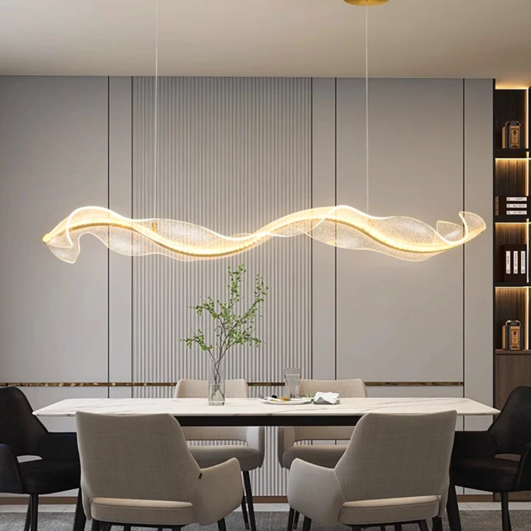 Sculptural ribbon-shaped LED chandelier with flowing wave design for elegant and energy-efficient ambient lighting in modern interiors