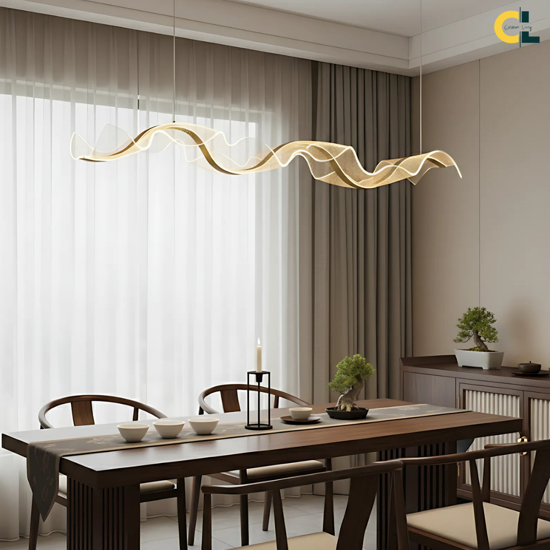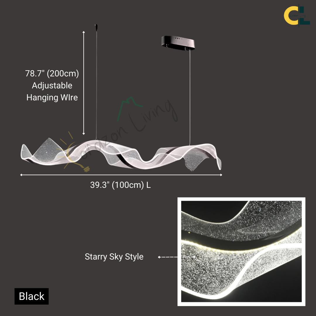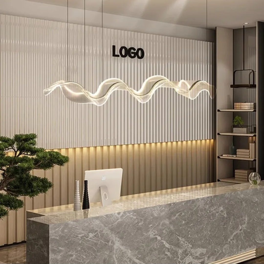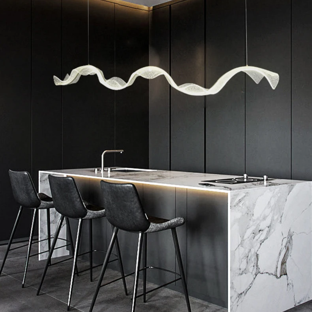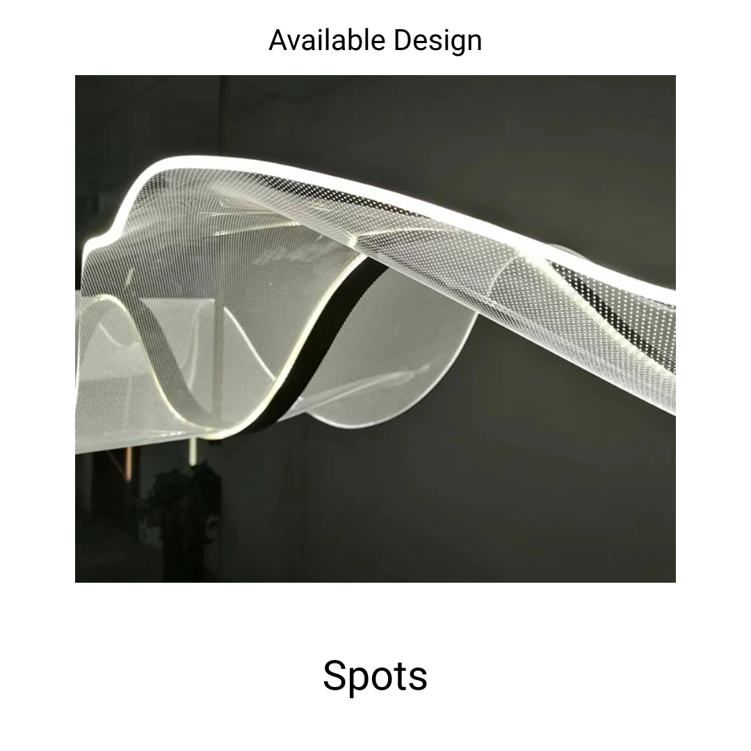 Sculptural ribbon-shaped LED chandelier with flowing wave design for elegant and energy-efficient ambient lighting in modern interiors
