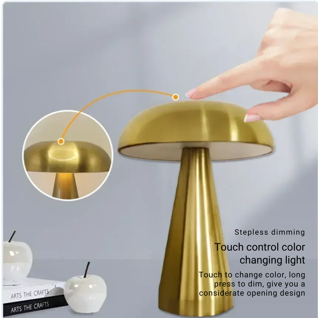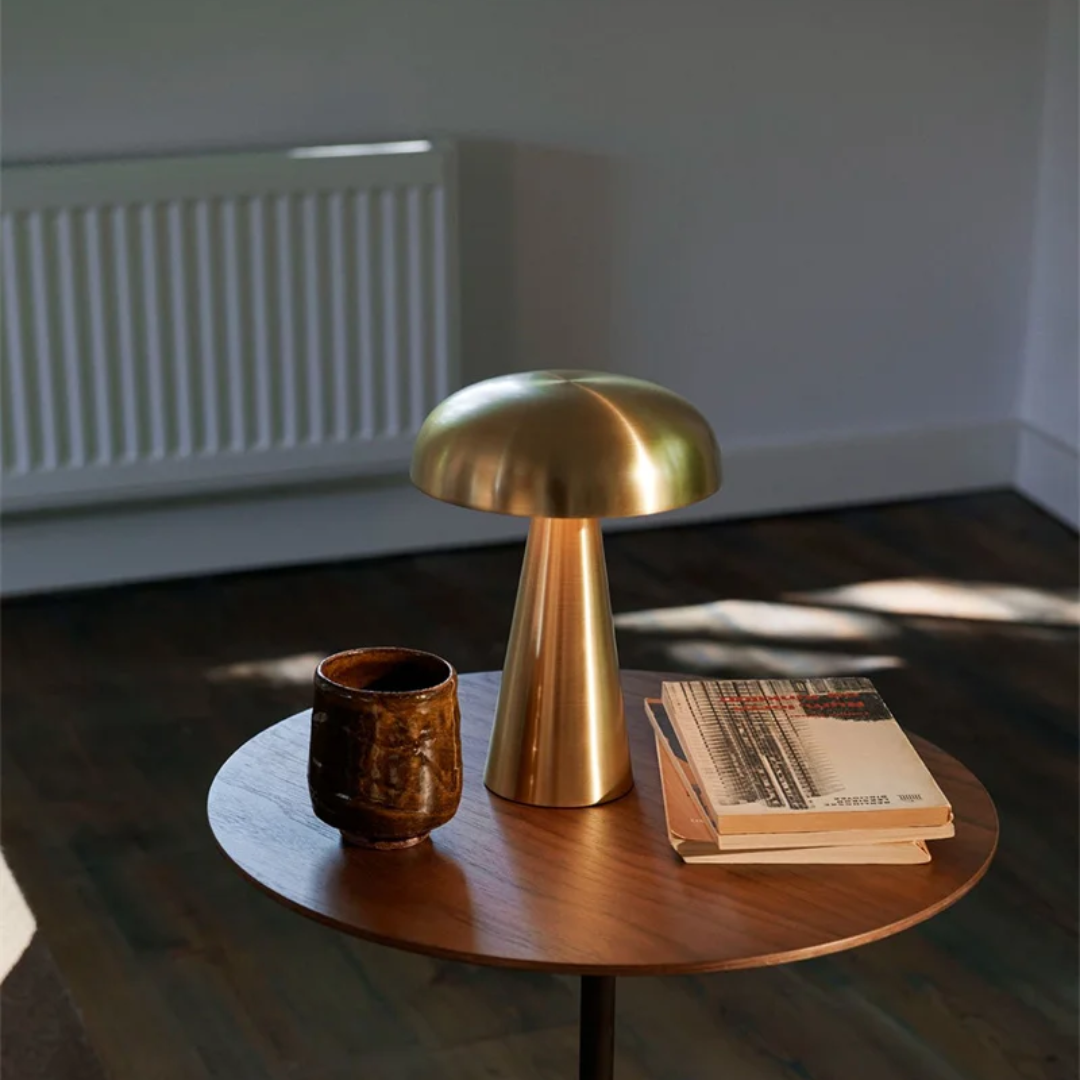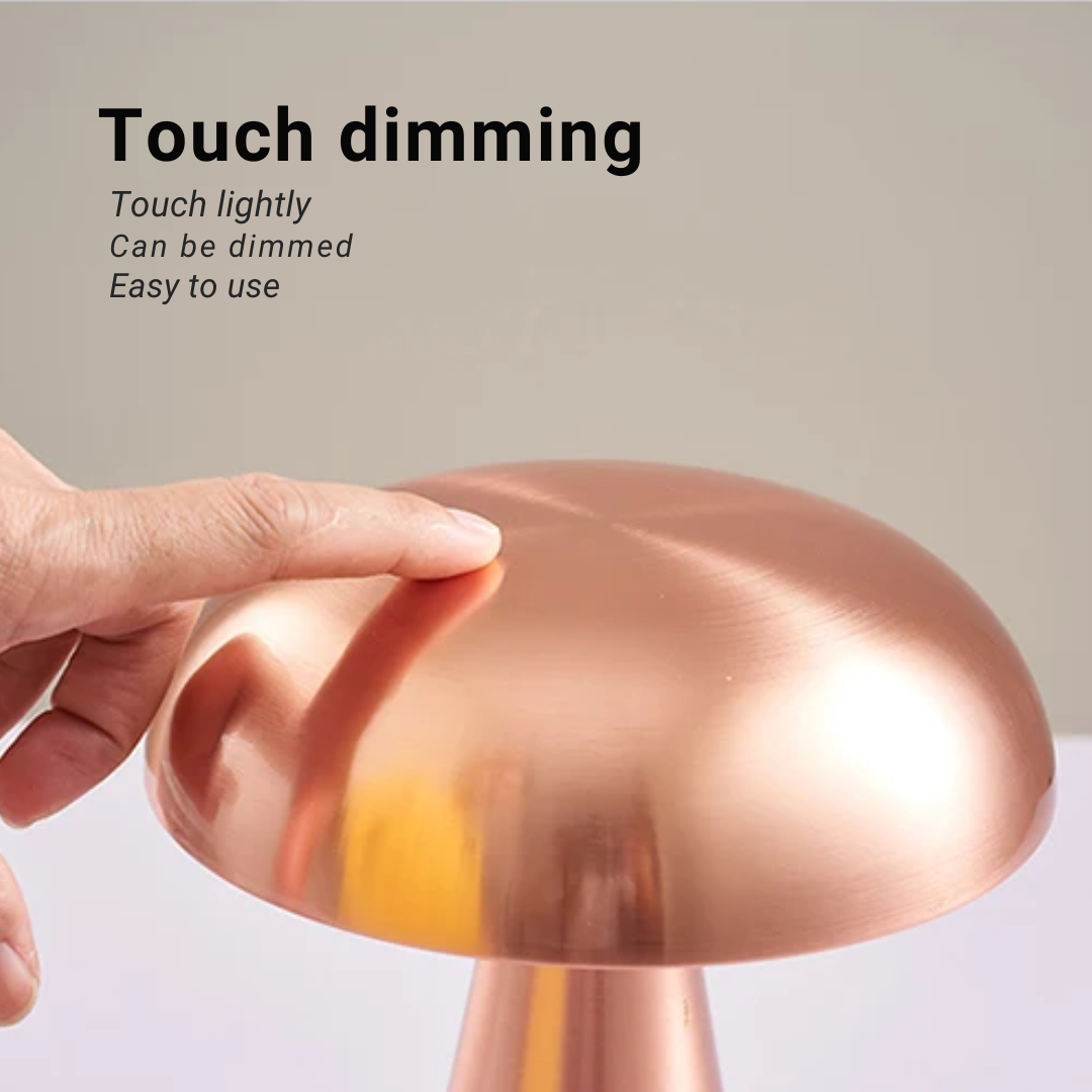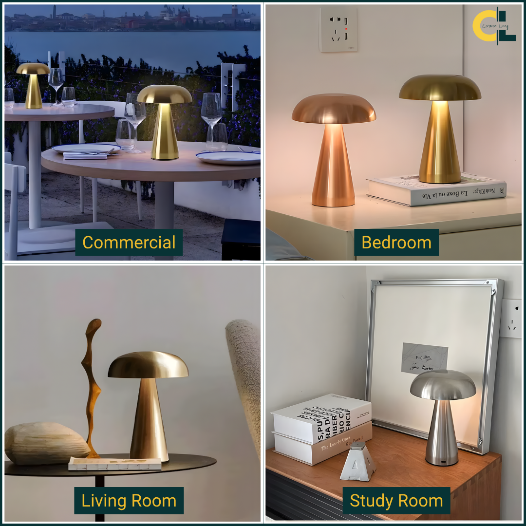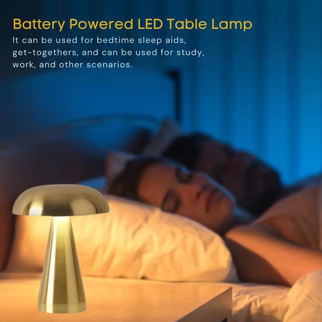 Crafted from durable iron in a matte gold or copper finish, Morrel’s mushroom-inspired silhouette adds a subtle statement without overwhelming your space. Dual LED bulbs create balanced, glare-free light—making it an ideal bedroom lamp for reading, relaxing, and everyday comfort. Recharge it easily with the magnetic USB cable or charging tray, and enjoy long-lasting battery use that keeps your nightstand clean and uncluttered.