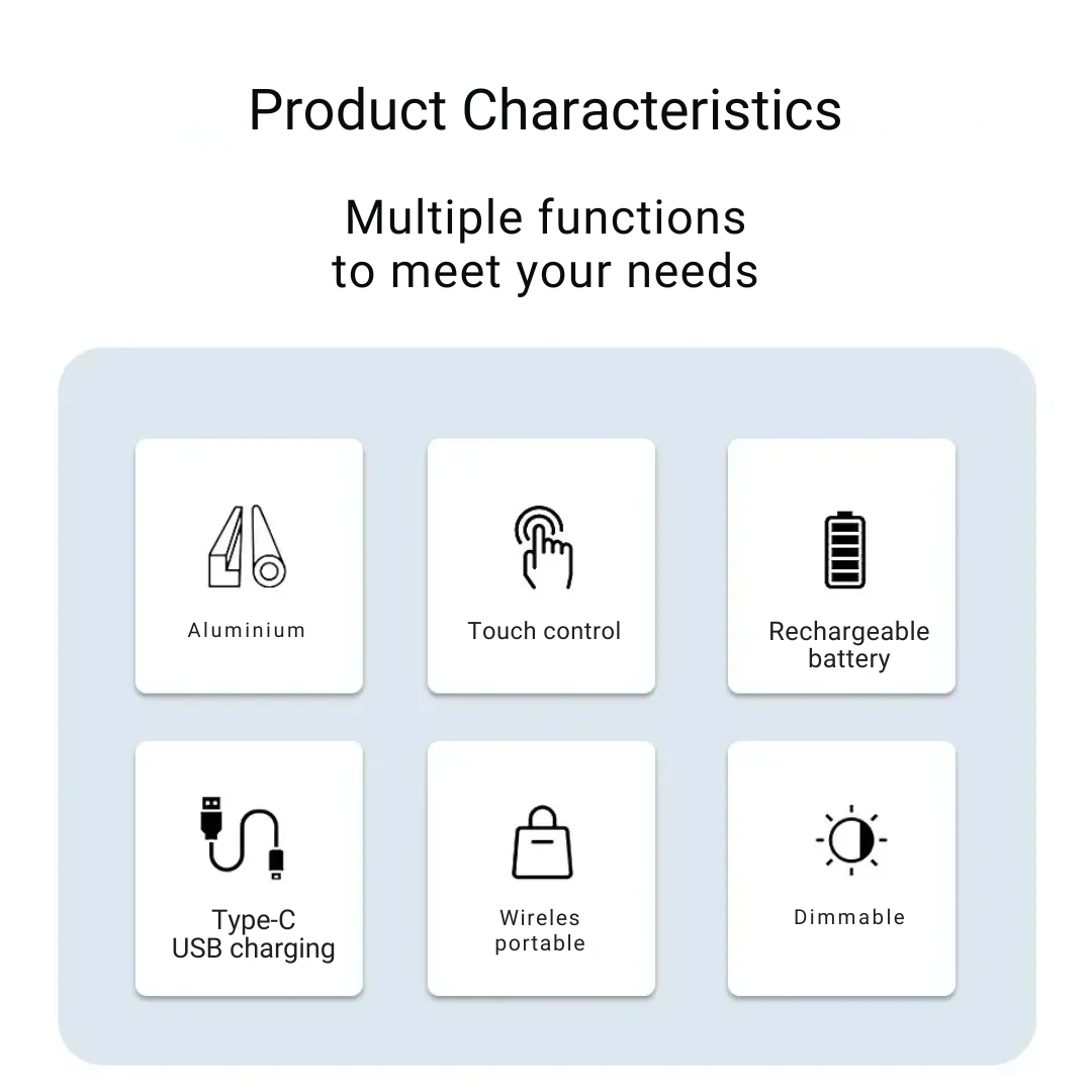 Touch control: tap anywhere for 3 dimming levels (40%, 70%, 100%) or off