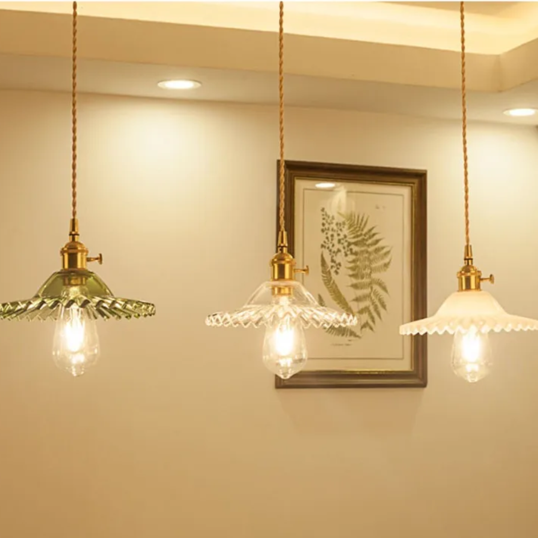 Meet Nimira, a vintage-inspired glass pendant designed to warm a space with quiet character. Each shade features a distinct silhouette, paired with a brass-finished holder that adds an antique touch without feeling heavy. The result is a soft, nostalgic glow that elevates interiors with calm, understated style.