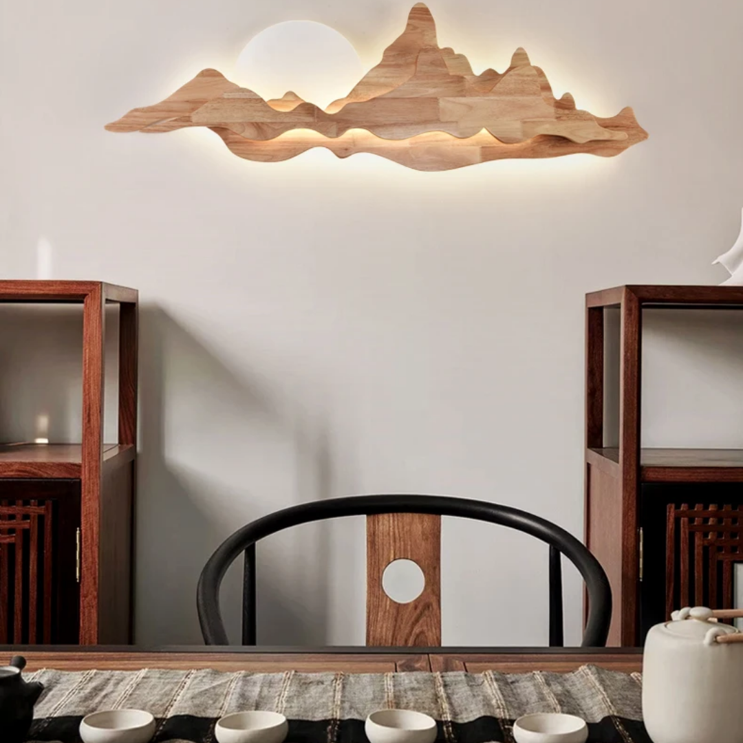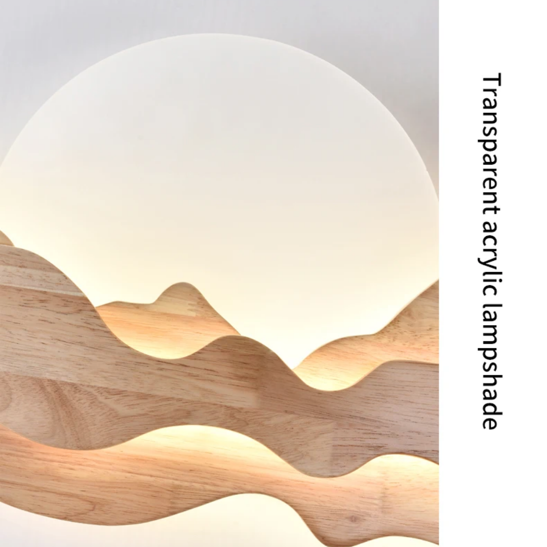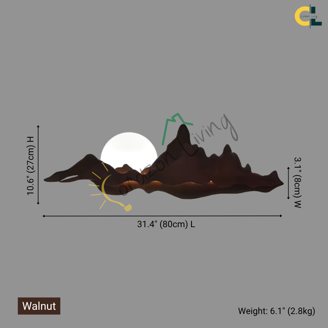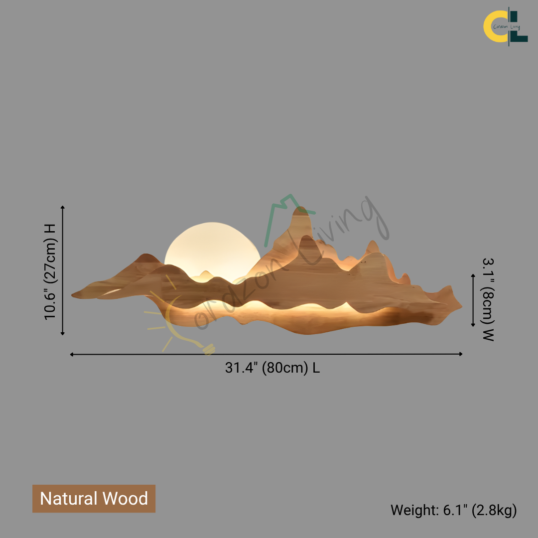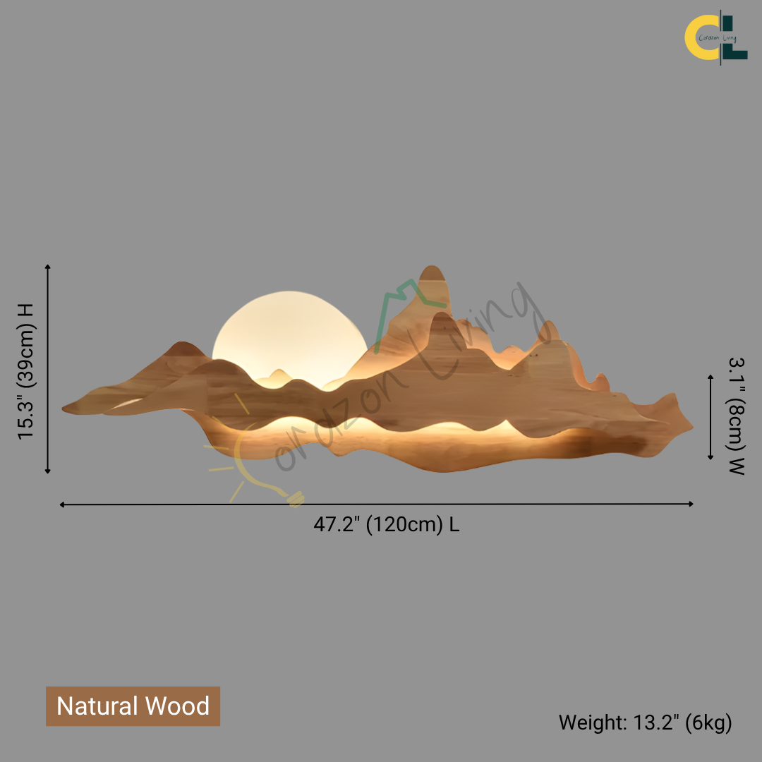 Nur brings the tranquility of nature into your home with its sculpted wooden silhouette, reminiscent of rolling mountains beneath a gentle sun. The integrated LED backlight casts a soft, ambient glow that enhances the layered woodgrain, creating a serene landscape effect on your wall. Perfect for dining rooms, tea spaces, or minimalist interiors, Nur is both a lighting fixture and a piece of art—blending warmth, elegance, and a touch of the outdoors into any space.