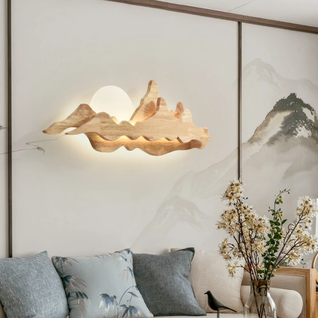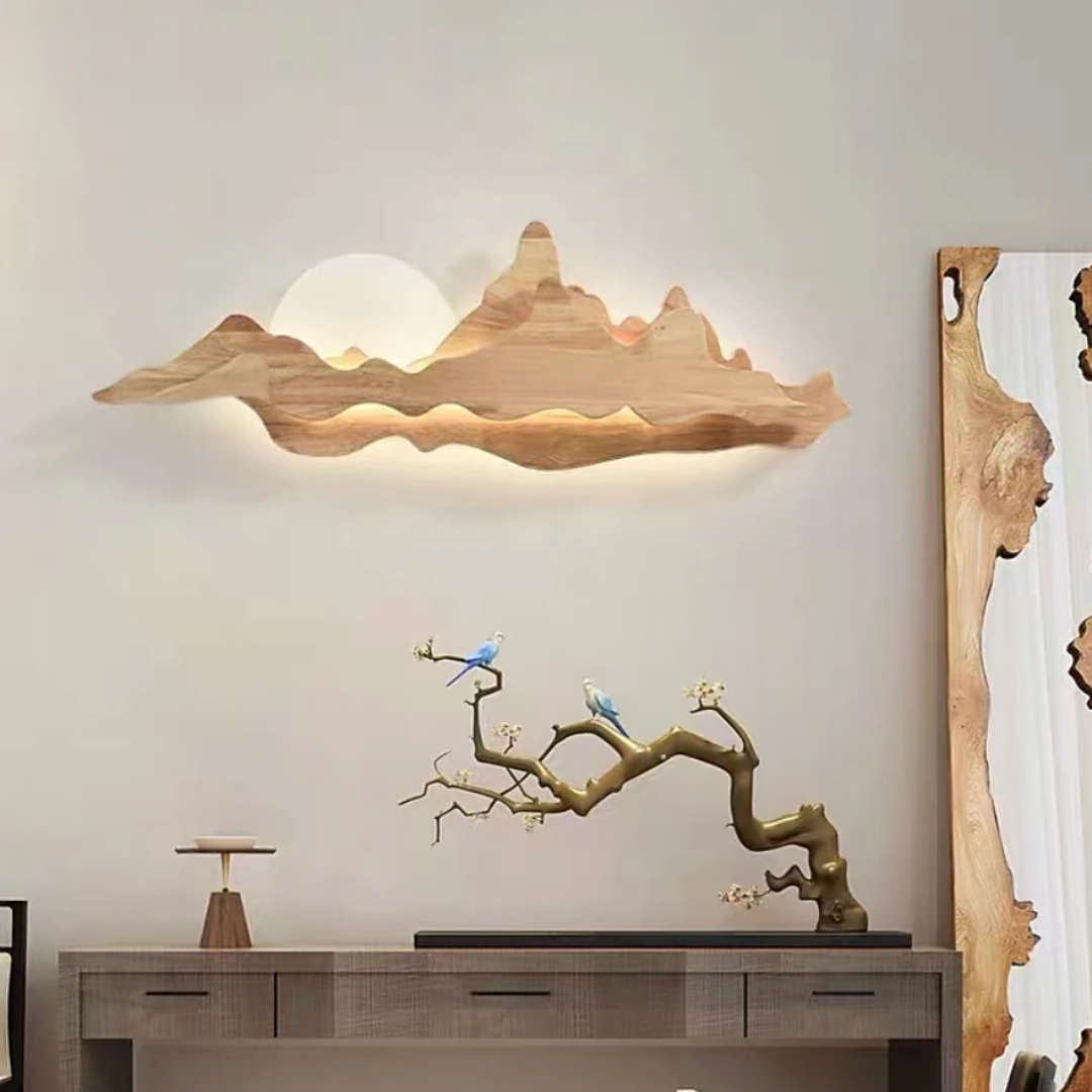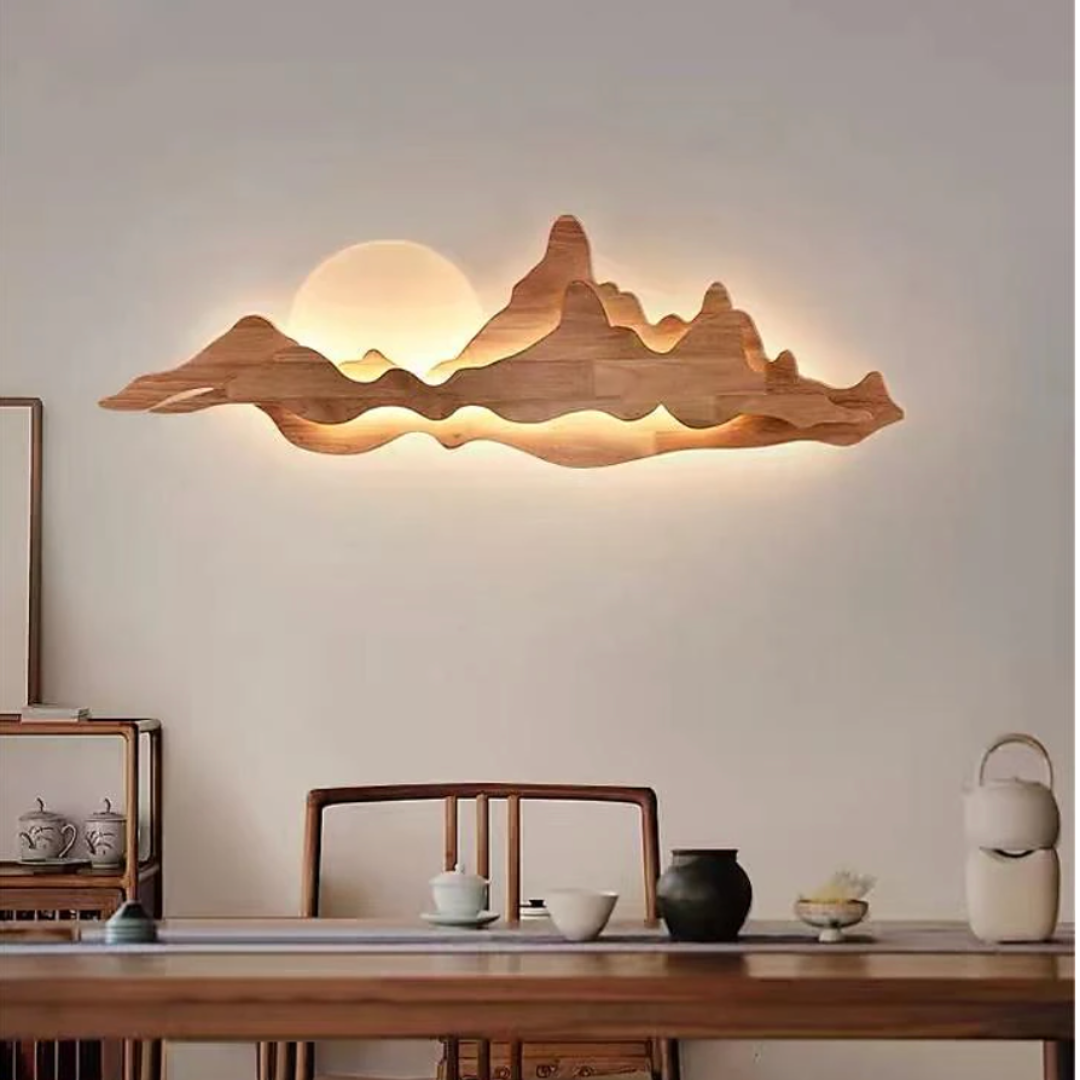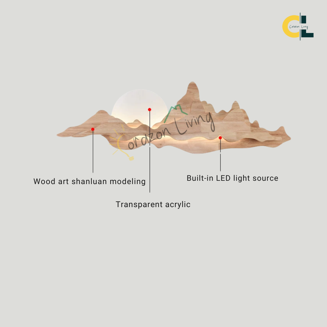 Nur brings the tranquility of nature into your home with its sculpted wooden silhouette, reminiscent of rolling mountains beneath a gentle sun. The integrated LED backlight casts a soft, ambient glow that enhances the layered woodgrain, creating a serene landscape effect on your wall. Perfect for dining rooms, tea spaces, or minimalist interiors, Nur is both a lighting fixture and a piece of art—blending warmth, elegance, and a touch of the outdoors into any space.