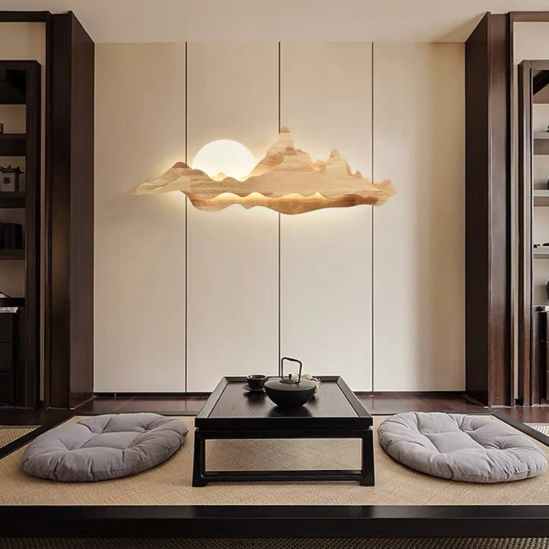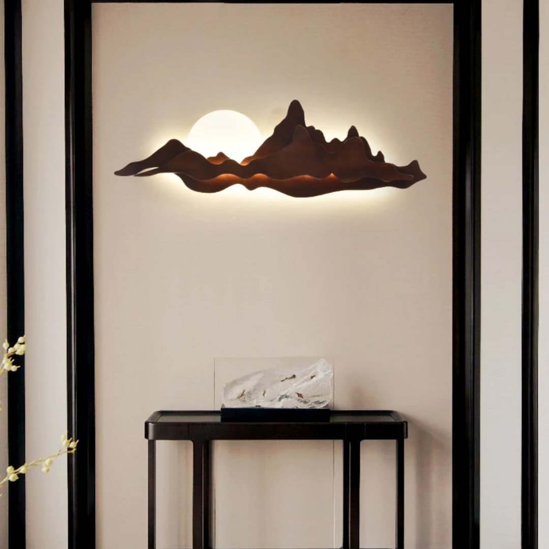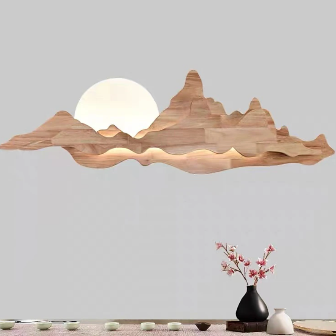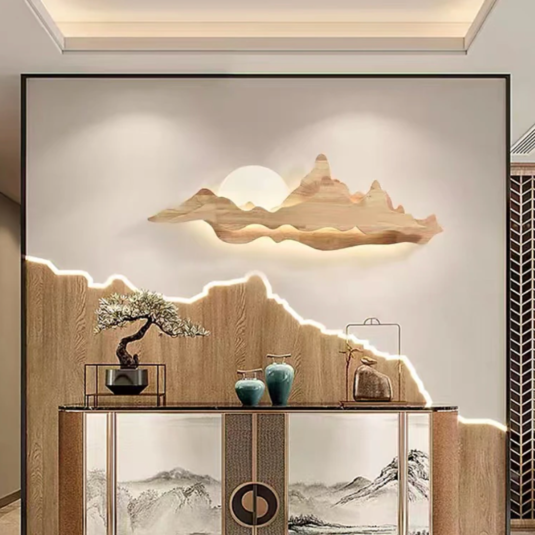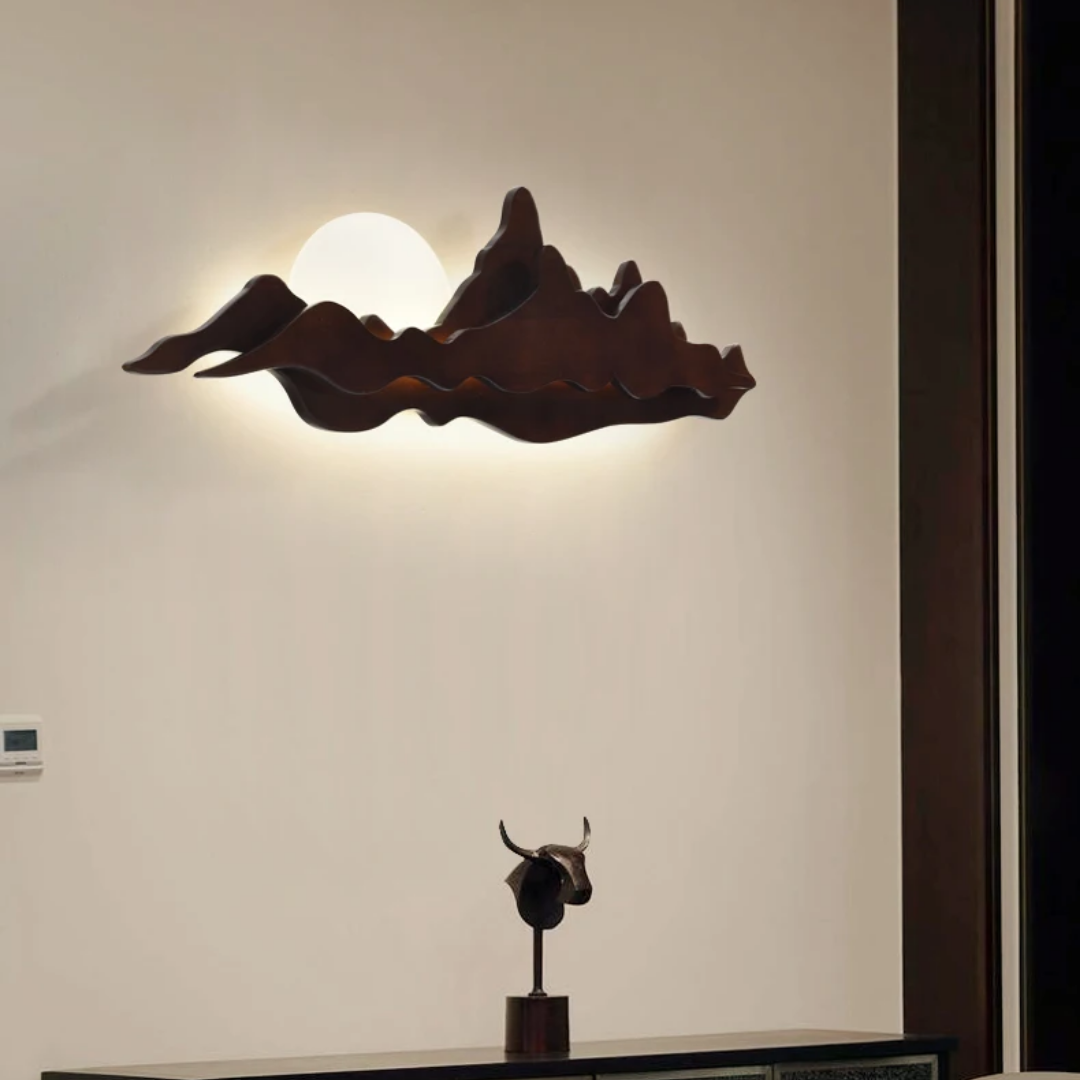 Nur brings the tranquility of nature into your home with its sculpted wooden silhouette, reminiscent of rolling mountains beneath a gentle sun. The integrated LED backlight casts a soft, ambient glow that enhances the layered woodgrain, creating a serene landscape effect on your wall. Perfect for dining rooms, tea spaces, or minimalist interiors, Nur is both a lighting fixture and a piece of art—blending warmth, elegance, and a touch of the outdoors into any space.