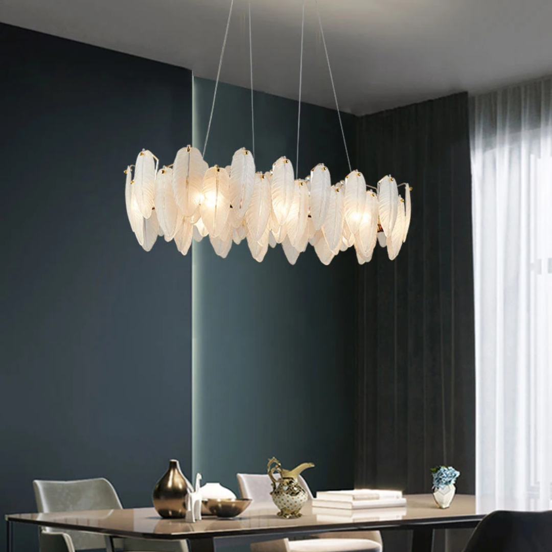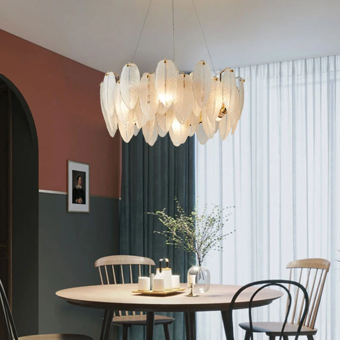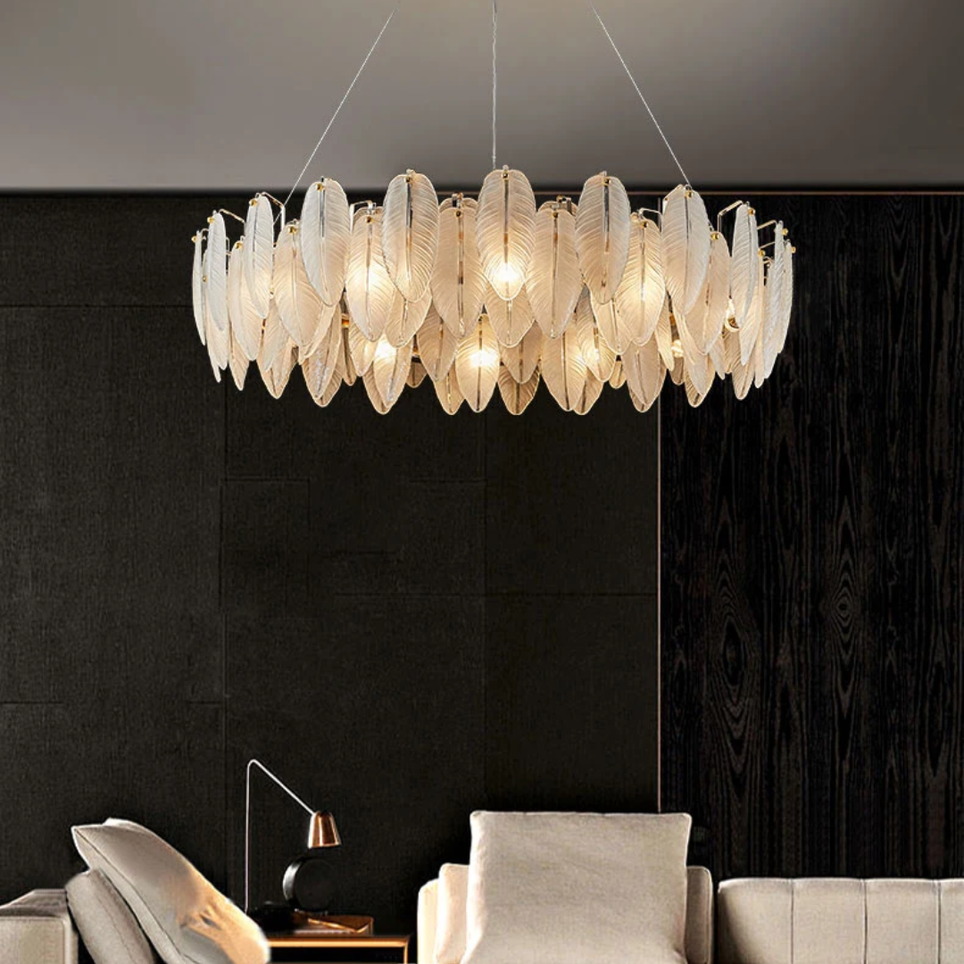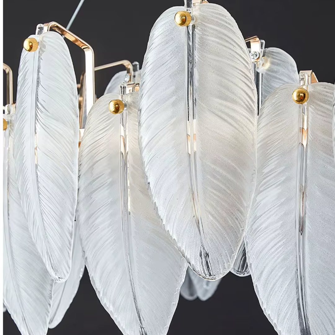 The Odette Modern Feather Crystal Chandelier brings a touch of refined artistry to your home. Featuring hand-crafted glass feather panels arranged in a circular and rectangular design, this chandelier diffuses a warm, inviting glow while adding sophistication to any modern interior.